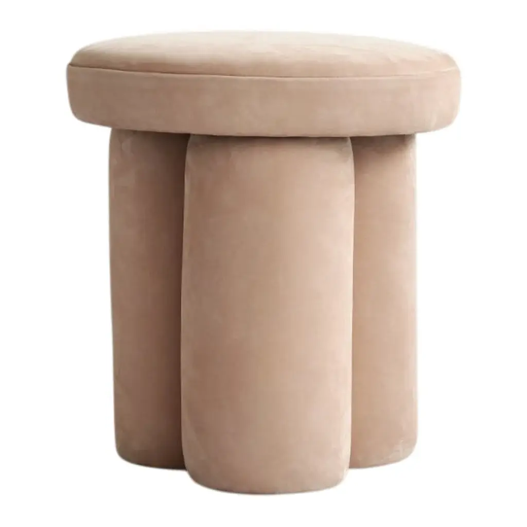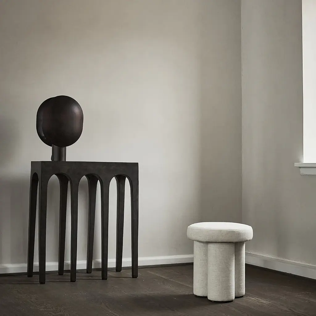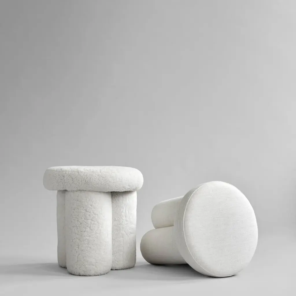 A quirky and contemporary addition to any interior setting and family alike, the Big Foot Stool is inviting and friendly in its sculptural, organic shape. Consisting of three circular legs and a soft, round seat, all surfaces are upholstered with natural sheepskin in a soothing off-white colour or in a chalk-colored cotton and linen fabric. Designed by Kristian Sofus Hansen & Tommy Hyldahl.