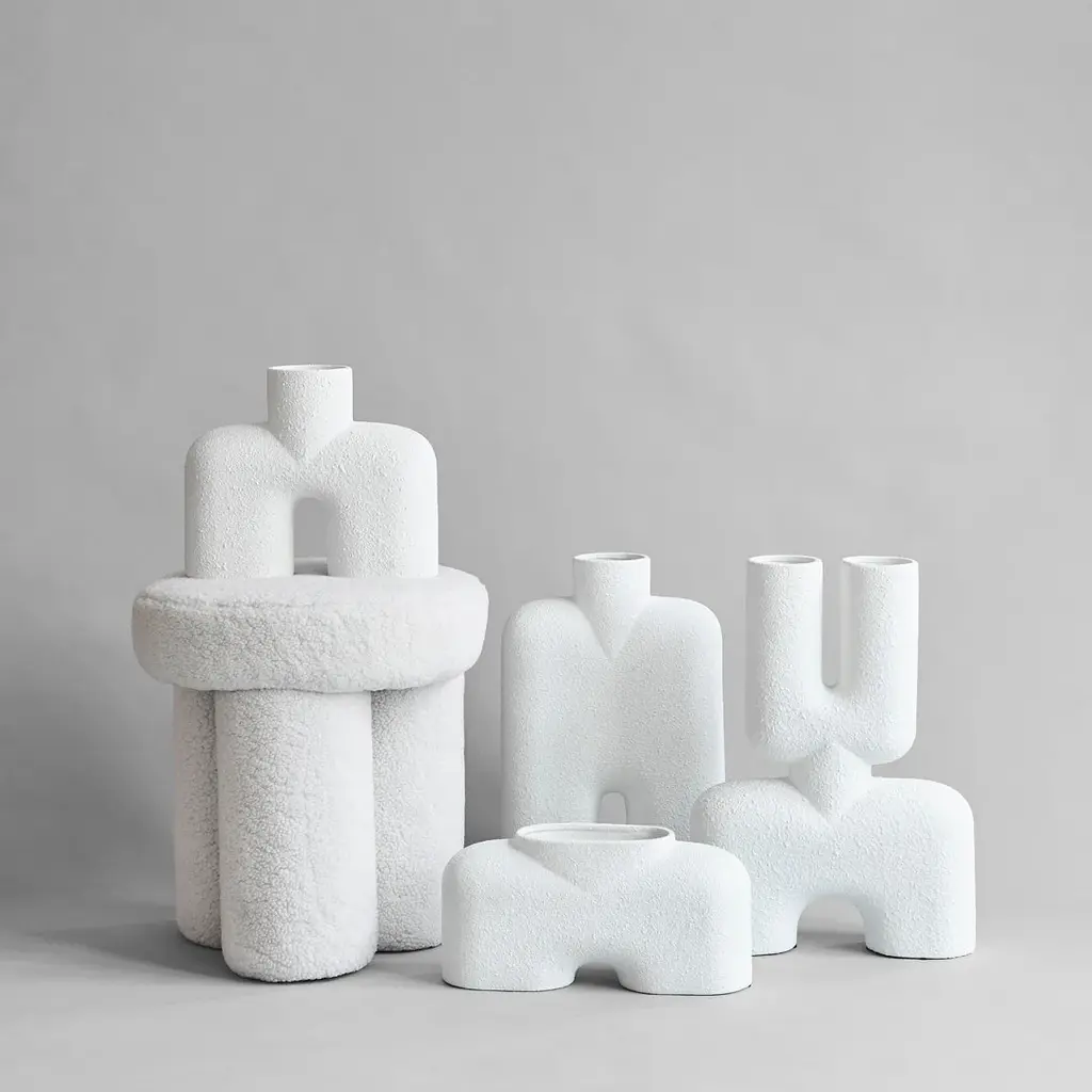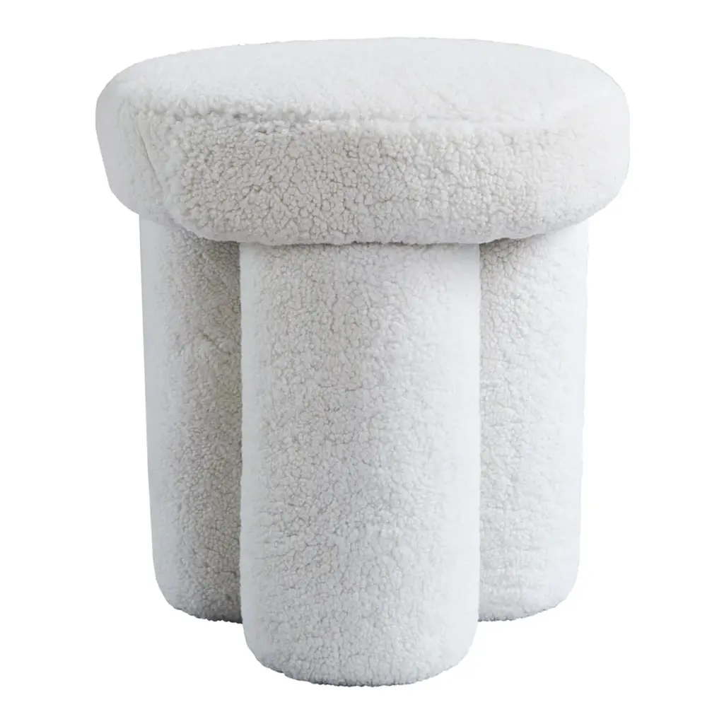 A quirky and contemporary addition to any interior setting and family alike, the Big Foot Stool is inviting and friendly in its sculptural, organic shape. Consisting of three circular legs and a soft, round seat, all surfaces are upholstered with natural sheepskin in a soothing off-white colour or in a chalk-colored cotton and linen fabric. Designed by Kristian Sofus Hansen & Tommy Hyldahl.