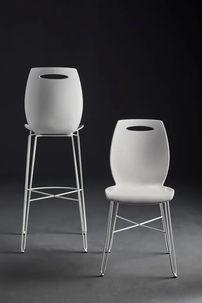 Bip Iron.ss is a stool with structure in steel rod and seat in composite technopolymer or covered in fabric or eco-leather.Contemporary appearance and more marked lines thanks to the original design of the steel rod structure. Bip Iron.ss stool offers completeness to the proposal of the homonymous chair.