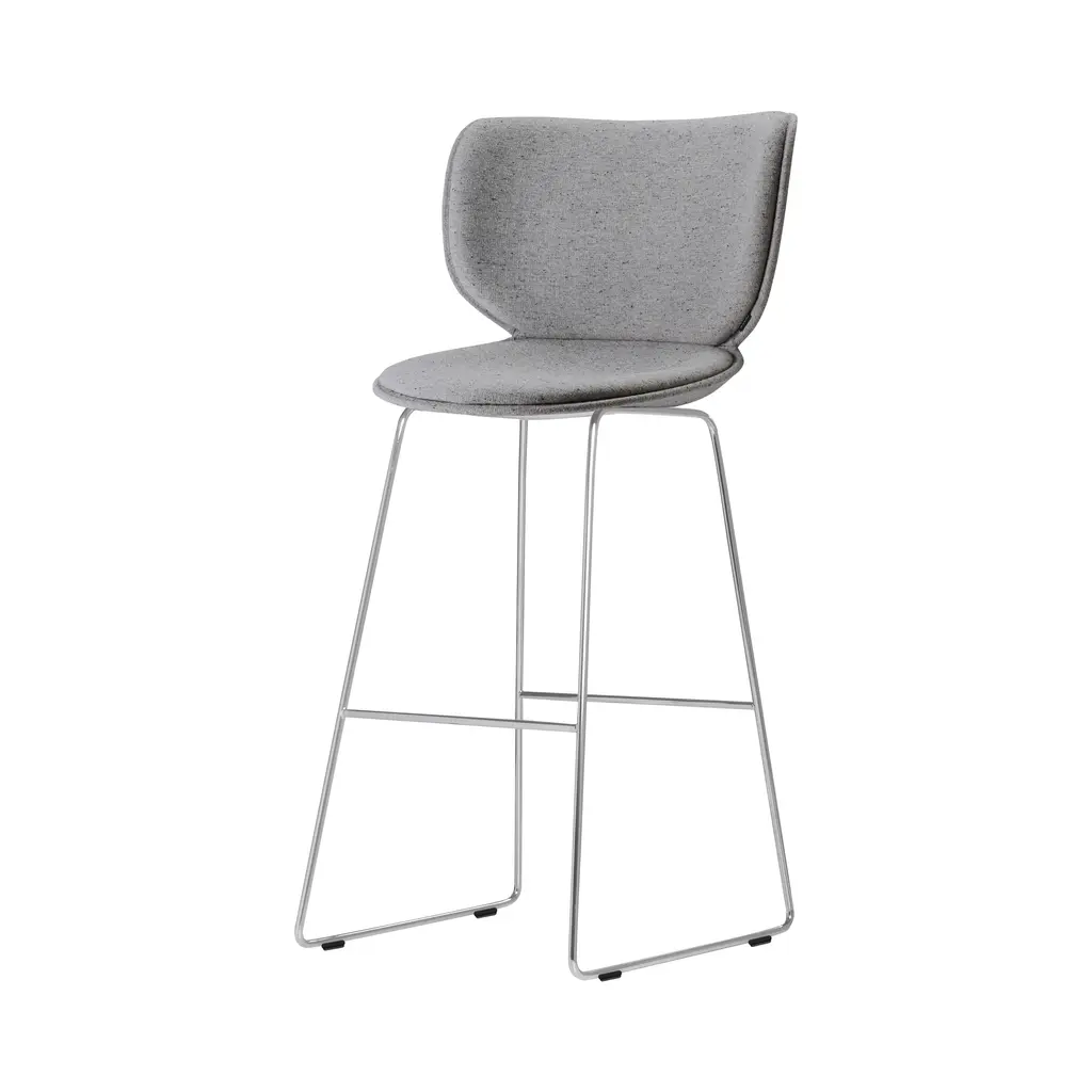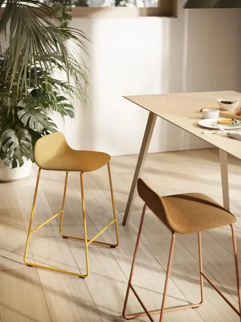 Sled base stool with backrest. Padding and upholstery in fabric.Traditional and modern styles are perfectly balanced in the serene and discreet design of this chair which blends Treku features into warm and intimate settings. Its simple design combines a wooden top, solid wood and upholstery to obtain distinct finishings which, together with different wooden and metal bases, make it suitable for a variety of settings and uses, whether in the home or office.