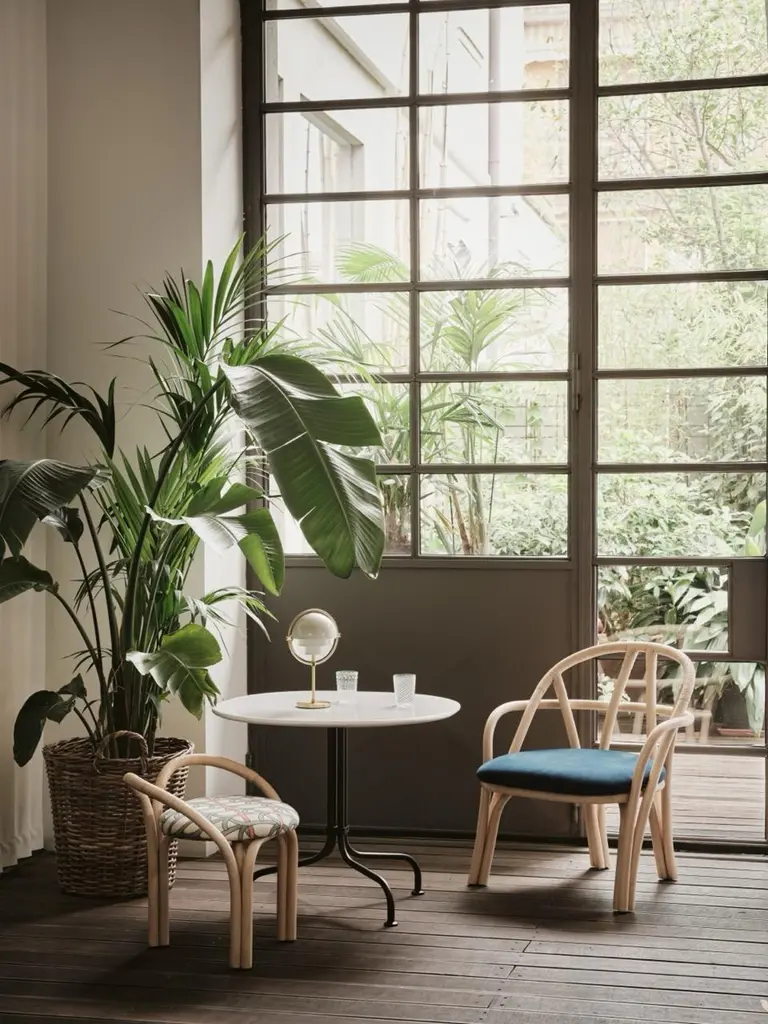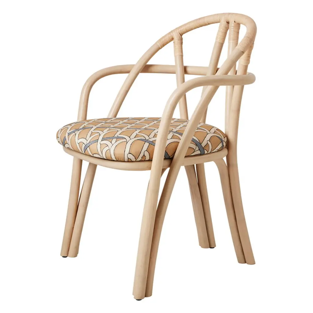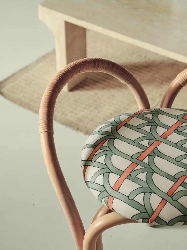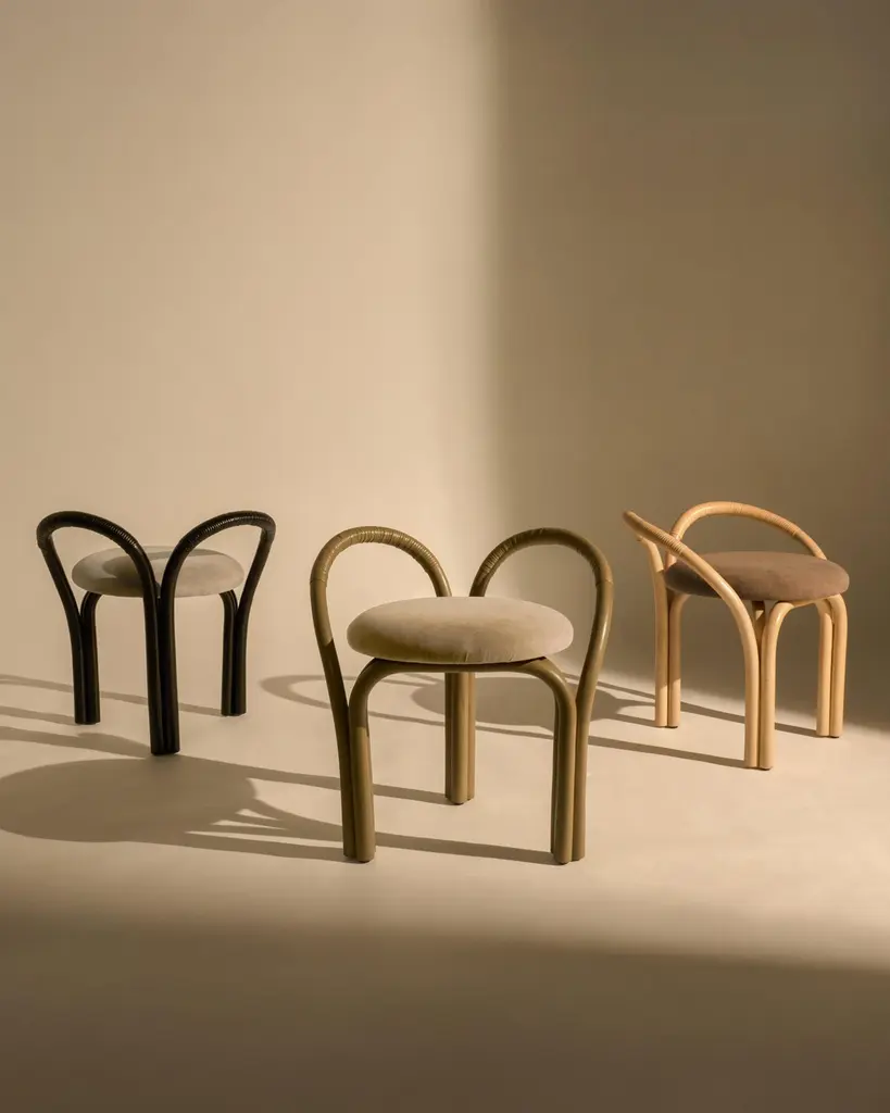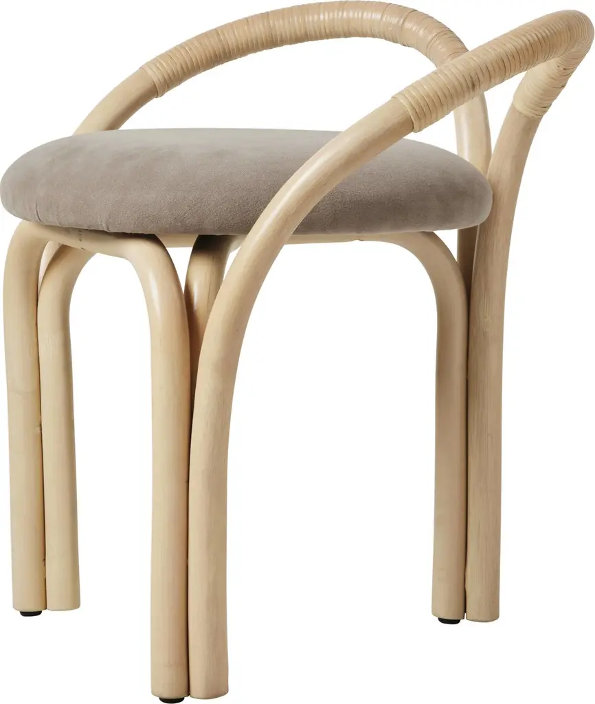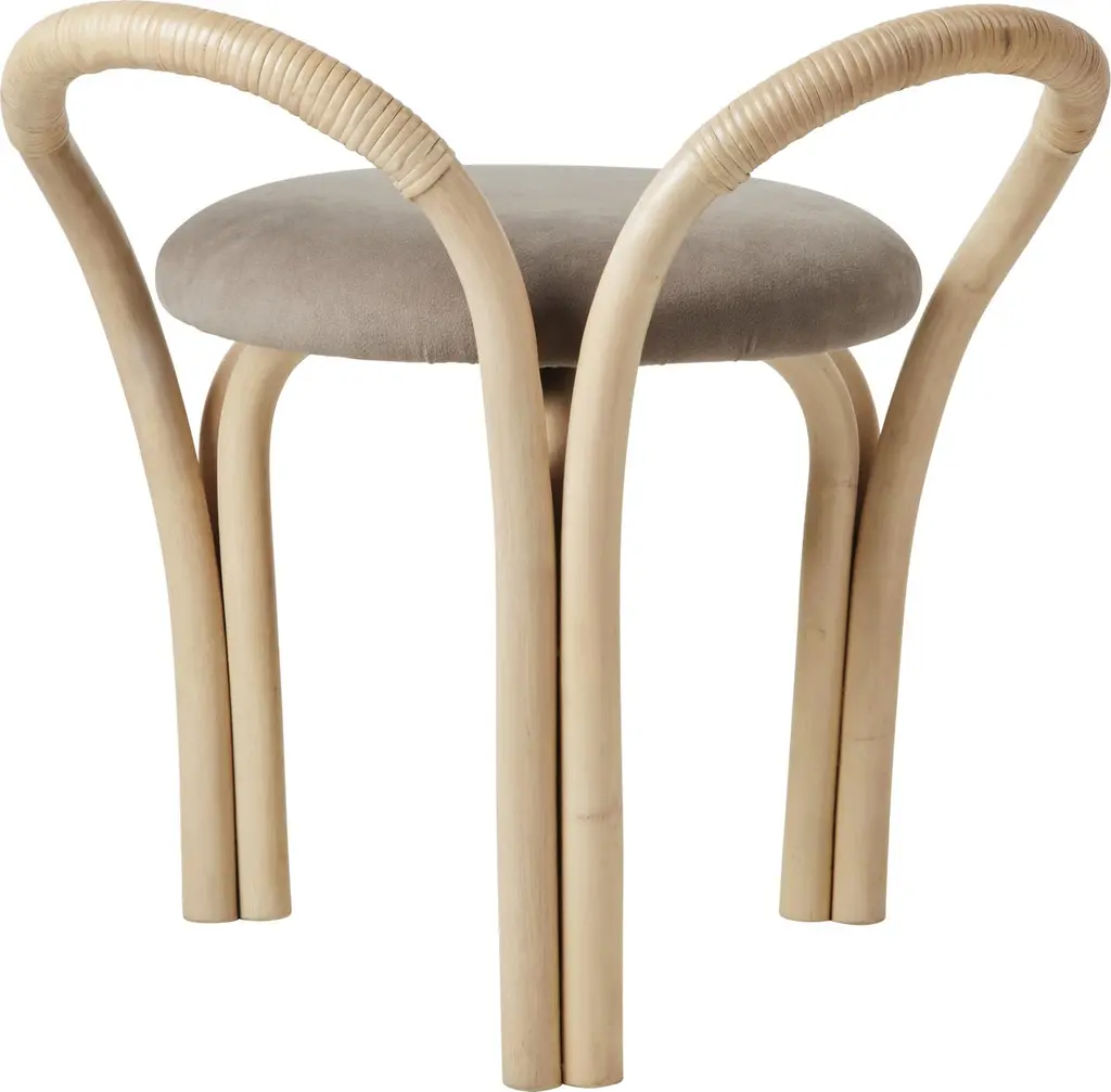 'Bistra' Stool in Natural Lacquered Rattan by AMDL Circle for GUBIExecuted in steam-bent rattan the 'Bistra' lounge chair is part of a versatile seating collection that blends artisanal furniture-making traditions with exquisite contemporary craftsmanship.Designed for GUBI by Michele De Lucchi’s architecture practice, AMDL CIRCLE, 'Bistra' is a sculptural furniture collection that distills the classic bistro chair to its essential form, finding elegance and timelessness in its core structural elements. Comprising a dining armchair, a lounge chair, and a three-legged stool, the collection is rooted in its principal material: steam-bent rattan. Its visual language draws from the idea of organic growth, expressed in the tree-like contours of the legs, arms, and backrest, and echoed in the custom-designed upholstery, which features a botanical motif inspired by a Leonardo da Vinci fresco. Price is per item. Available in unlimited quantities in choice of three frame colors and multiple upholstery fabrics. This listing is for the 'Bistra' stool in natural lacquered rattan and fabric group B. Please inquire for a full catalogue of upholstery options in the following price groups:Price Group A: $749.00Price Group B: $849.00Price Group C: $949.00Price Group D: $1049.00Price Group E: $1299.00Price Group F: $1399.00Lead time is 1-2 weeks. Please note that lead times, cost and inventory availability are subject to change without notice. Please inquire for current lead times prior to placing time-sensitive orders.Made to order. All sales are final.