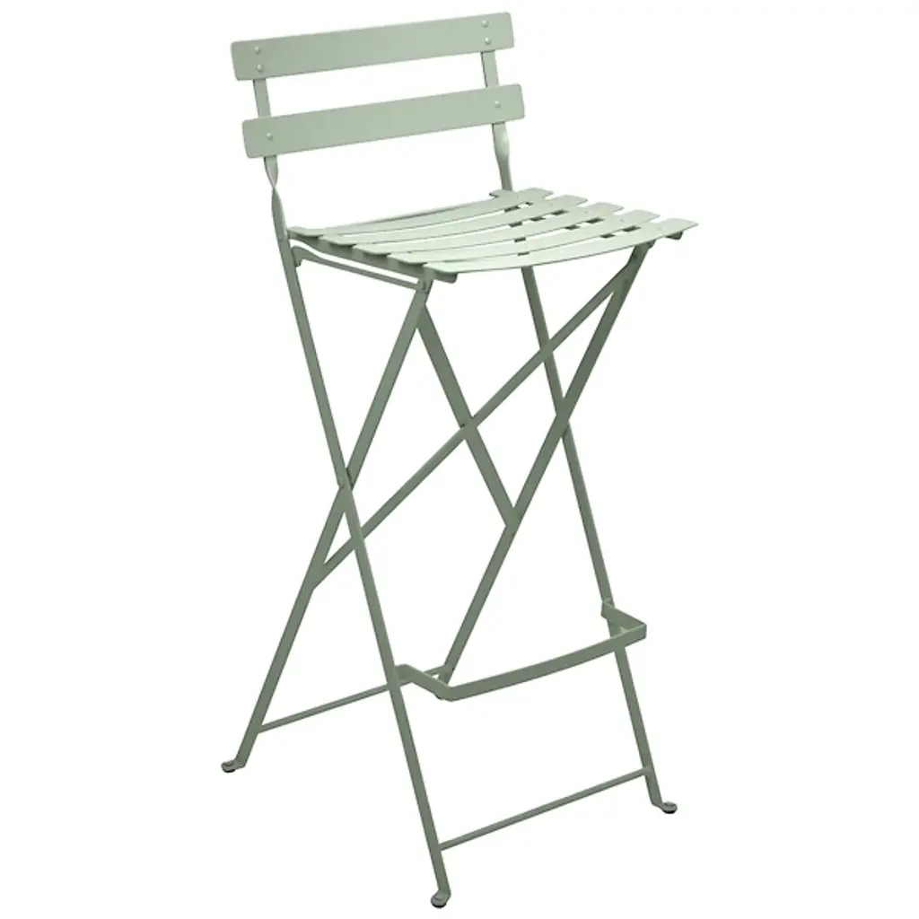 The Fermob Bistro Folding High Stool - Set of 2 provides a brand new perspective on outdoor dining. This elongated version of the popular Bistro Chair features a tall, architectural base of steel topped by curved slats of galvanized steel. All is coated in one of more than 20 possible finishes, all of which are safe for long-term--and colorful--outdoor use.
