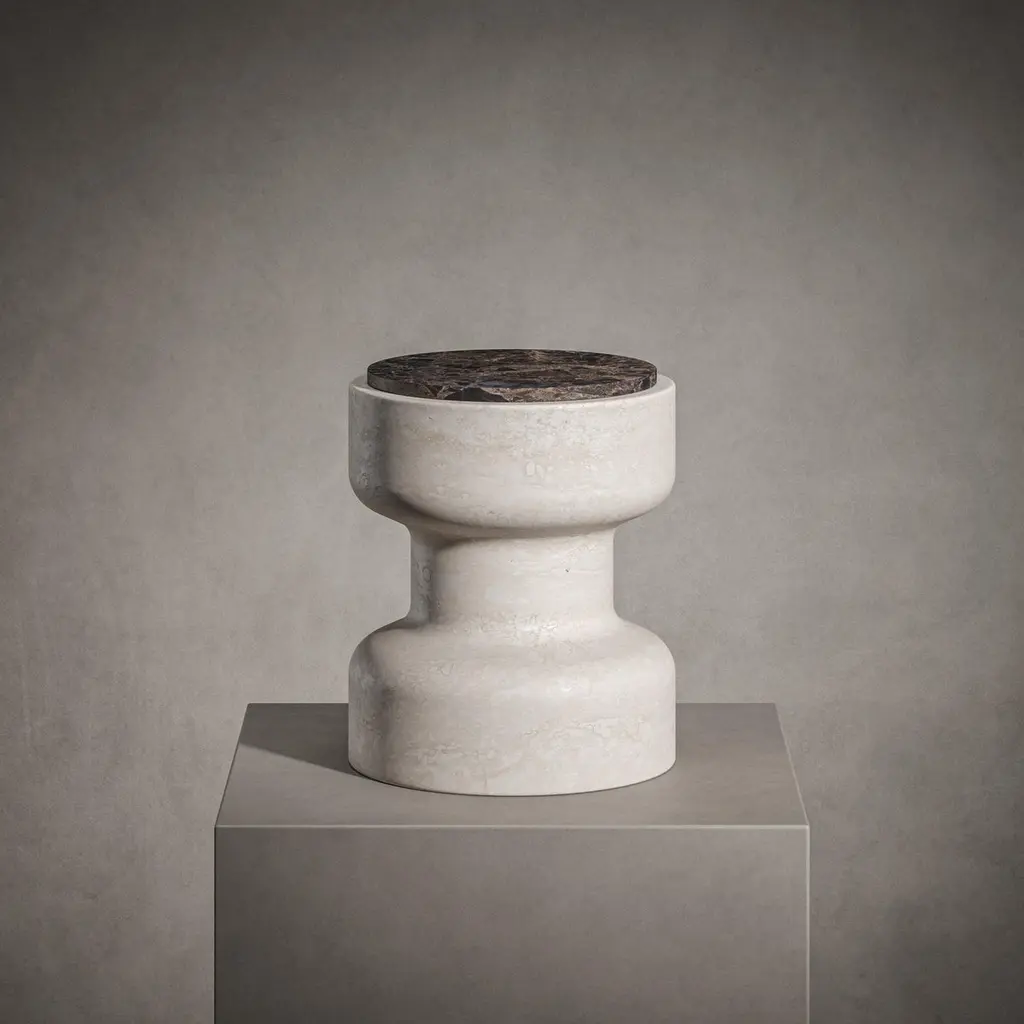 Black Emperador Trivoli Stool by Ivan ColominasDimensions: D 35 x H 42 cmMaterials: Travertino Navona and Black Emperador.TIVOLI COLLECTION:TIVOLI, a picturesque city situated on the western slopes of the Sabine Hills, was the place that the Ancient Rome’s elite chooseto enjoy the pleasant life in the countryside, in their wealthy residences. Among this magnificence, in the river next to the city,was hidden a treasure, the oldest and most famous Travertine marble, a natural stone present throughout the history of Italianarchitecture, both as a building material and decoration, that gave us the splendour of the Colosseum. Ivan Colominas pays tributeto the generosity and history of this exquisite stone, in his new collection that evokes the gem of Tivoli. Tables, together with stool,vases and centerpieces. An harmonious embrace between smooth lines and wonderful materials: Travertino Navona with wood orwith a new delightful shade of marble, the Emperor Dark. A feast for the eyes to celebrate the essence of beauty.The collection is a tribute to one of Italy’s great masters of design and architecture: Angelo Mangiarotti, creator of symbolic, marble design pieces, who is closely connected to the Apuan region and its craftsmen. The essential is visible, with a collection that offers infinite applications: serving, decorating, presenting, containing, tasting. The “material is served”, flawless and delectable.Ivan Colominas studied industrial design at the UCH-CEU in Valencia, where he also attained a Master’s of Transportation Design. The collaboration with several international firms has, in recent years, led him to work across a diverse range of sectors: from automotive, to sporting goods and home accessories. His design research is heavily influenced by 20th century iconography: focused on delivering products that, while belonging to a digital age, convey analogue qualities. Colominas’ work has garnered six Red Dot Awards and has been published in specialised media worldwide.