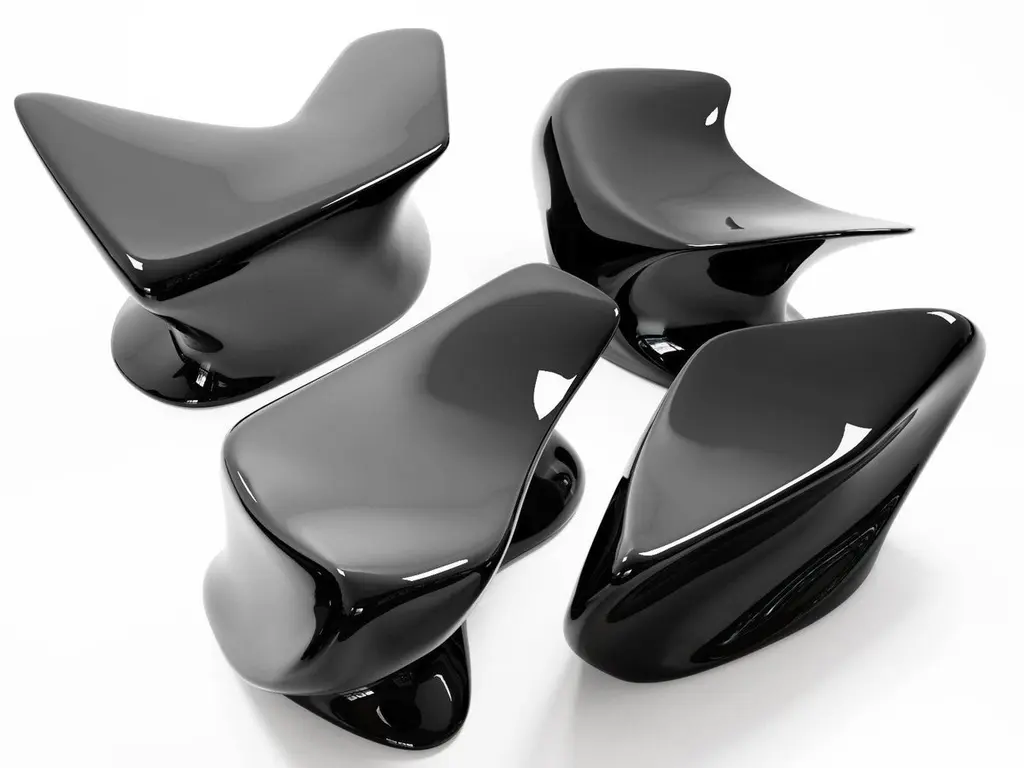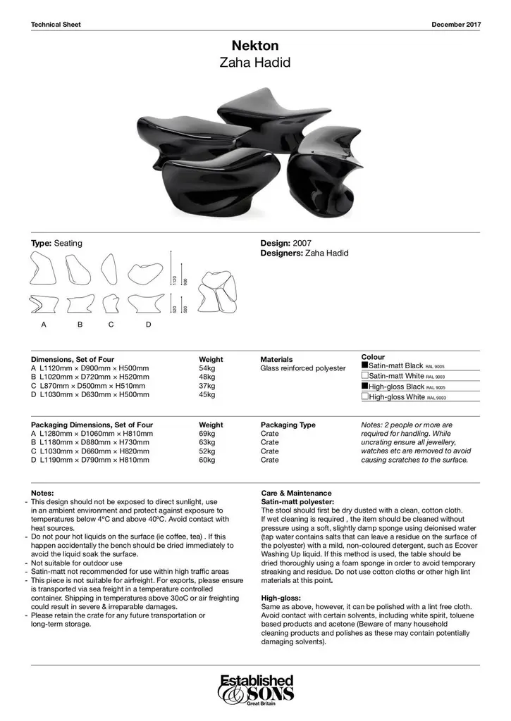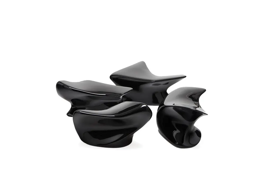 Zaha Hadid was the first woman to be awarded the distinguished Pritzker Architecture Prize in 2004 and is internationally known for her built, theoretical and academic work. Her recognizable and remarkable style is characterized by fragmented geometry and bold fluid forms. Hadid’s outstanding contribution to the architectural profession and legacy continues to be acknowledged by the worlds most respected institutions, as well as through the many projects in construction and in the extraordinary talents of their team.Curvaceous and tactile, the combined Nekton form splits into four distinctive sculptural seats. Scattered through a space or grouped in clusters, this design provides a flexible, unified seating landscape. The recognizably flowing aesthetic of world-renowned architect and designer Zaha Hadid is expressed in the connected shapes and surfaces. The Nekton is seen most at home in the contemplative environment of museums and art galleries, however it is also an ideal installation piece for large entrance halls and viewing platforms.As stools Zaha Hadid has said, "The Nekton stools can constantly be adapted and changed to accommodate any seating need by expanding both the interlocked and individual pieces."The dimensions in the product details only reflects one stool, please see the full dimensions below: Dimensions: Set of Four, 1. L1120mm × D900mm × H500mm, (L44'' × D35''× H19'' inches). 2. L1020mm × D720mm × H520mm, (L40''× D28'' × H20'' inches). 3. L870mm × D500mm × H510mm, (L34'' × D19.5'' × H20'' inches). 4. L1030mm × D630mm × H500mm, (L40.5'' × D25'' × H19'' inches); Dimensions displayed represents number 1 from the set of four in inches. Materials: Black Glass reinforced polyester fiberglass, high-gloss 2k polyurethane lacquer or satin- matte polyurethane lacquer in black or white. Product displayed and sold here is the Black Nekton set of four in high-gloss stools or table. Notes: - This design should not be exposed to direct sunlight, use in an ambient environment and protect against exposure to temperatures below 4 degrees Celsius and above 40 degrees Celsius. Avoid contact with heat sources. - Do not pour hot liquids on the surface area. If this accidentally happens, the bench should be dried immediately to avoid the liquid soak the surface.- Not suitable for outdoor use.