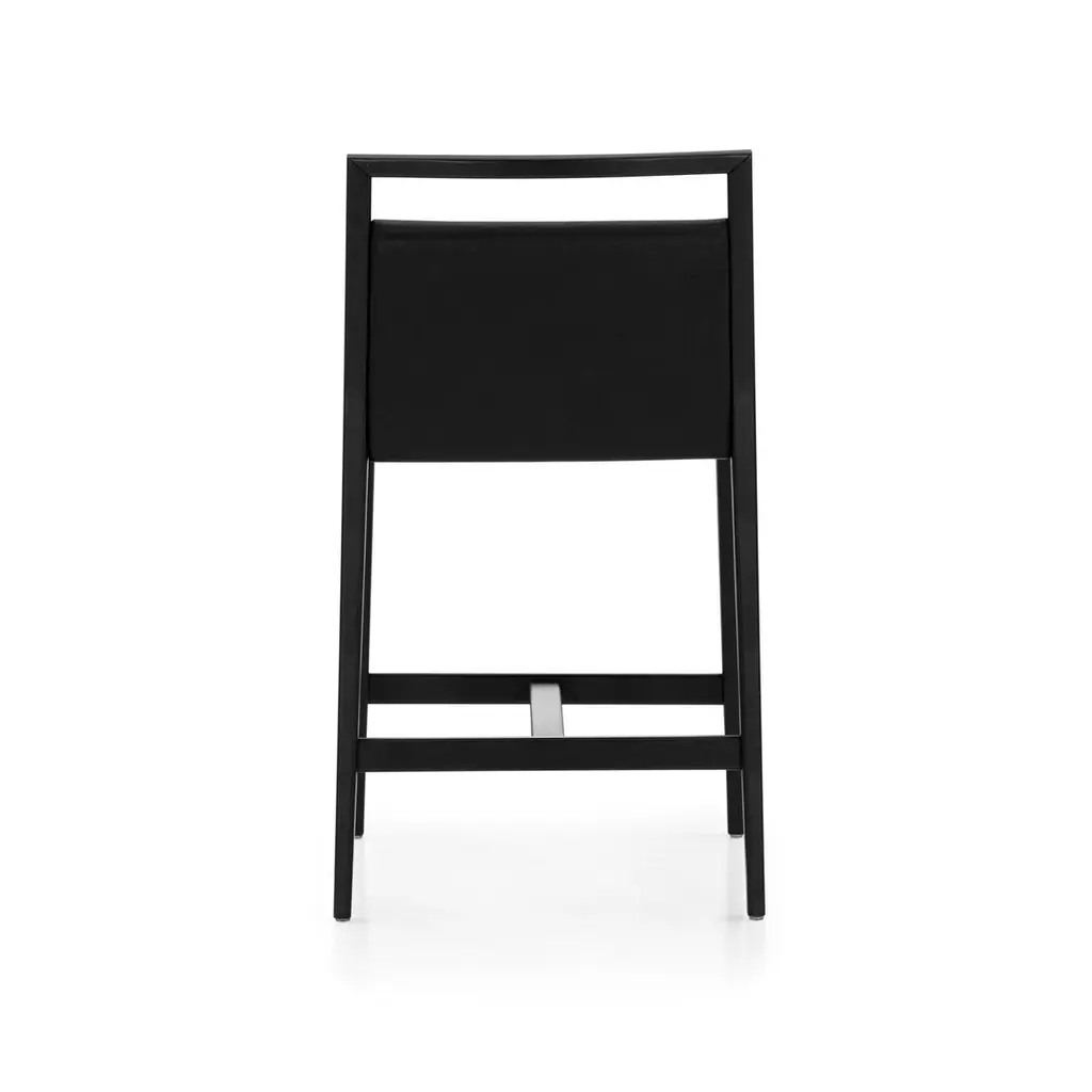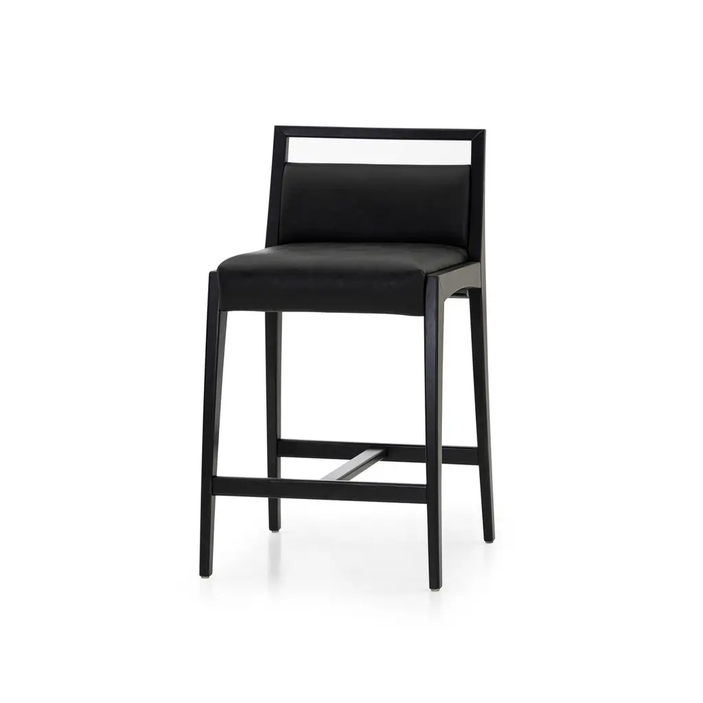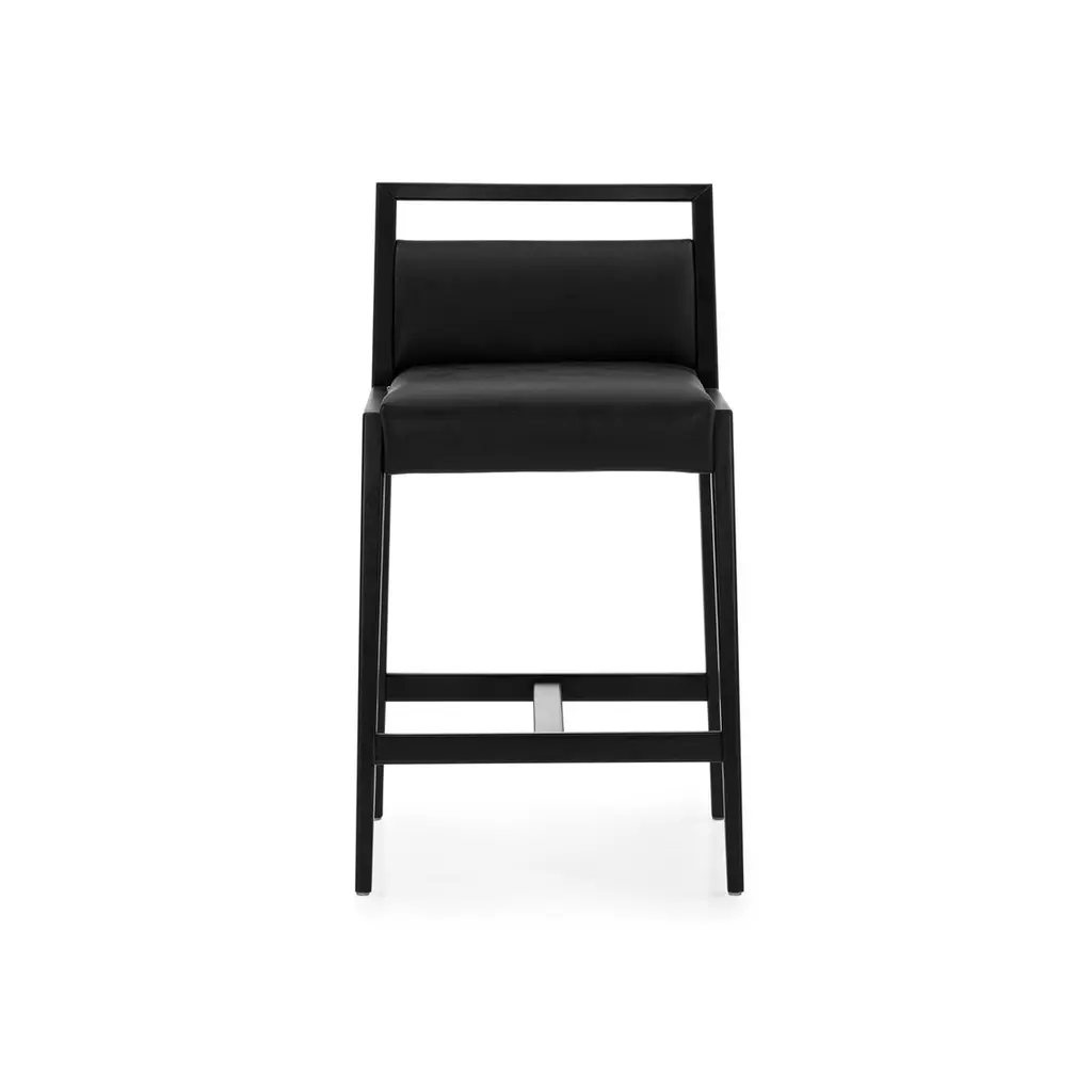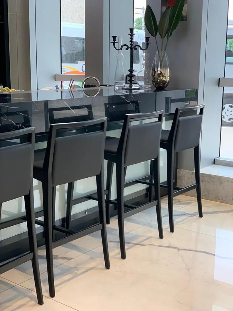 The Sotto bar height stool by Uultis Design is a refined expression of modern Brazilian craftsmanship, blending sharp geometry with luxurious comfort. Crafted from solid wood and finished in a rich matte black, the stool’s silhouette is clean and architectural, with subtle curvature that softens its strong lines. The seat and backrest are padded with medium-density foam and upholstered in black faux leather, offering supportive comfort with a sleek finish that’s easy to maintain.Ideal for contemporary kitchen islands, breakfast bars, or upscale commercial environments, the Sotto stool pairs durability with sophistication. Its open-back design provides visual lightness while retaining a grounded, stable frame. Delivered fully assembled in a single box, it brings immediate impact with minimal effort. A thoughtful balance of style and practicality, this piece complements both minimalist interiors and more expressive décor schemes, adding a quiet elegance without overpowering the space. Designed for daily use and made with sustainable materials, Sotto delivers comfort, resilience, and timeless design in equal measure.