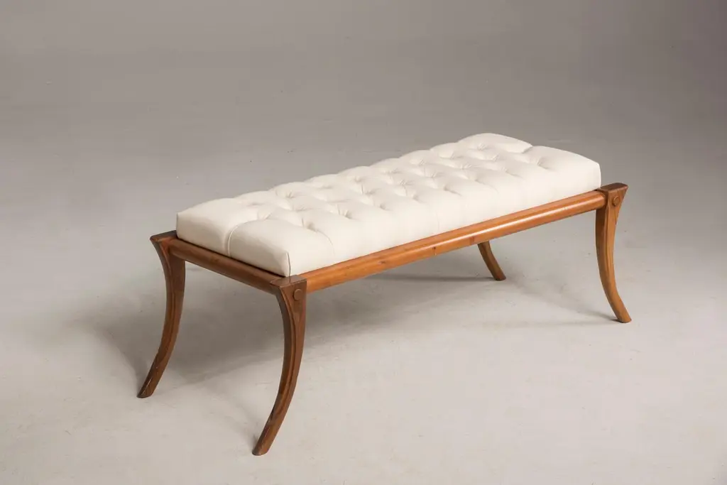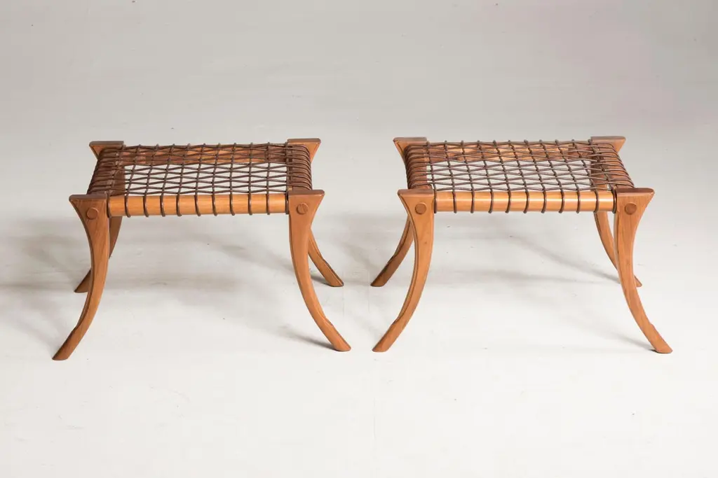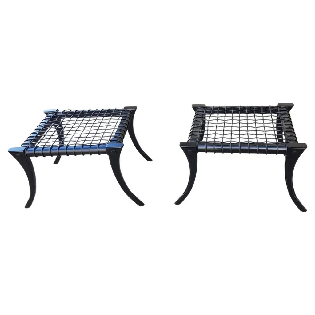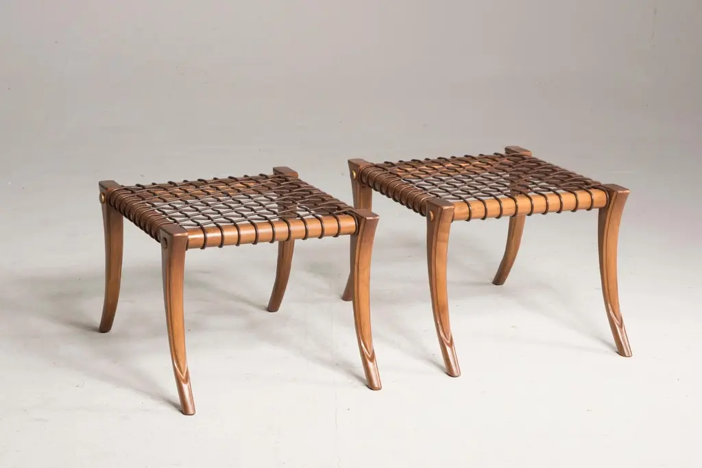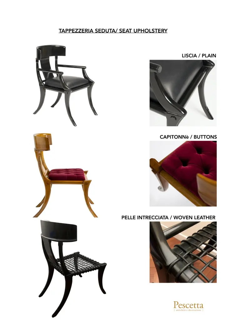 Saber legs shiny black wood and black woven leather stools.Other wood colors and upholstery are available. Italian artisanal production by Pescetta Home Decoration.Black Walnut wood stools or ottomans made in Italy, realized according to the historical model named "Klismos" which is a common type of ancient Greek seating piece, very often depicted on ancient furniture or on painted pottery and in bas-reliefs from the mid-5th century BCE onwards. The simple and elegant lines of the saber legs have been proposed and reconsidered several times during the home decoration history, making it a seating model without age and never out of fashion. Price refers to a set of two stools with following characteristics: Wood: black wood lacquer shiny finishing, handmade lacqueredUpholstery: woven black leather Seat size 62 x 53 cmMax size saber legs 53 x 73 cm Seat height 41,5 cmPossible customizations:Wood: Natural shiny wood, black, white shabby look, shiny / mat lacquer on request. Upholstery: Velvet, cotton, leather, eco leather. You can even provide your own fabric. Seat: plain, capitonnè (with buttons), woven leather. Kind of seating: chairs, armchairs and stools are available. Lead time is around 20 business - day depending on the customizations requested. Shipping all over the word Info for shipping : size of the wooden crate containing two stools, 60x60x100 cmGross Weight 50 kgPick up address: 37053 Cerea Verona.