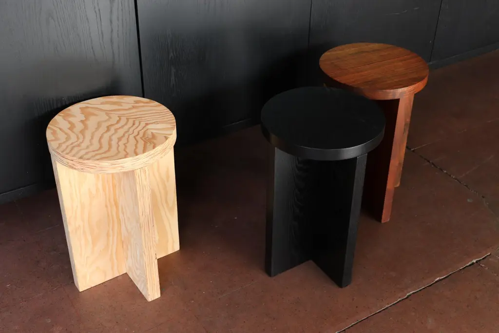 Solid wood stool or side table in blackened ash with a round top. With a clean and minimal design, these stools are handmade in Portland, Oregon with mortise and tenon joinery in Material's workshop. Also available with a square top, and in a number of wood species.