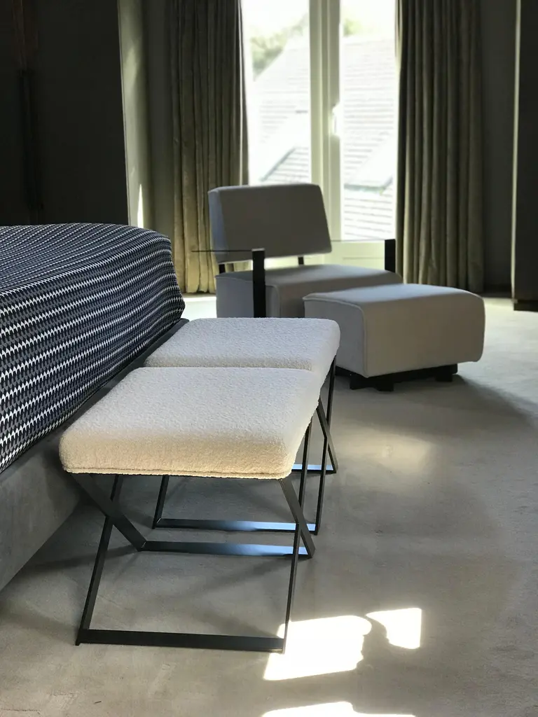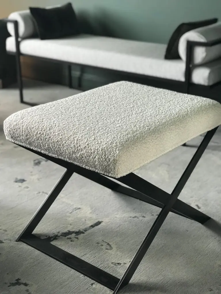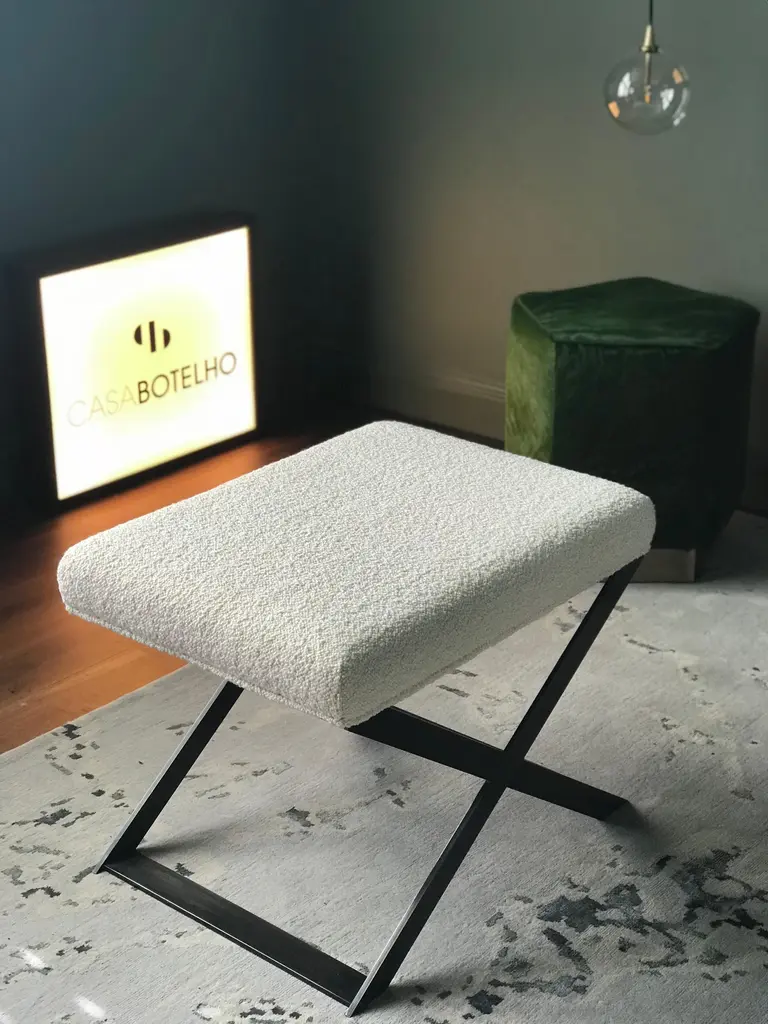 Its shape radiates dominance while its aesthetic harmonises with Casa Botelho’s signature style, Masculine Glamour. The X-Leg Stool will complement a variety of spaces from the bedroom to the living room, with its distinctive combination of hard and soft surfaces and textures. The price listed is for the Bouclé fabric and blackened steel finish. Dimensions: 60(D) x 45(W) x 45(H)cm