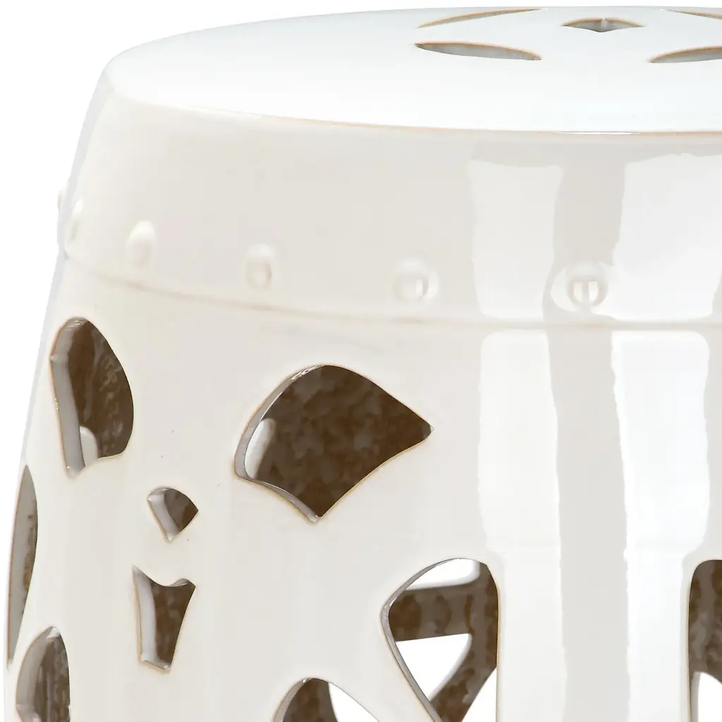 a over-scale pierced cutout creates a bold contemporary statement in the glazed ceramic Stencil Blossom garden stool in cream. With a design inspired by the Asian motif symbolizing prosperity, this stool doubles as a side table indoors and out. Wipe with damp cloth. Avoid the use of chemicals and household cleaners as they may damage the finish. Suitable for outdoor use, avoid extreme temperature and store indoors during long periods of inclement weather.