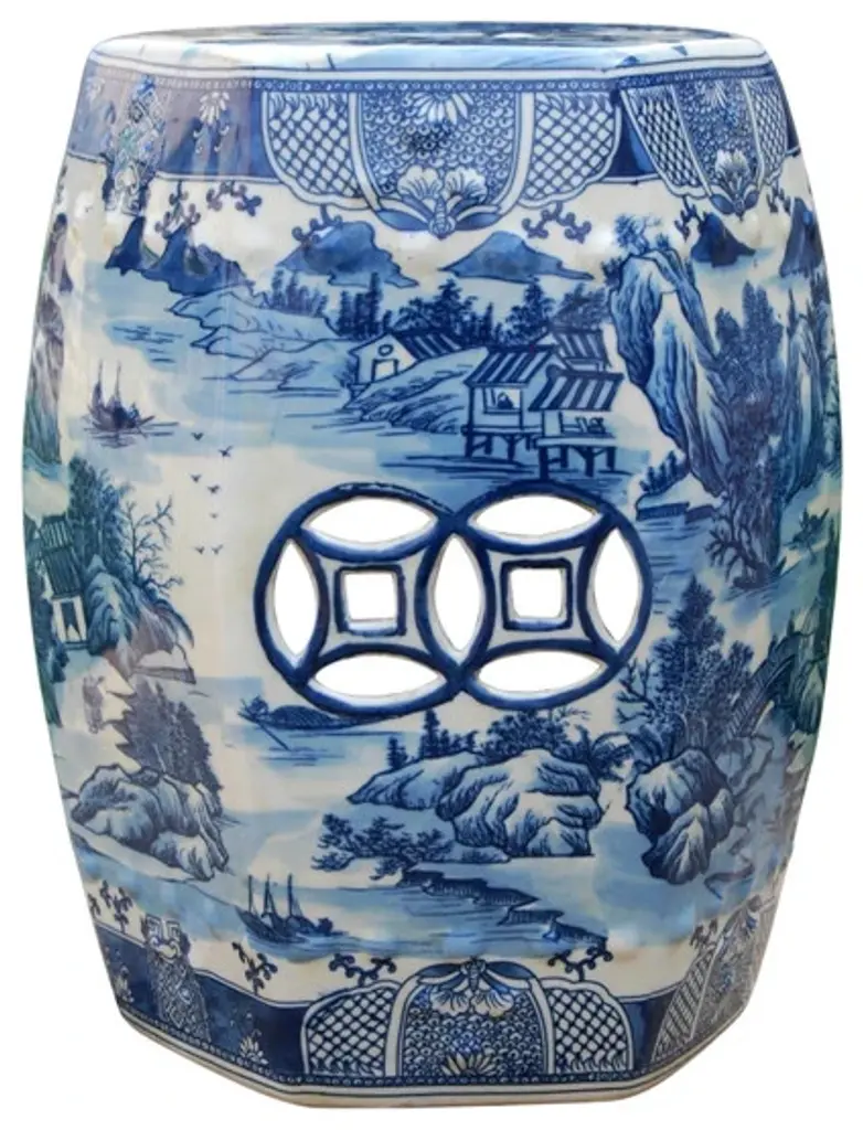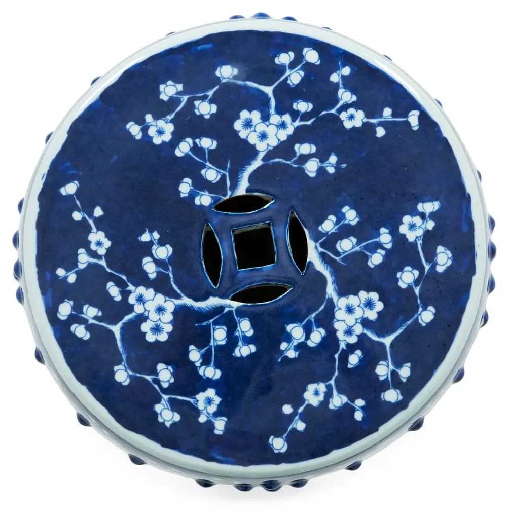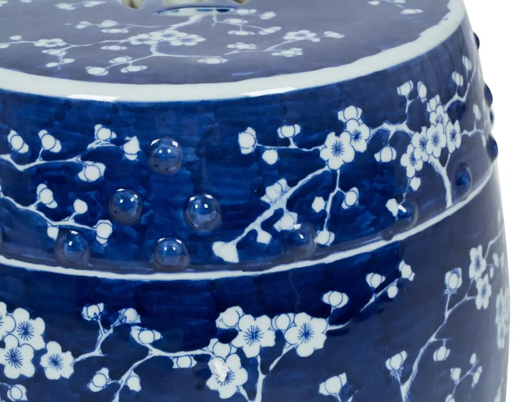 Embellished with a vibrant white-and-blue plum-blossom motif, this garden stool is an occasional table, a functional perch, and a decorative accent piece.
