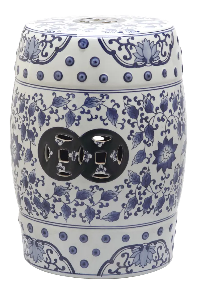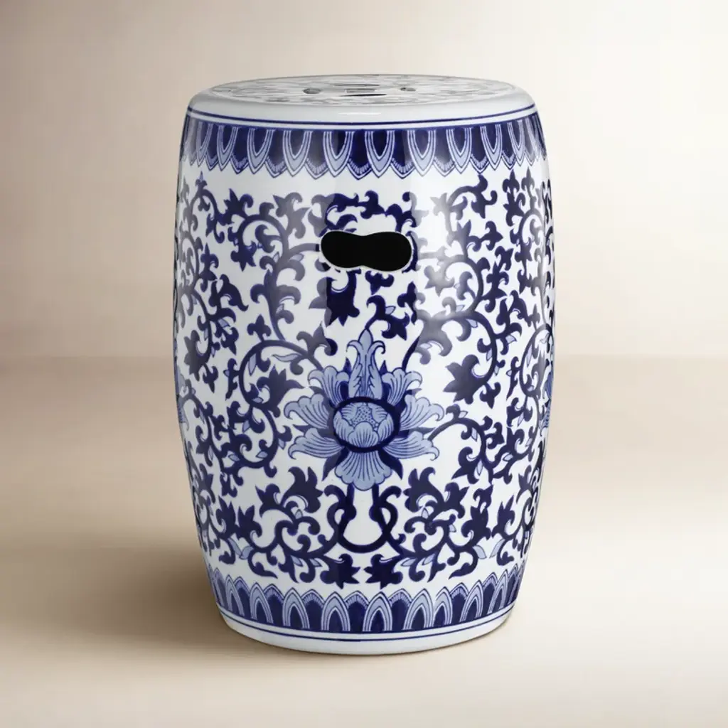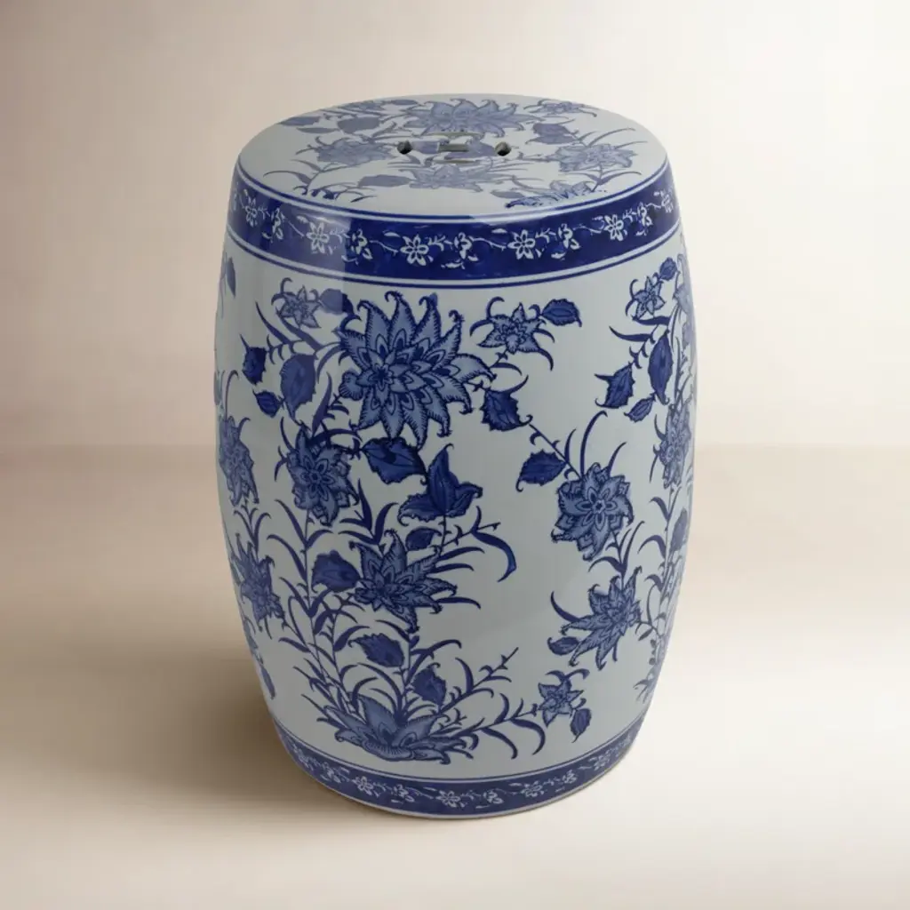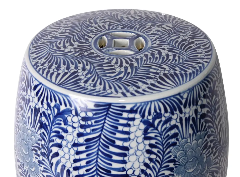 Ceramic garden stool with blue leaf / botanical design painted over white background. Each may vary in hand crafted differences and qualities natural to the ceramic material.
