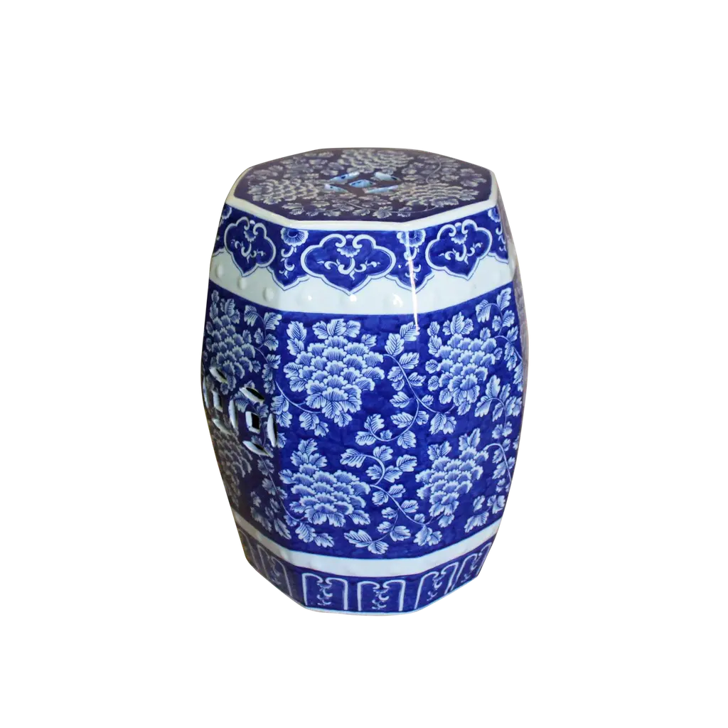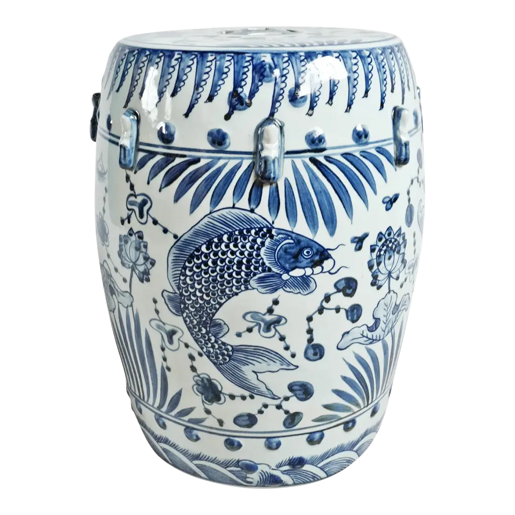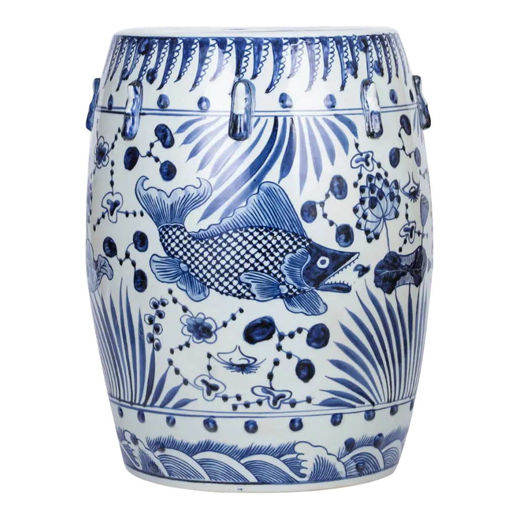 Ceramic garden stool with blue leaf / botanical design painted over white background. Each may vary in hand crafted differences and qualities natural to the ceramic material.