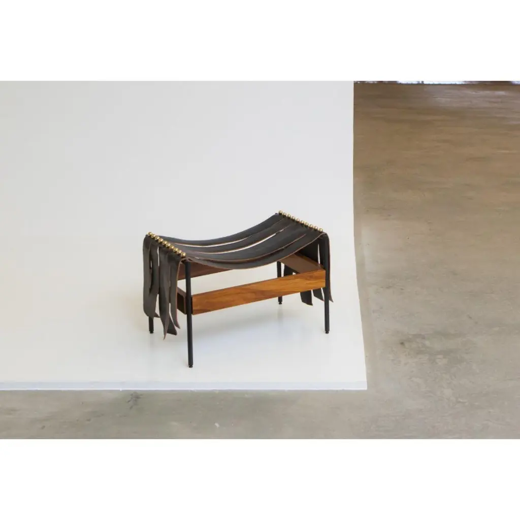 Bo - stool by Alva DesignMaterials: Metalic and wooden structure, leather seat, brass spheresDimensions: 60 x 40 x 40 cmALVA is a furniture and objects design office, formed by brothers Susana Bastos, artist and designer, and Marcelo Alvarenga, architect. Their projects are the result of the meeting of these two visions, the architectural and the artistic, and beyond the usual rationality and functionality, they seek the unusual, new uses and an expressive materiality. The duo's creation process starts from a sensitive observation of people's daily lives, their habits and current needs, together with a perception of new potentialities to be artistically explored. In the development of each piece, the technical and aesthetic baggage of the brothers, acquired through important experiences in the architecture and fashion market, is added to a strong relationship with their Minas Gerais and Brazilian origins. In the execution phase, the selection of raw materials and the exquisite manufacturing, often handcrafted, give a unique aspect to the works. The result is contemporary pieces loaded with memory.Alva's first line of furniture and objects was launched in 2013 at the MADE (Mercado, Arte, Design) fair in São Paulo. Following this launch, the firm partnered with Etel - a brand now known worldwide for publishing the best of Brazilian design - to produce and market some of its creations, bringing the brothers' names into the special group of authorial designers represented by it. Since their first release, Susana and Marcelo's creations have gained visibility in several important publications, websites and magazines, both national and international.
