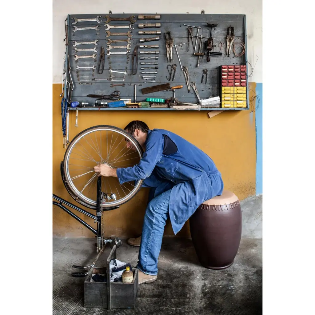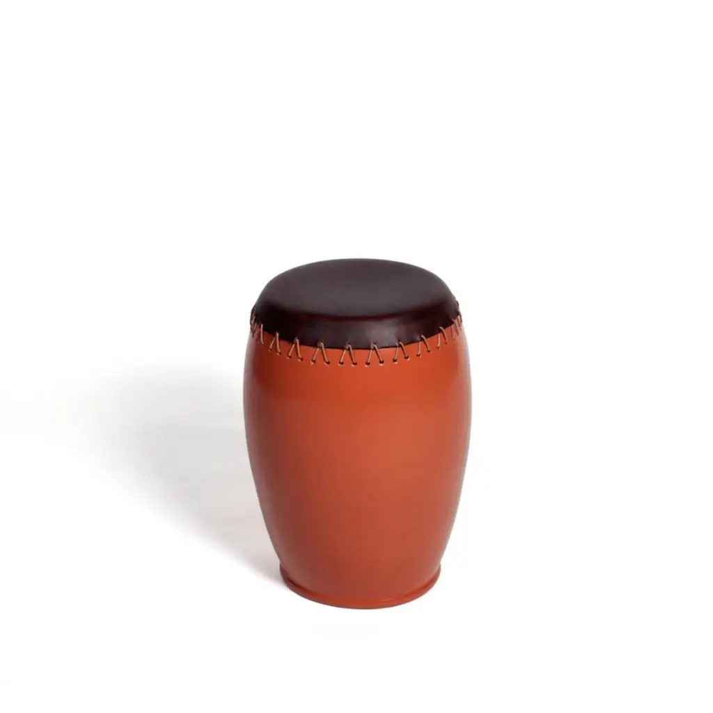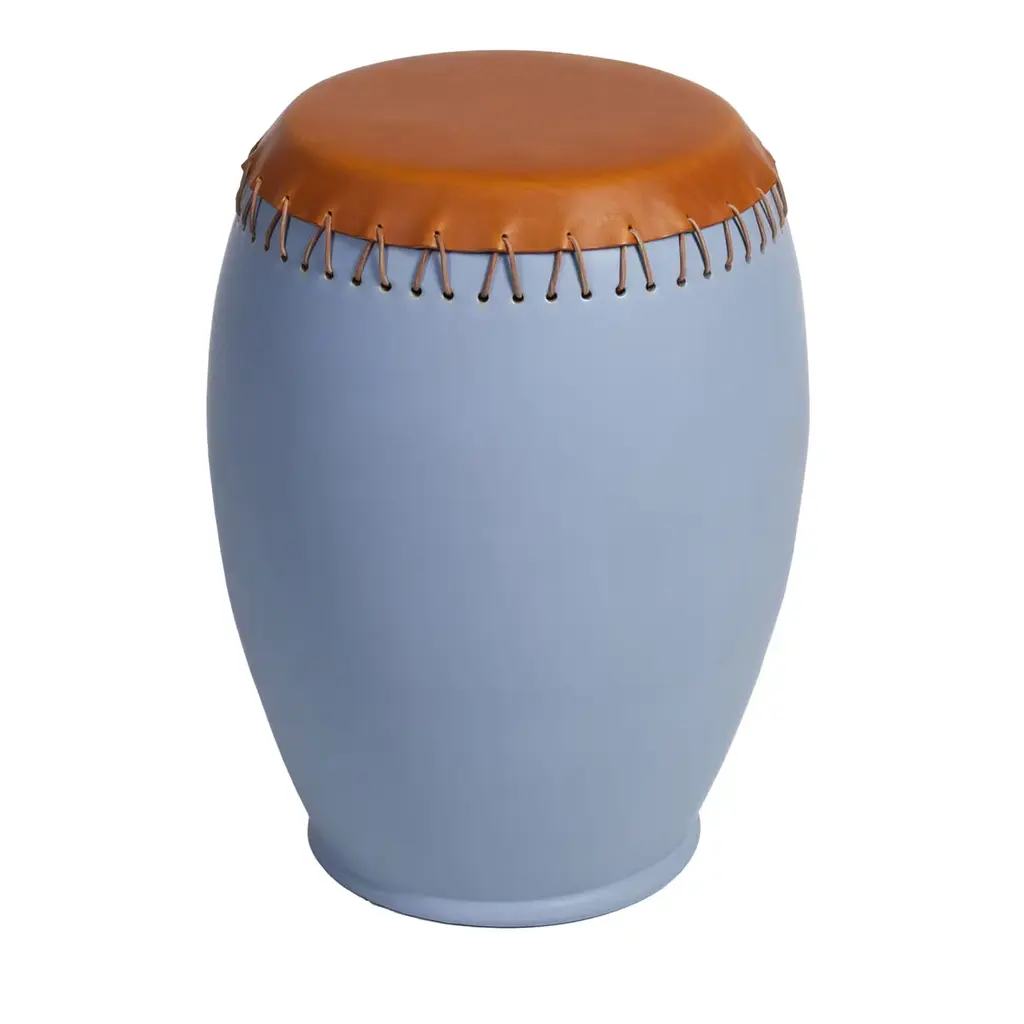 Bombo 2 Coffee Table & Stool in Enamelled Stoneware & Leather by Oscar MascheraDimensions: Ø 40 x H 55 cm.Materials: Leather and fabric.Available in different size options. Prices and dimensions may vary. Please contact us.Our work is research: we give our fantasy free rein when experimenting and manipulating an object in leather.The researcher proceeds and invents. Given a road, it goes all the way along it, back and forth, and then begins to visit its surroundings. It is the same for us. We explore the leather: creating corners, cutting edges, and joining the parts. Every object is an invention, because it is a stage in the research, and never the endpoint of the production.Like footprints in the sand, our objects represent a story made up of different chapters. Every element of this story, every collection, has its own independent life. Foglia Couture, Caballito Blanco, Miroirs et Tapis, Bombo, Stecco, Isole, Pouf!, Caballito Blanco#Blanco. Every name in this sequence is a step, a track, a memory.But what better expresses the idea of our project is the whole set of collections, the direction that they all take as one, like a slipstream along the coast.Inventing as a job is first and foremost a pleasure. Combining the materials, folding the lines, choosing the colours, modelling, and constructing. And above all, simplifying, letting the objects be free to invent a new space, observing how they come to modify what they are next to: a room, a place, the everyday routine.Imagination creates a horizon. The designs are sensed in an ideal world. The next step, the one that allows you to see the images composed in the objects, is the heart of our work. Experience concretizes what is initially imagined, and all our production represents this operation.