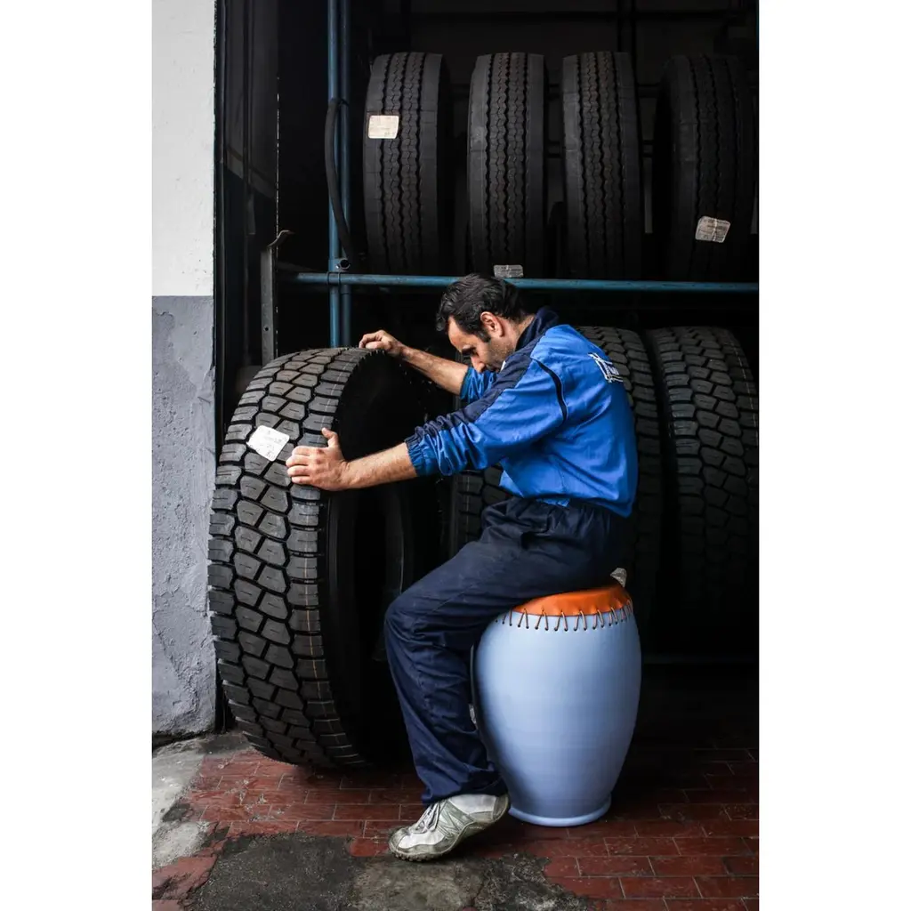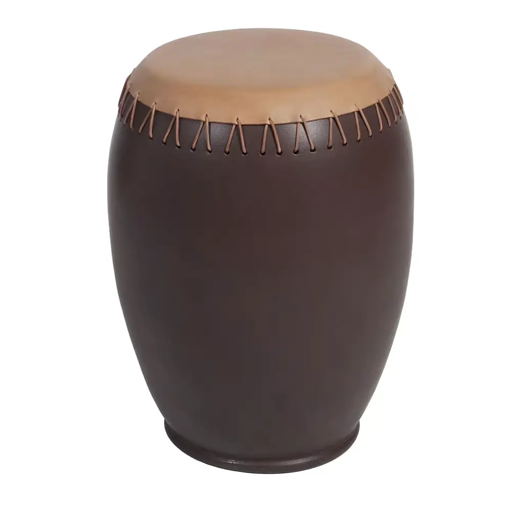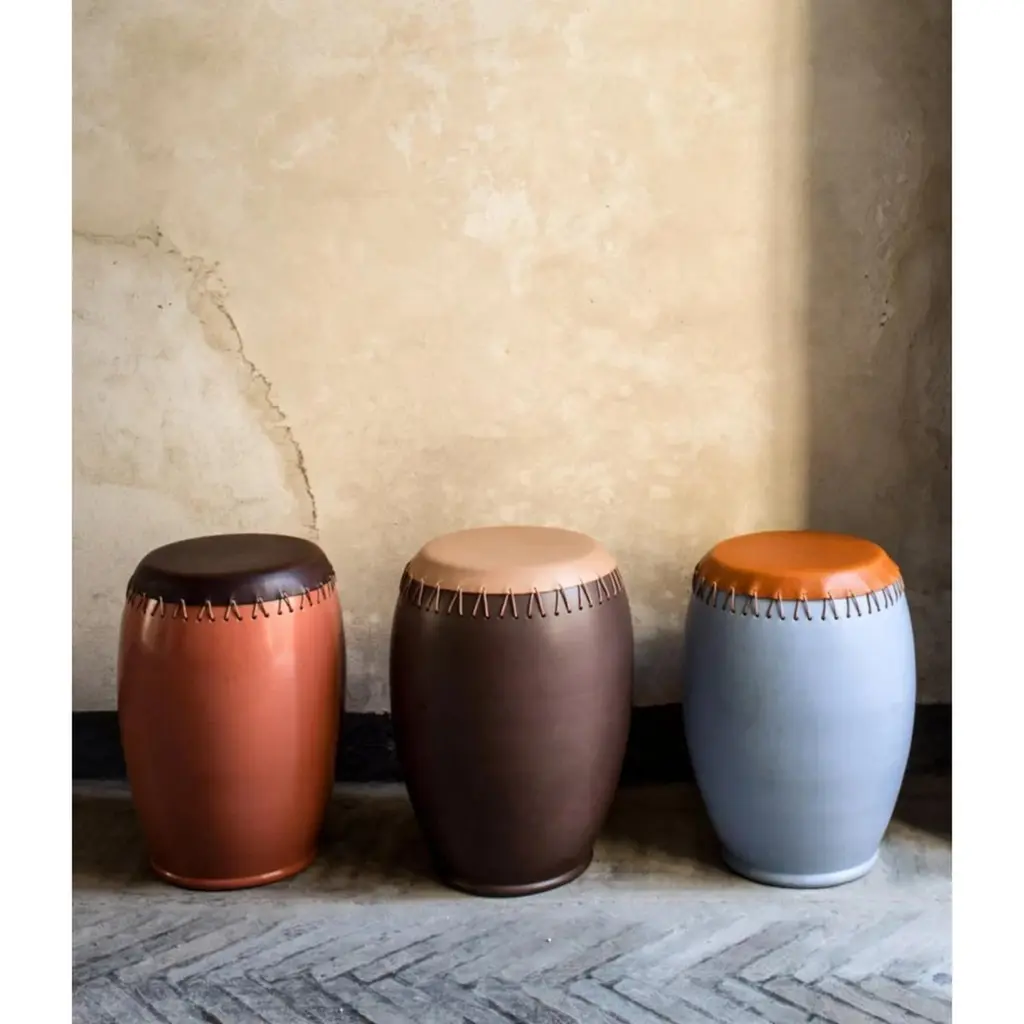 Bombo 2 Coffee Table & Stool in Enamelled Stoneware & Leather by Oscar MascheraDimensions: Ø 40 x H 55 cm.Materials: Leather and fabric.Available in different size options. Prices and dimensions may vary. Please contact us.Our work is research: we give our fantasy free rein when experimenting and manipulating an object in leather.The researcher proceeds and invents. Given a road, it goes all the way along it, back and forth, and then begins to visit its surroundings. It is the same for us. We explore the leather: creating corners, cutting edges, and joining the parts. Every object is an invention, because it is a stage in the research, and never the endpoint of the production.Like footprints in the sand, our objects represent a story made up of different chapters. Every element of this story, every collection, has its own independent life. Foglia Couture, Caballito Blanco, Miroirs et Tapis, Bombo, Stecco, Isole, Pouf!, Caballito Blanco#Blanco. Every name in this sequence is a step, a track, a memory.But what better expresses the idea of our project is the whole set of collections, the direction that they all take as one, like a slipstream along the coast.Inventing as a job is first and foremost a pleasure. Combining the materials, folding the lines, choosing the colours, modelling, and constructing. And above all, simplifying, letting the objects be free to invent a new space, observing how they come to modify what they are next to: a room, a place, the everyday routine.Imagination creates a horizon. The designs are sensed in an ideal world. The next step, the one that allows you to see the images composed in the objects, is the heart of our work. Experience concretizes what is initially imagined, and all our production represents this operation.