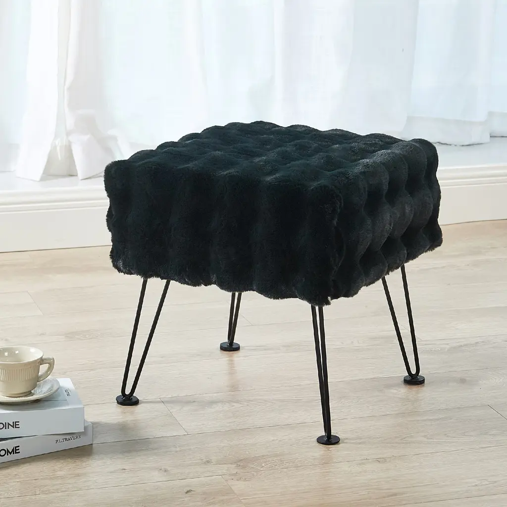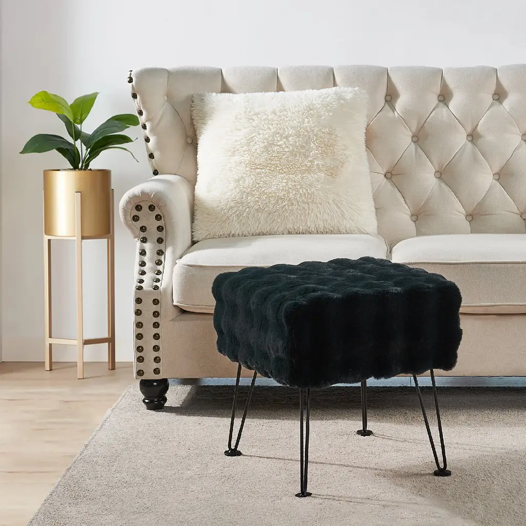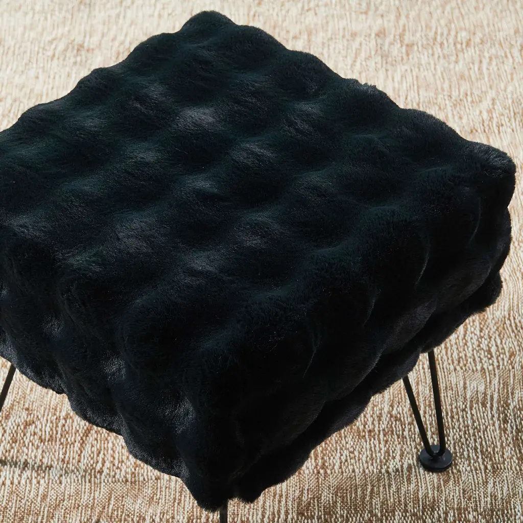 Bubble Square Faux Fur Ottoman Stool, Black, 17''x17''x17''