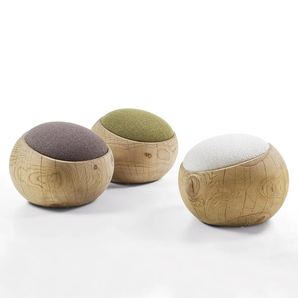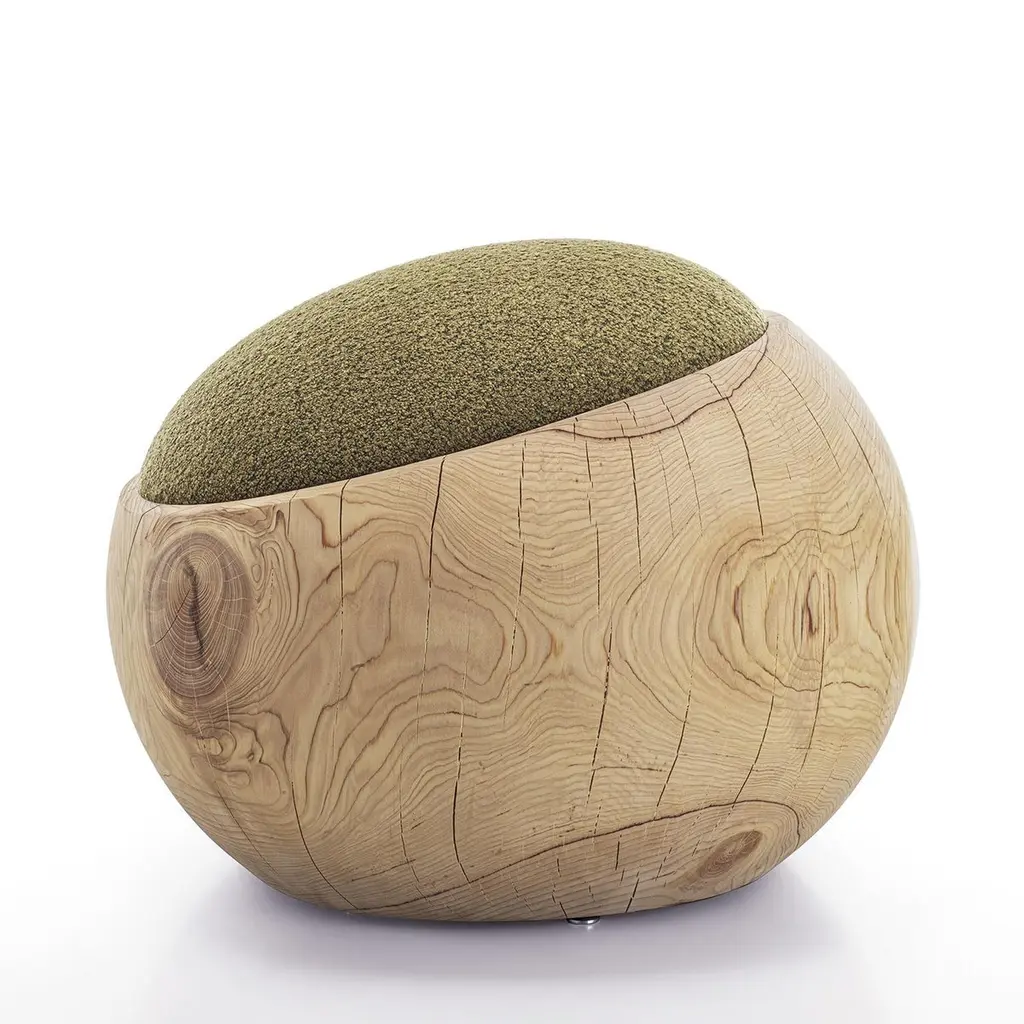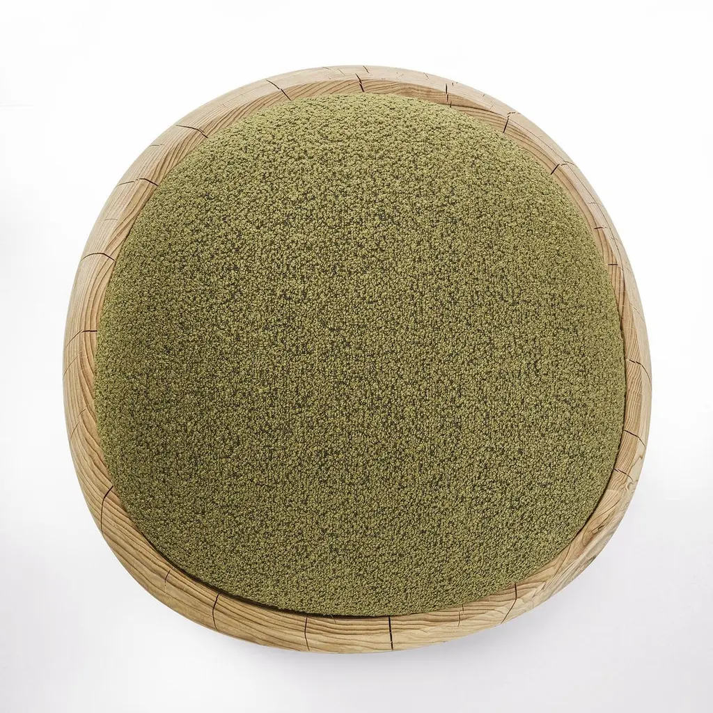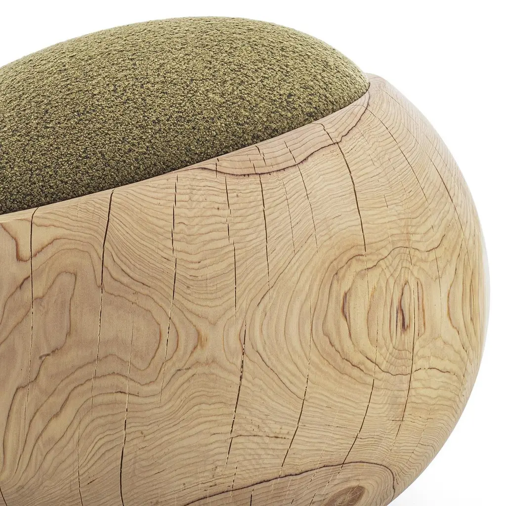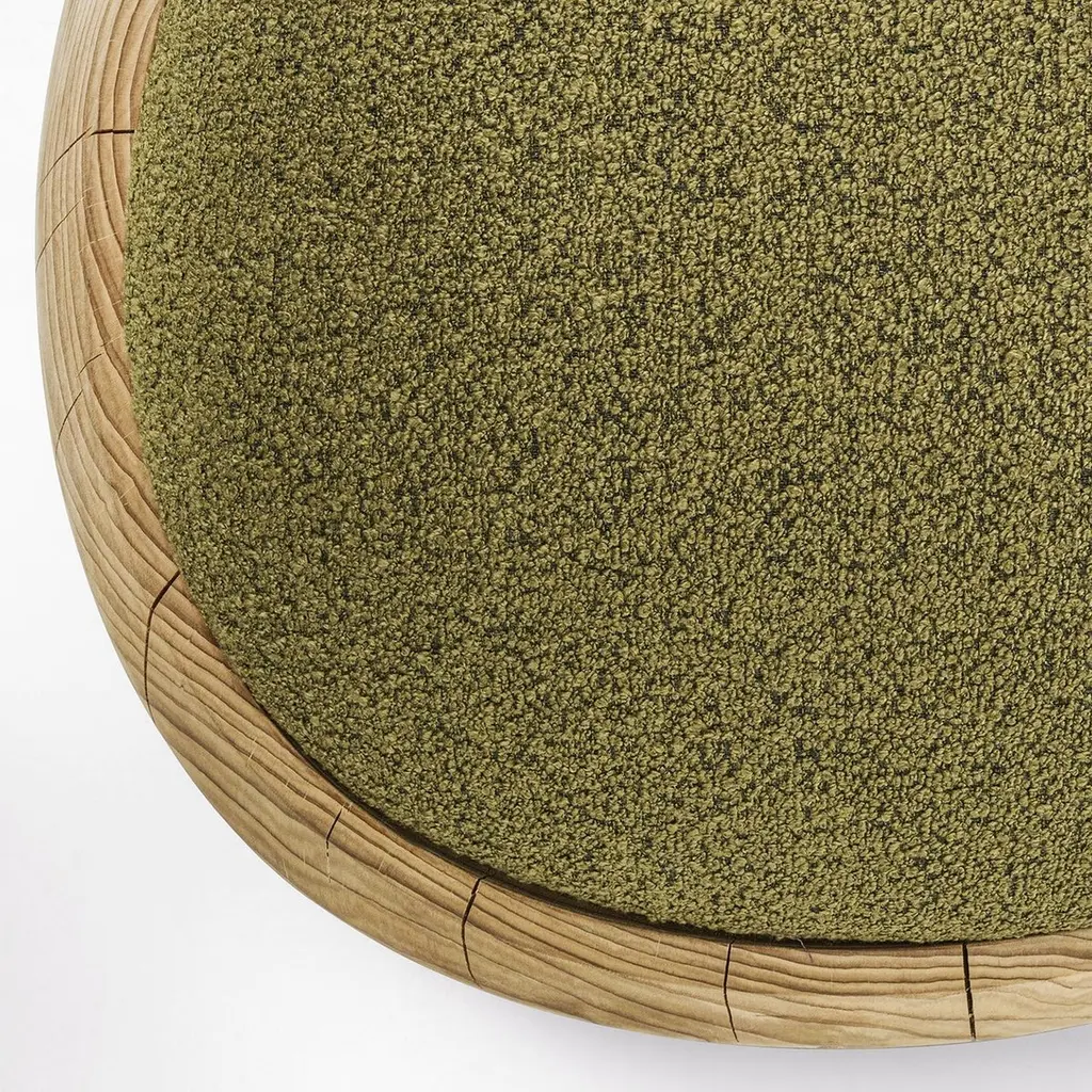 Stool Bud Kaki Cedar with structure in solid cedar wood,wood treated with wax with natural pine extracts, stoolupholstered and covered with bouclé fabric in kaki color.Also available on request with bouclé fabric in white coloror in brown color.Solid cedar wood include movement, cracks and changesin wood conditions, this is the essential characteristic of natural solid cedar wood due to natural settlement and different environmental conditions.