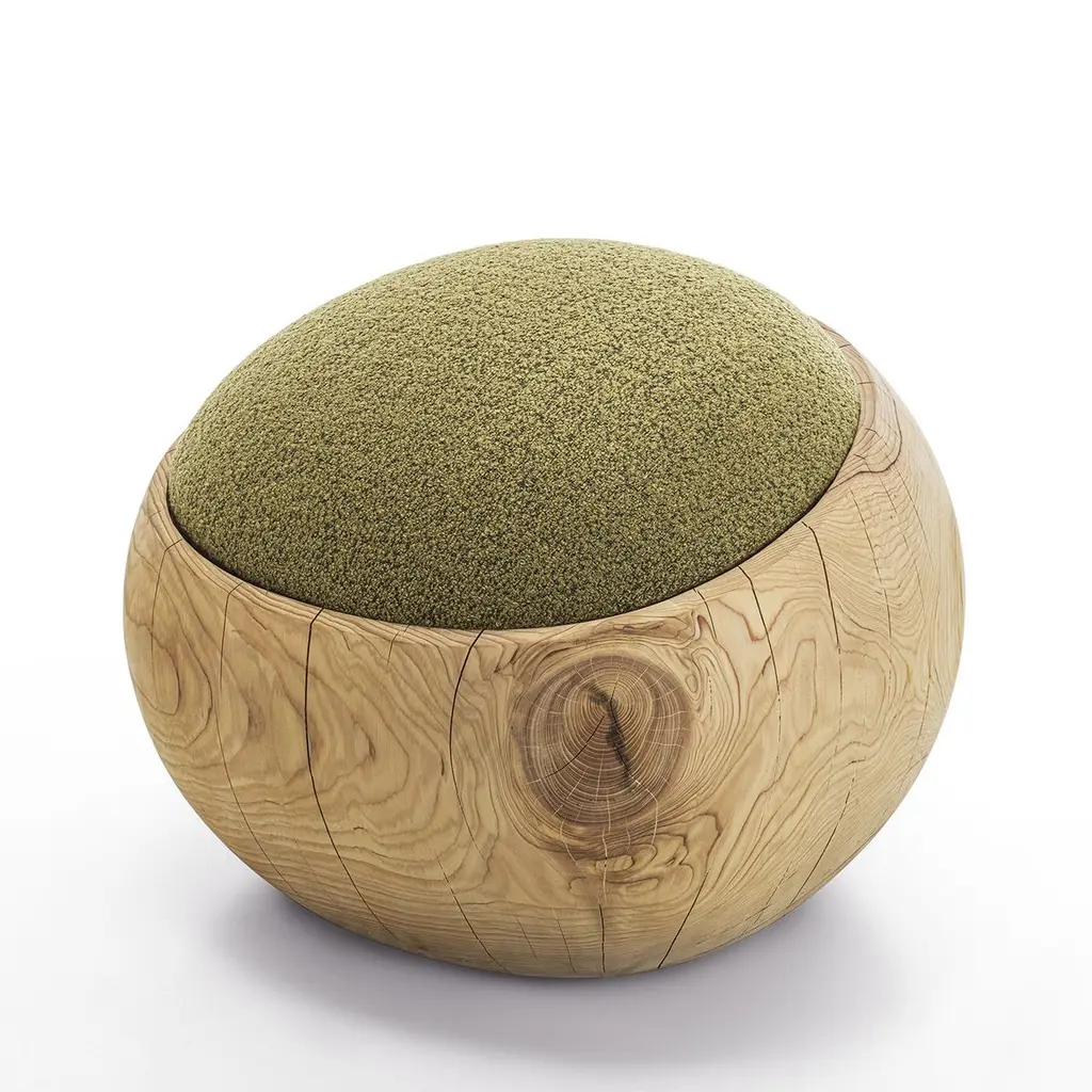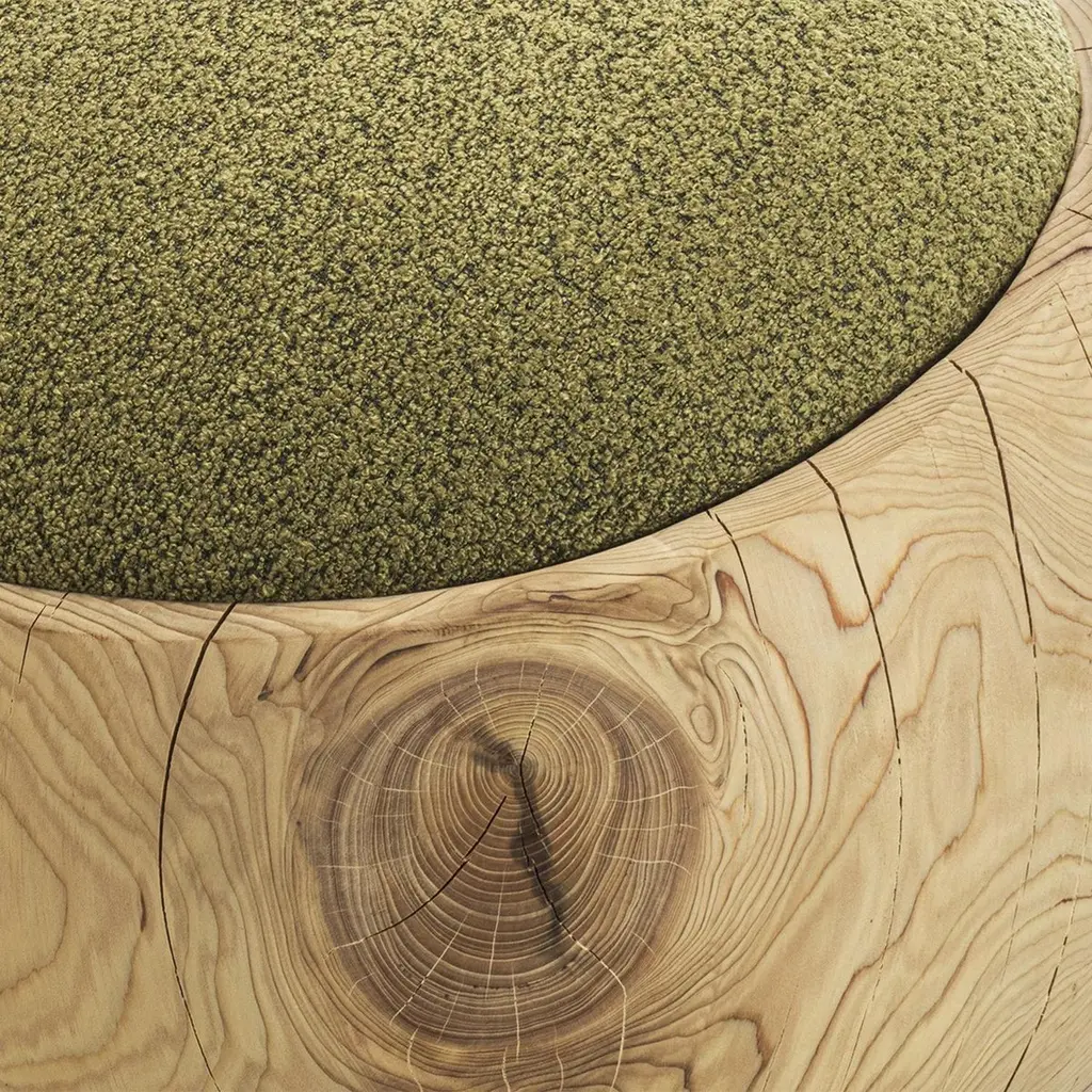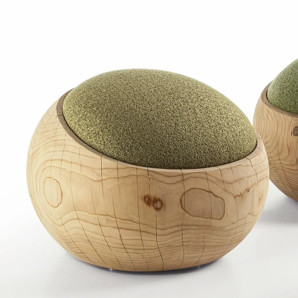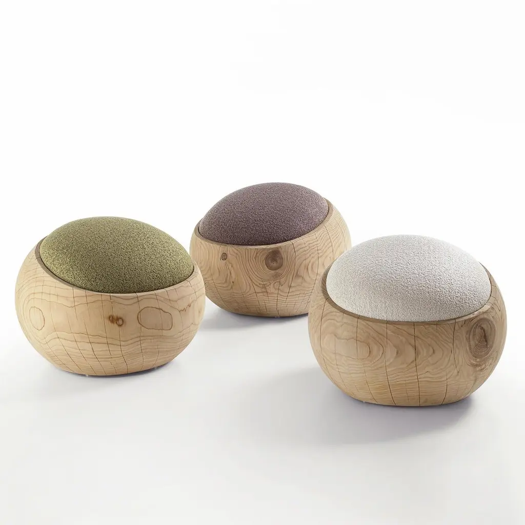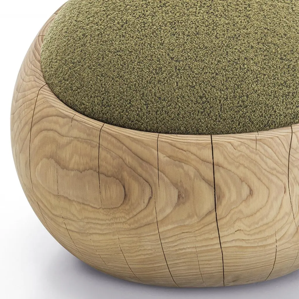 Stool Bud Kaki Cedar with structure in solid cedar wood,wood treated with wax with natural pine extracts, stoolupholstered and covered with bouclé fabric in kaki color.Also available on request with bouclé fabric in white coloror in brown color.Solid cedar wood include movement, cracks and changesin wood conditions, this is the essential characteristic of natural solid cedar wood due to natural settlement and different environmental conditions.