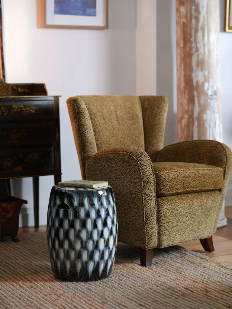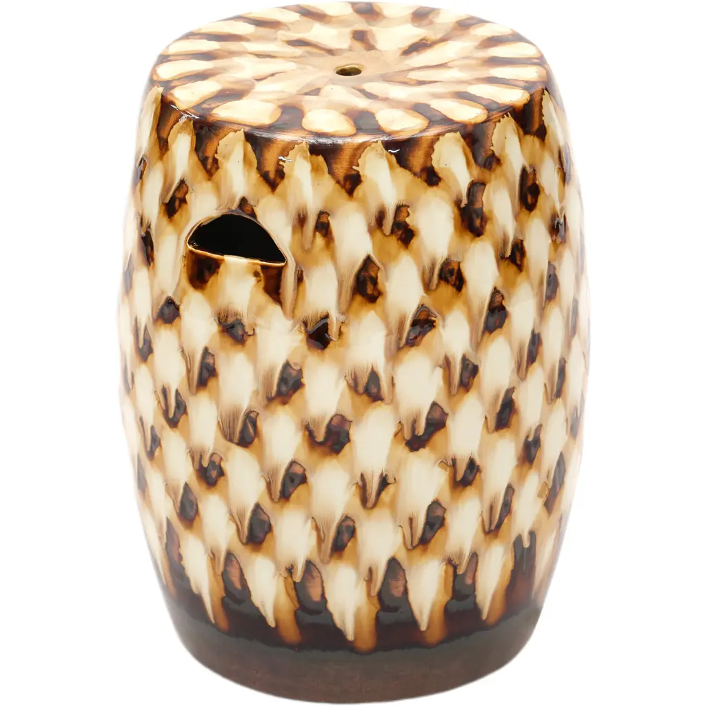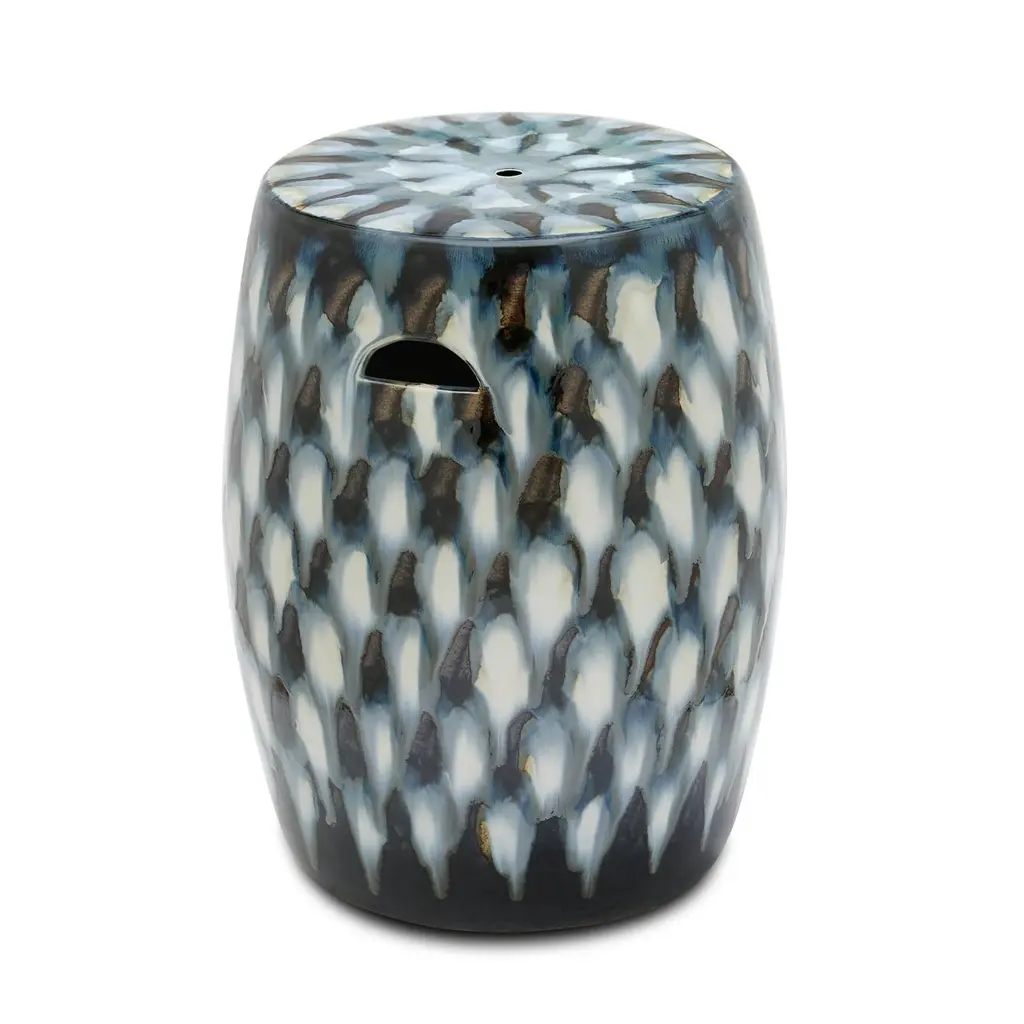 We've taken our best-selling pheasant feather glaze and applied it to our new barrel-form garden stool. A perfect way to bring this favorite glaze into your home.This stool's one-of-a-kind glaze takes inspiration from traditional sancai or tri-colored glazes. Since sancai glazes were prone to running during the firing process, colors often mix together to create an effect similar to the one achieved here.Dimensions: 13.5”W x 17”H; Top: 11"WThe unpredictable nature of sancai glazes ensures that while the overall effect can be consistent, no two pieces are exactly the same. This is an ethos that we embrace by working with artisans who still practice traditional glazing techniques. Due to natural reactions within the kiln, the amount of blue and cream tones in the final glaze on this lamp will vary.Due to the handcrafted nature of each ceramic stool and natural reactions within the kiln, no two forms or glazes are exactly alike. Each is a unique work, and slight variations in size and glaze from piece to piece are expected and embraced. We do our best to make sure that multiple stools in a single order are as similar as possible.