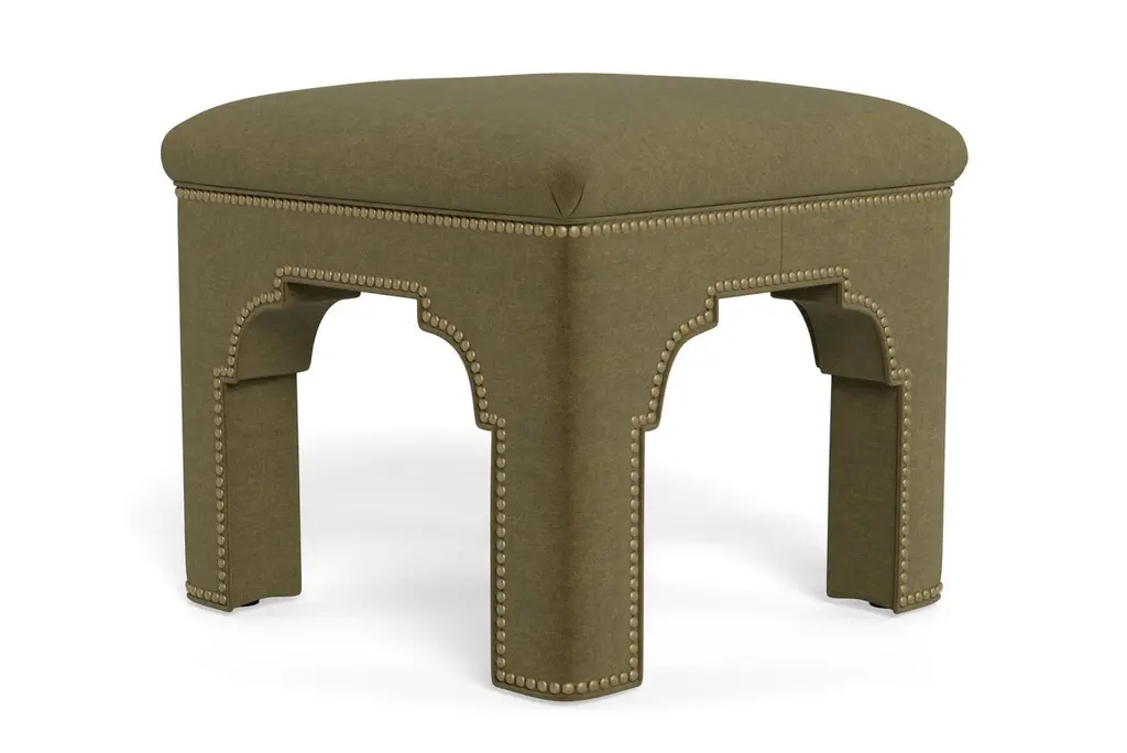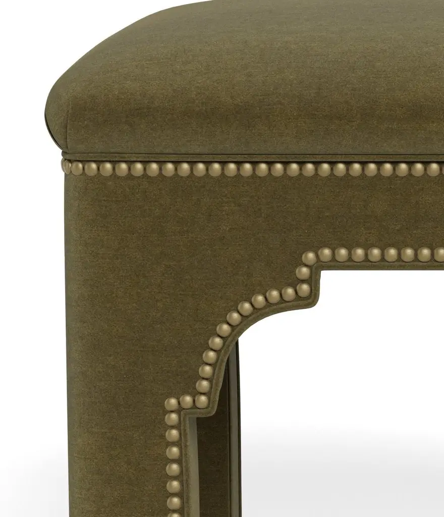 Add a chic accent to any room with this compact stool on its own or displayed in pairs. Made to order with antique brass nail heads accenting moss performance velvet, a fabric that can be cleaned and withstand high traffic areas. The tightly upholstered seat covers a solid maple frame. A Mughal-inspired arch make it a standout in style. Kiln-dried solid maple frame with double-doweled joints and corner blocks for superior strength. Eight-way hand-tied coil spring suspension with a solid webbed base. Cushions are plumped with standard fill (down, feather and foam for softness with underlying support). Returns are not accepted on made to order items.