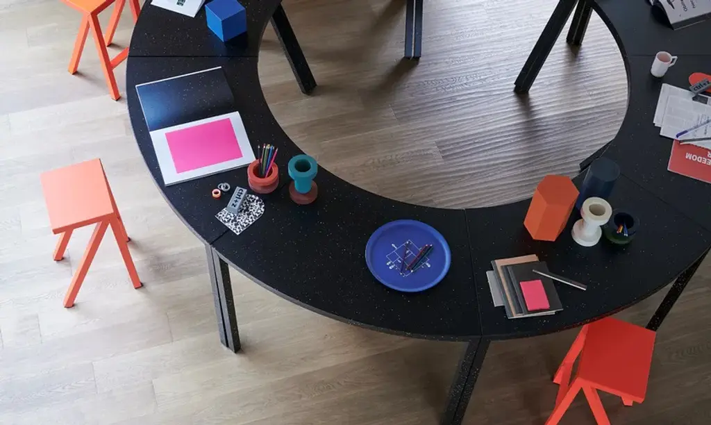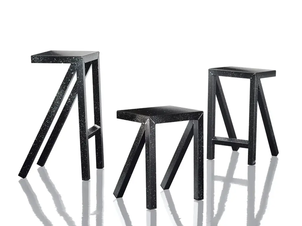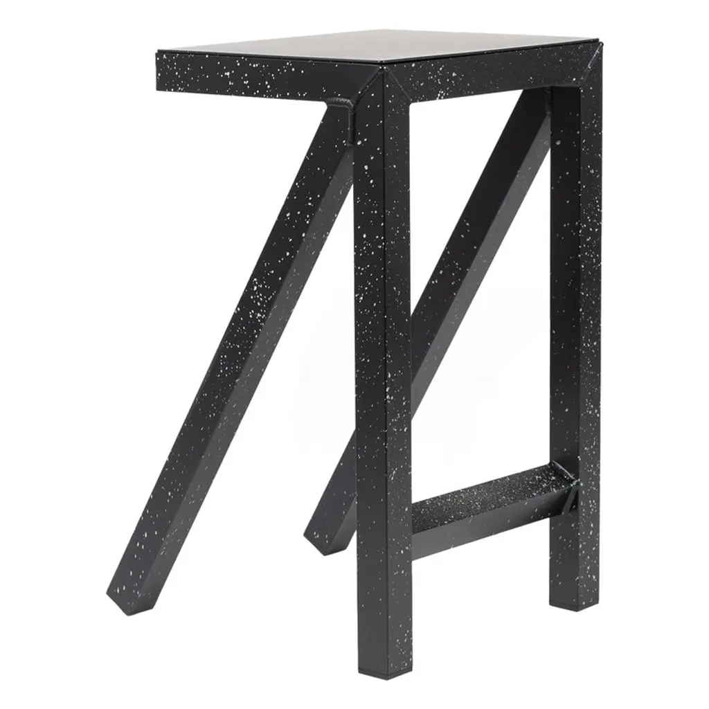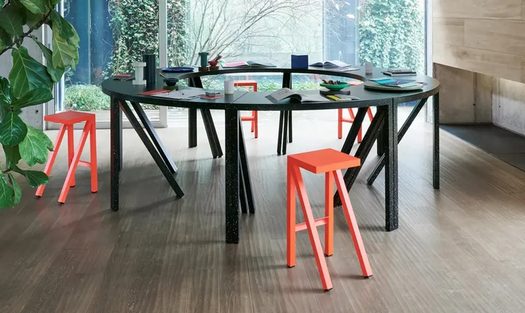 Stools.Material: aluminium painted in polyester powder. Suitable also for outdoor use.At home, in a museum, in the office, under a tree or on a mountaintop. These and many more are the environments in which the new Bureaurama collection created by Jerszy Seymour is perfectly at home. A series of high, medium and low stools and tables made of aluminium in a black and white version with a spray-painted surface or in different fluorescent colours. Their main characteristics are their lightness and their graphic and essential lines, which allow countless solutions to be configured for work or socialising. The term Bureaurama itself suggests Magis's vision of conceiving the office as a dynamic and constantly evolving workplace. Because Bureaurama is intended as a space where we can rethink our future, discuss and make decisions or simply twiddle our thumbs, doodle and relax.