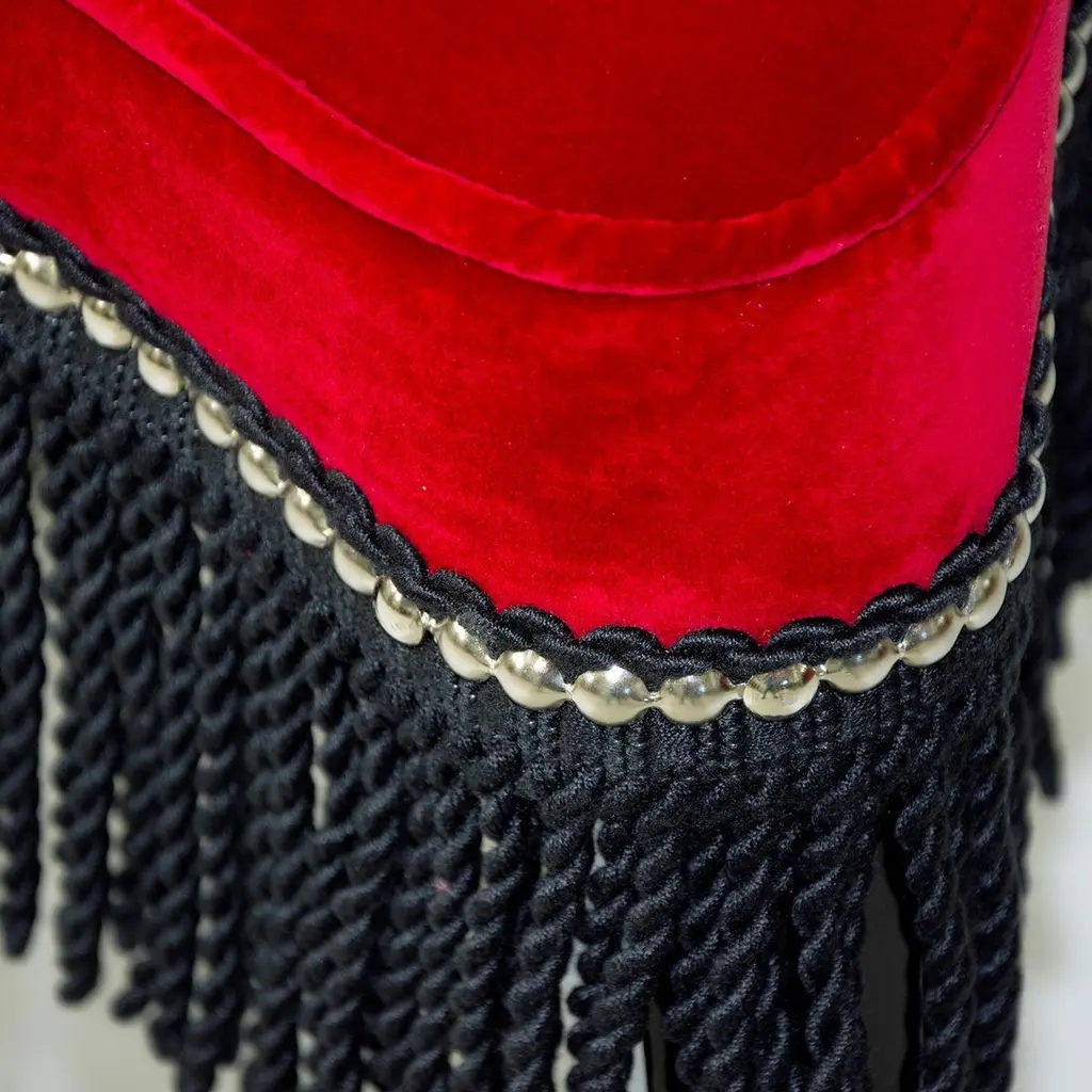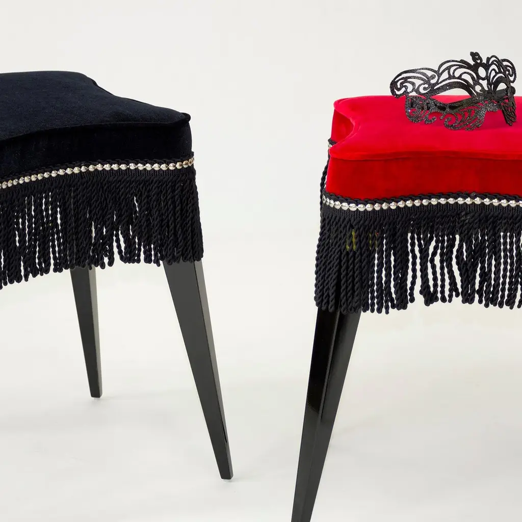 Lovely and eclectic stool with black lacquered wooden legs. The seat is upholstered with red velvet embellished with visible studs and black fringes. The ironic and original design makes this piece of furniture so versatile that it can be combined with different decors and environments.