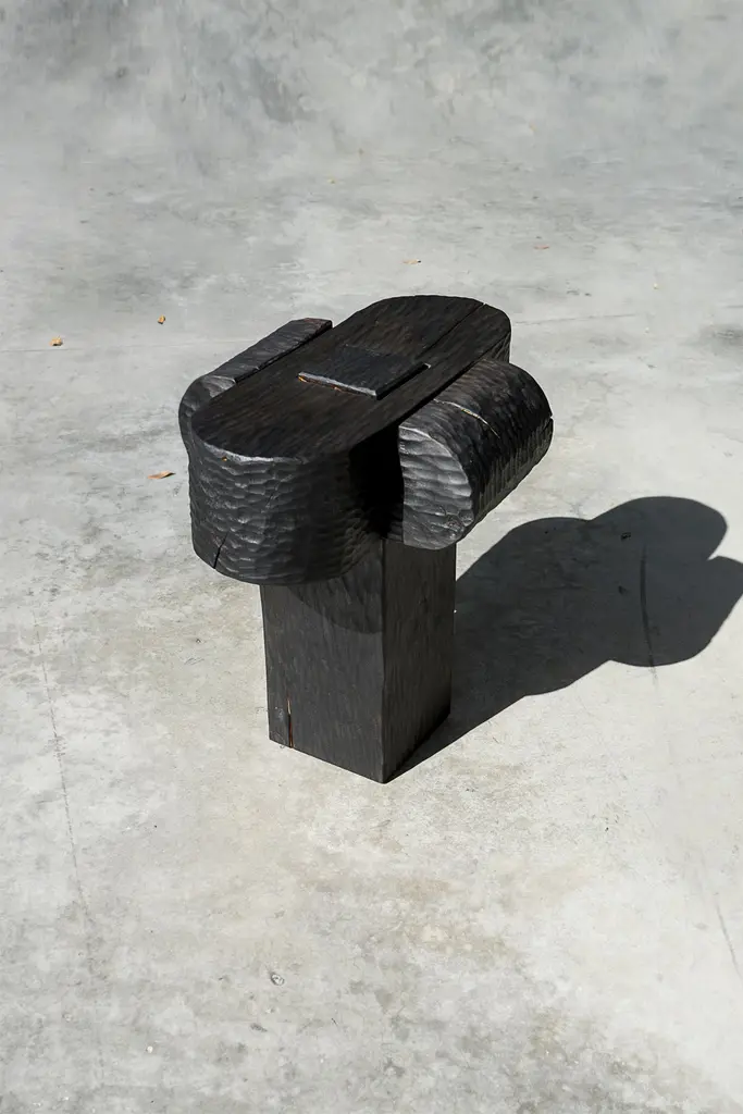 Burnt Black B Tables / Stools by Touch With EyesDimensions: W 30 x D 30 x H 45 cmMaterials: Wood washed out by the sea.Weight: 20 Kg. The black tables were made of wood washed out by the sea, burned by fire and covered with oil and wax. The wood was processed by hands without the use of machines. Moving around Europe in the car in which Touch With Eyes set up their workshop, they guys were able to work "on the fly" in fields and on beaches. The surrounding world with its nature became the main source of inspiration and the basis for work. That is how the idea of taking materials for their projects from the environment sprang up: trees and stumps discarded by the sea, shells on beaches and buoys from fishing nets. All these “treasures” were given a new life, new shape and new function, and the audience got the opportunity to feel the sea and the sun, salt and sand, stones and earth.