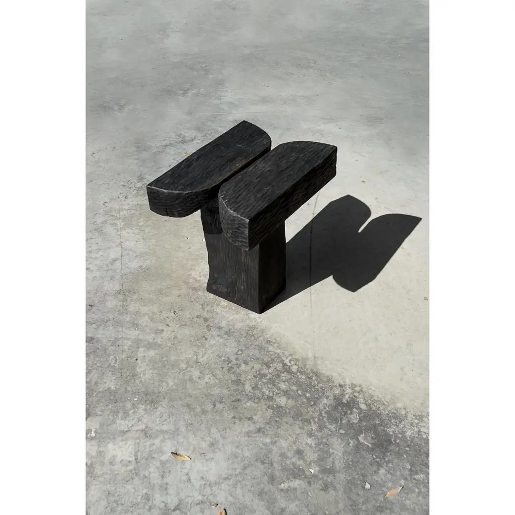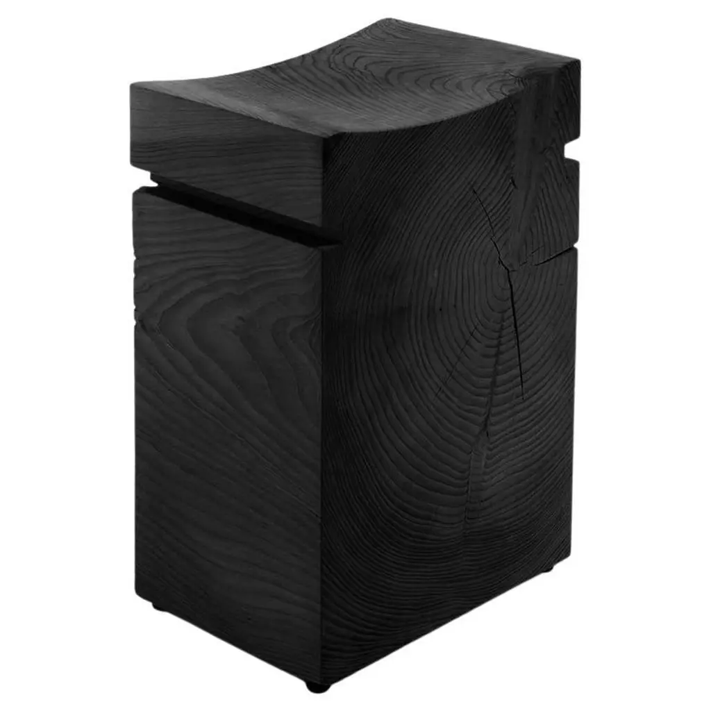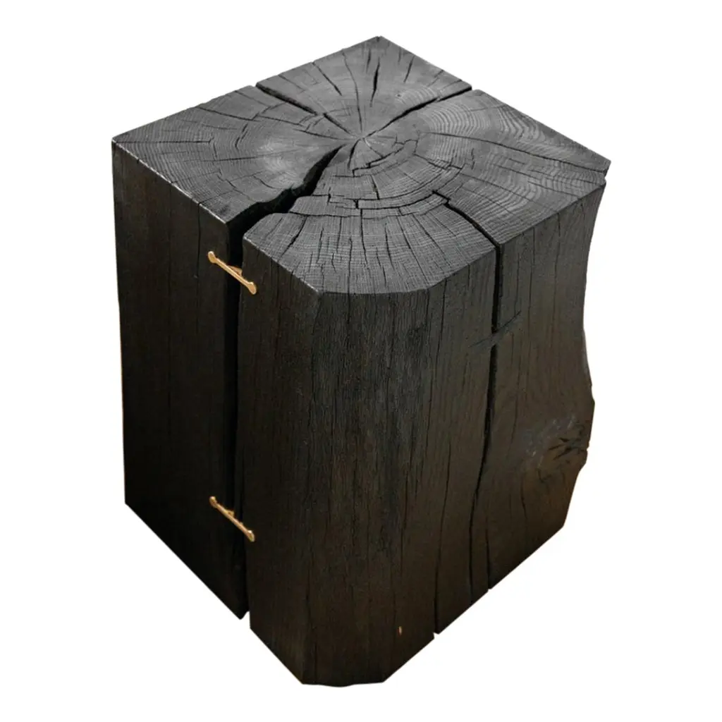 Burnt Black Tables / Stools by Touch With EyesDimensions: W 30 x D 30 x H 45 cmMaterials: Wood washed out by the sea.Weight: 20 Kg. The black tables were made of wood washed out by the sea, burned by fire and covered with oil and wax. The wood was processed by hands without the use of machines. Moving around Europe in the car in which Touch With Eyes set up their workshop, they guys were able to work "on the fly" in fields and on beaches. The surrounding world with its nature became the main source of inspiration and the basis for work. That is how the idea of taking materials for their projects from the environment sprang up: trees and stumps discarded by the sea, shells on beaches and buoys from fishing nets. All these “treasures” were given a new life, new shape and new function, and the audience got the opportunity to feel the sea and the sun, salt and sand, stones and earth.