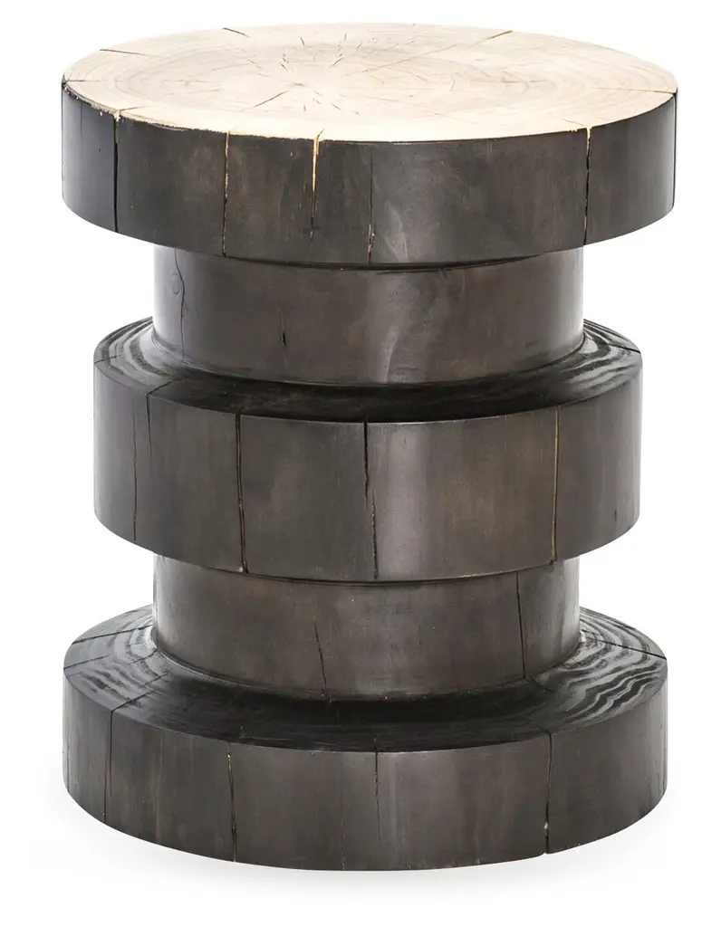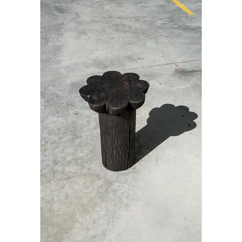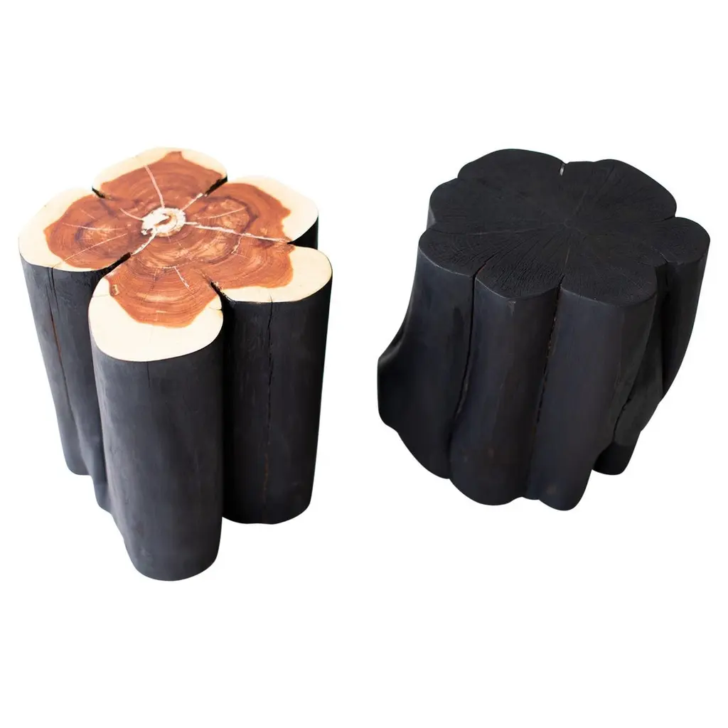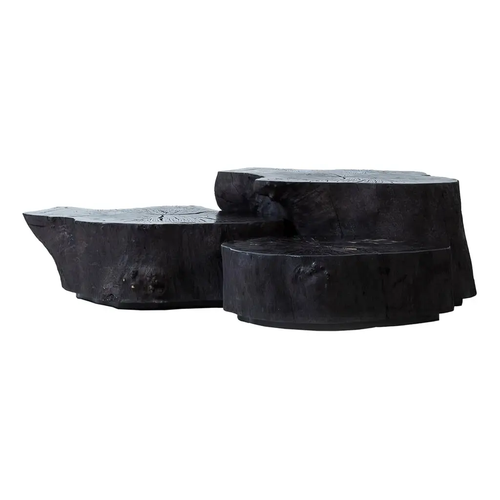 Burnt Black Tables / Stools by Touch With EyesDimensions: W 30 x D 30 x H 45 cmMaterials: Wood washed out by the sea.Weight: 20 Kg. The black tables were made of wood washed out by the sea, burned by fire and covered with oil and wax. The wood was processed by hands without the use of machines. Moving around Europe in the car in which Touch With Eyes set up their workshop, they guys were able to work "on the fly" in fields and on beaches. The surrounding world with its nature became the main source of inspiration and the basis for work. That is how the idea of taking materials for their projects from the environment sprang up: trees and stumps discarded by the sea, shells on beaches and buoys from fishing nets. All these “treasures” were given a new life, new shape and new function, and the audience got the opportunity to feel the sea and the sun, salt and sand, stones and earth.