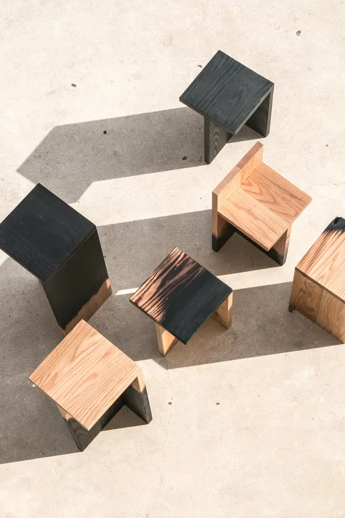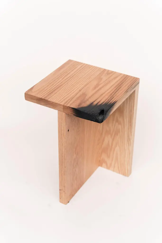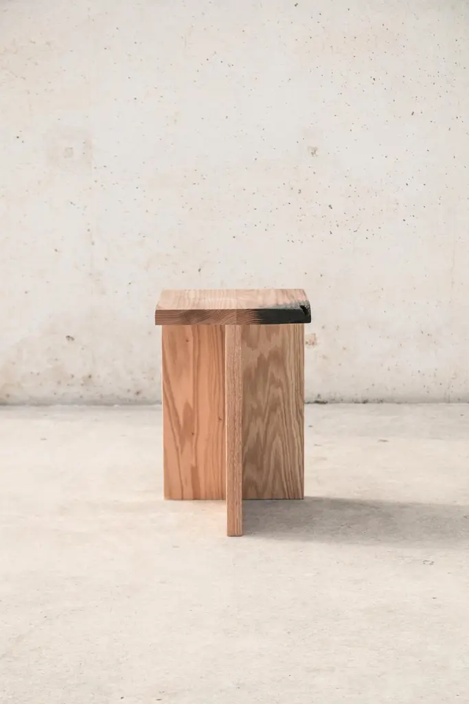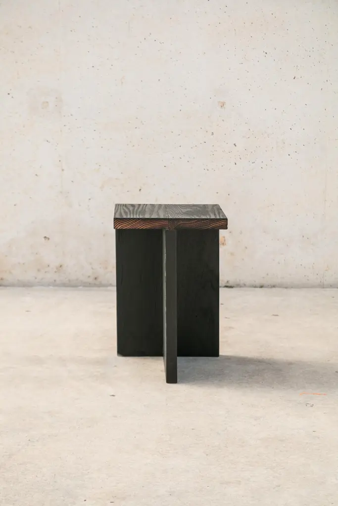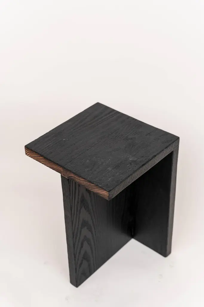 Burnt oak stool by Daniel ElkayamEdition of 3Dimensions: D 30 x W 30 x H 45 cmMaterials: Oak WoodThe Charred CollectionA collection of handmade wooden objects inspired by one of the most powerful natural phenomena in our world, which is out of control. Today the percentage of fires caused by natural causes is significantly lower than those caused by humans.The huge fires quickly deplete the forests, leaving behind a particularly surrealistic view of a burnt, black piece of nature.Out of interest in this show was created the desire to preserve the unique aesthetics of the burnt wood and to express in objects the feelings and questions it raises as a raw material in itself.The same scorched aesthetic combined with everyday objects, on the one hand, serves as a mirror for the consequences of the situation we have created and as a means of dealing with its ecological results, and on the other hand, as a visual echo of fire intensity and aesthetic effects.Daniel Elkayam — Designer Jerusalem-born Art-designer and Photographer based in Tel-Aviv. Operating in the field of sustainable home decor and specializing in conceptual design, material exploring, and story-telling through objects.Graduated in 2019 his Bachelor's studies at the Industrial design department at Bezalel Academy of Arts and Design, Jerusalem. A former member of the Bezalel Alumni Design Incubator 2020. Won the excellent scholarship of America-Israel cultural foundation of 2019Inspired by nature and its phenomenons, the artist transforms natural materials and aesthetics into one-of-a-kind unique objects.In his works, Daniel implements his curiosity and yearning for unrefined aesthetics, and by material transformation and unique techniques he is developing in his studio, he shows how unattractive materials can be not only valid but luxurious.Elkayam examines the range between art and design by taking things in and out of their context, creating hybrids between different worlds of content, intervening in natural processes, while leaving a gap for the unexpected, the unknown.He expresses his inner world and illustrates his ideas by creating objects and experiences.Through his perspective of materiality, and empathetic vision of his surroundings, he developed an intuitive way of creation with experimental materials such as algae, corrosion, charcoal, and more. Every collection of objects expresses different material research and follows curious narratives and a variety of topics such as locality, transience, and decay of materials.