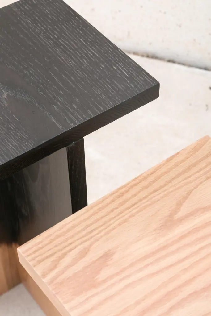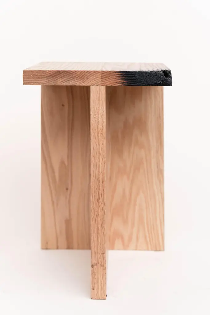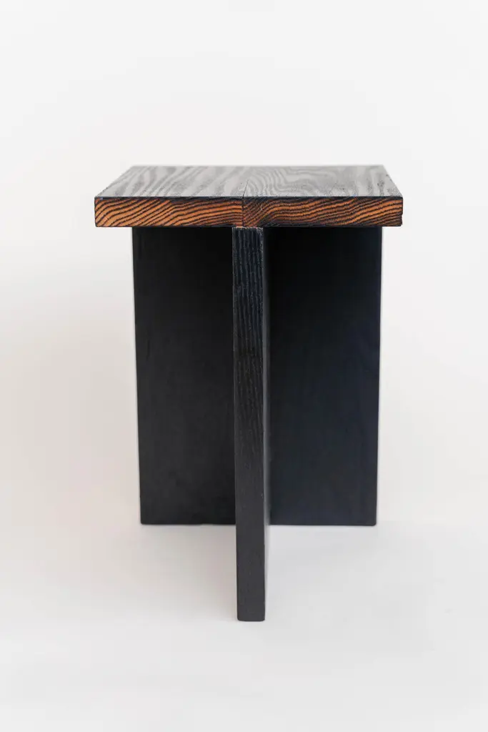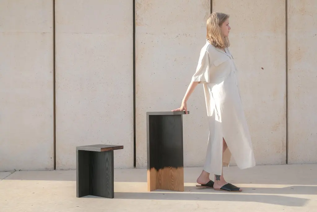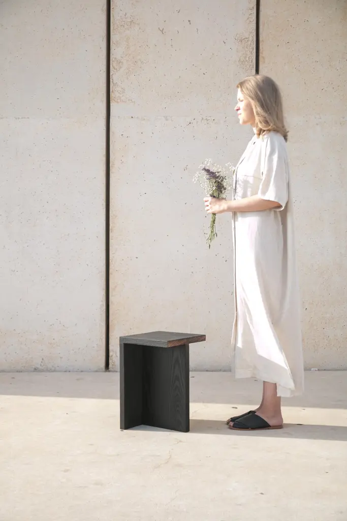 Burnt oak stool by Daniel ElkayamEdition of 3Dimensions: D 30 x W 30 x H 45 cmMaterials: Oak WoodThe Charred CollectionA collection of handmade wooden objects inspired by one of the most powerful natural phenomena in our world, which is out of control. Today the percentage of fires caused by natural causes is significantly lower than those caused by humans.The huge fires quickly deplete the forests, leaving behind a particularly surrealistic view of a burnt, black piece of nature.Out of interest in this show was created the desire to preserve the unique aesthetics of the burnt wood and to express in objects the feelings and questions it raises as a raw material in itself.The same scorched aesthetic combined with everyday objects, on the one hand, serves as a mirror for the consequences of the situation we have created and as a means of dealing with its ecological results, and on the other hand, as a visual echo of fire intensity and aesthetic effects.Daniel Elkayam — Designer Jerusalem-born Art-designer and Photographer based in Tel-Aviv. Operating in the field of sustainable home decor and specializing in conceptual design, material exploring, and story-telling through objects.Graduated in 2019 his Bachelor's studies at the Industrial design department at Bezalel Academy of Arts and Design, Jerusalem. A former member of the Bezalel Alumni Design Incubator 2020. Won the excellent scholarship of America-Israel cultural foundation of 2019Inspired by nature and its phenomenons, the artist transforms natural materials and aesthetics into one-of-a-kind unique objects.In his works, Daniel implements his curiosity and yearning for unrefined aesthetics, and by material transformation and unique techniques he is developing in his studio, he shows how unattractive materials can be not only valid but luxurious.Elkayam examines the range between art and design by taking things in and out of their context, creating hybrids between different worlds of content, intervening in natural processes, while leaving a gap for the unexpected, the unknown.He expresses his inner world and illustrates his ideas by creating objects and experiences.Through his perspective of materiality, and empathetic vision of his surroundings, he developed an intuitive way of creation with experimental materials such as algae, corrosion, charcoal, and more. Every collection of objects expresses different material research and follows curious narratives and a variety of topics such as locality, transience, and decay of materials.