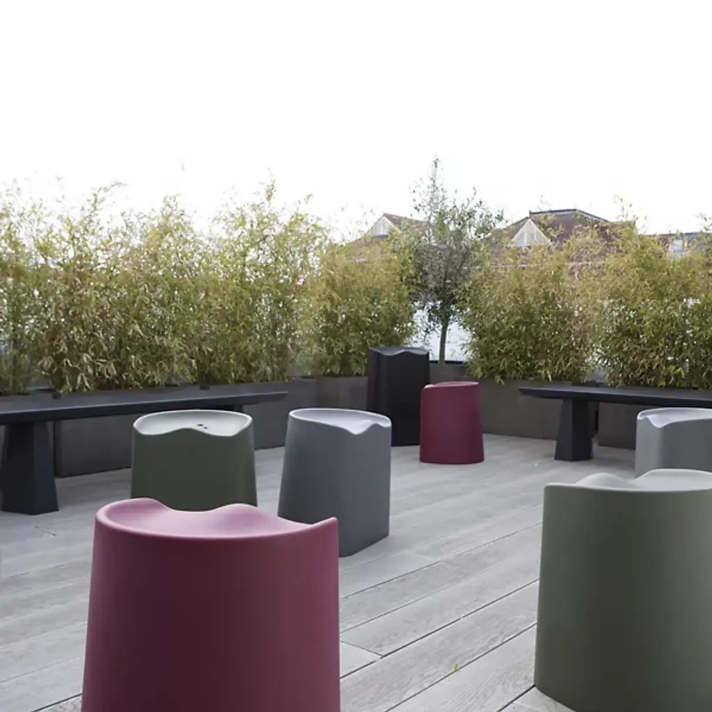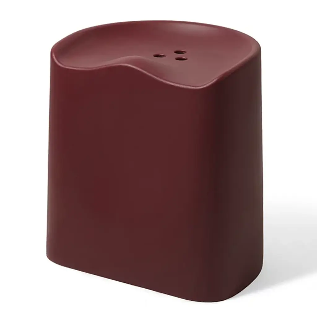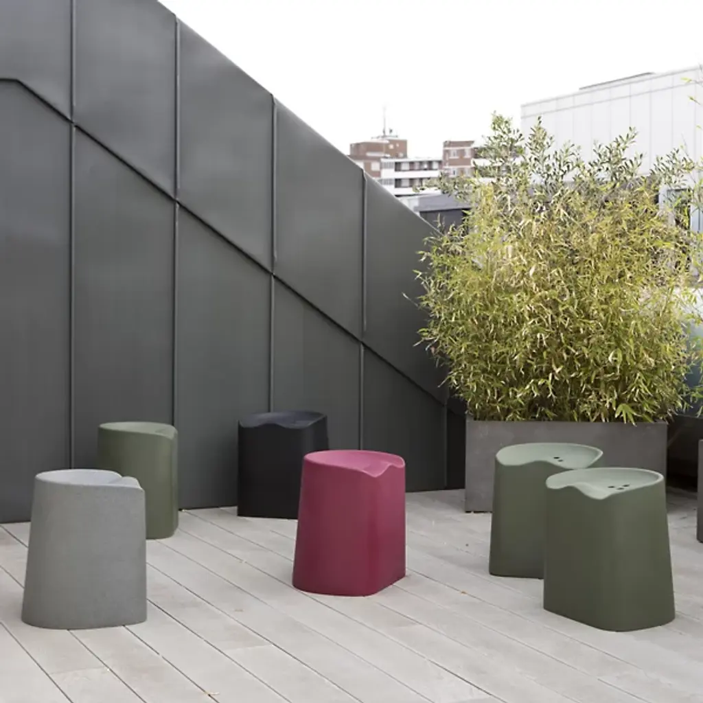 The Butt Stool from Established and Sons is a mono-material design crafted from fully recyclable, UV-stable plastic originally developed for marine applications. Durable and versatile, it's perfect for both indoor and outdoor use. Its stackable form includes three lifting holes, playfully reminiscent of a bowling ball. This updated edition features a reduced stacking height for improved storage efficiency, combining practicality with a bold, modern aesthetic ideal for a variety of spaces.