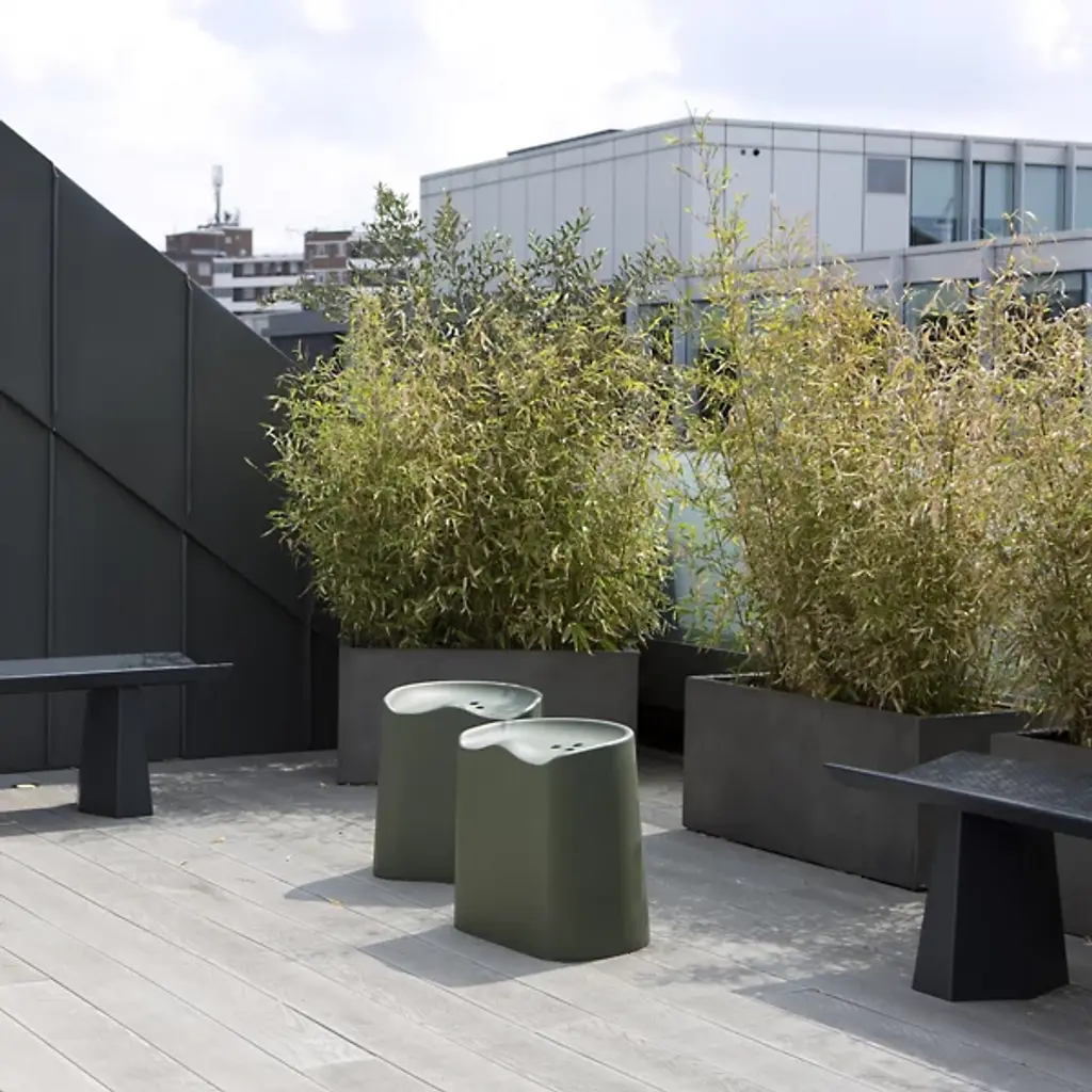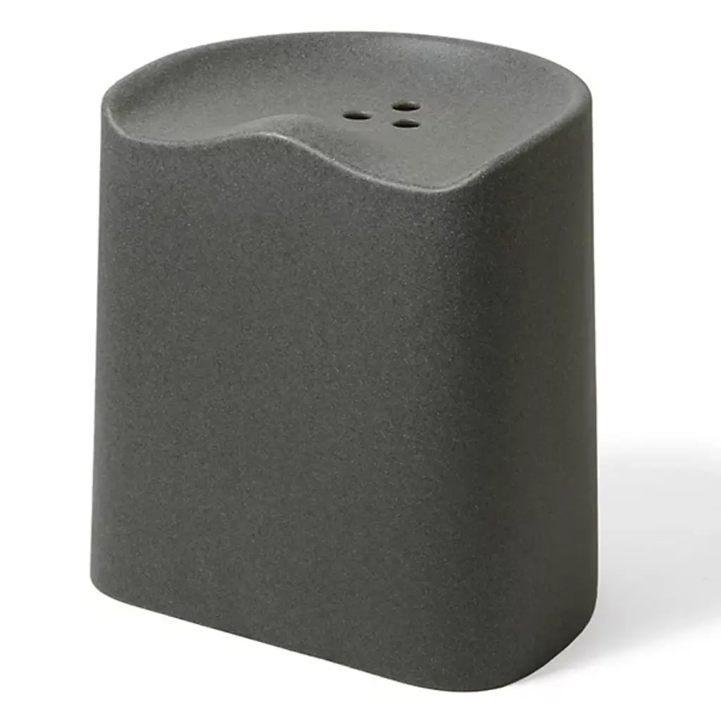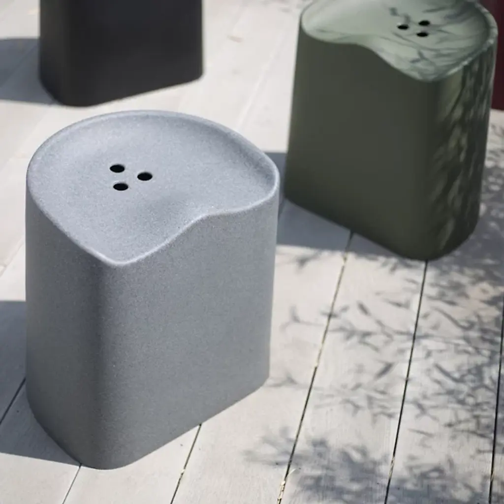 The Butt Stool from Established and Sons is a mono-material design crafted from fully recyclable, UV-stable plastic originally developed for marine applications. Durable and versatile, it's perfect for both indoor and outdoor use. Its stackable form includes three lifting holes, playfully reminiscent of a bowling ball. This updated edition features a reduced stacking height for improved storage efficiency, combining practicality with a bold, modern aesthetic ideal for a variety of spaces.