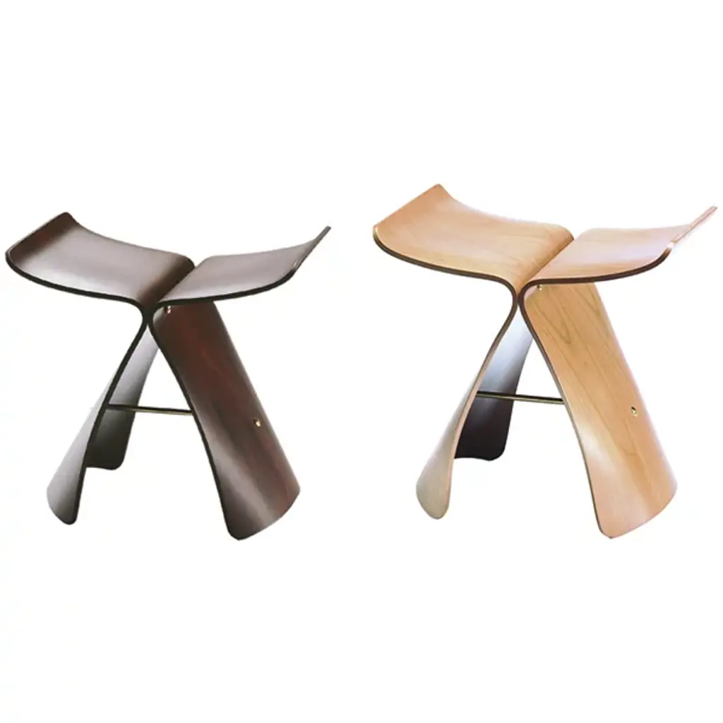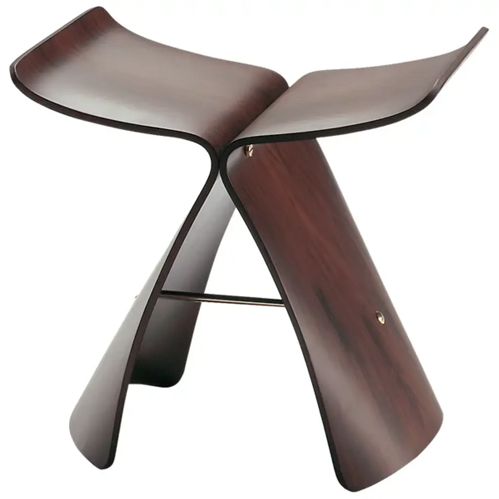 The Vitra Butterfly Stool was originally designed by Sori Yanagi in 1954, with Eastern shapes formed via the plywood bending methods employed by Ray and Charles Eames. The resulting gentle curves are evocative of a butterfly's fluttering wings. Available in Maple or Rosewood plywood, both with brass fittings.