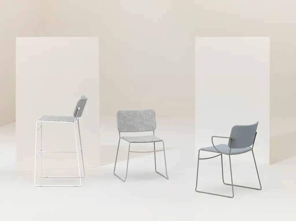 Button Down 7C24 is a high sled-base stool with a steel frame and upholstered seat/backrest.Button Down is a collection defined by the distinctive button-like joint between the frame and backrest—a detail that inspired the name, echoing the timeless elegance of the classic button-down shirt.The slender steel rod frame supports either upholstered or wooden beech or ash seats and backrests, making this a versatile chair well-suited to a variety of contract settings.