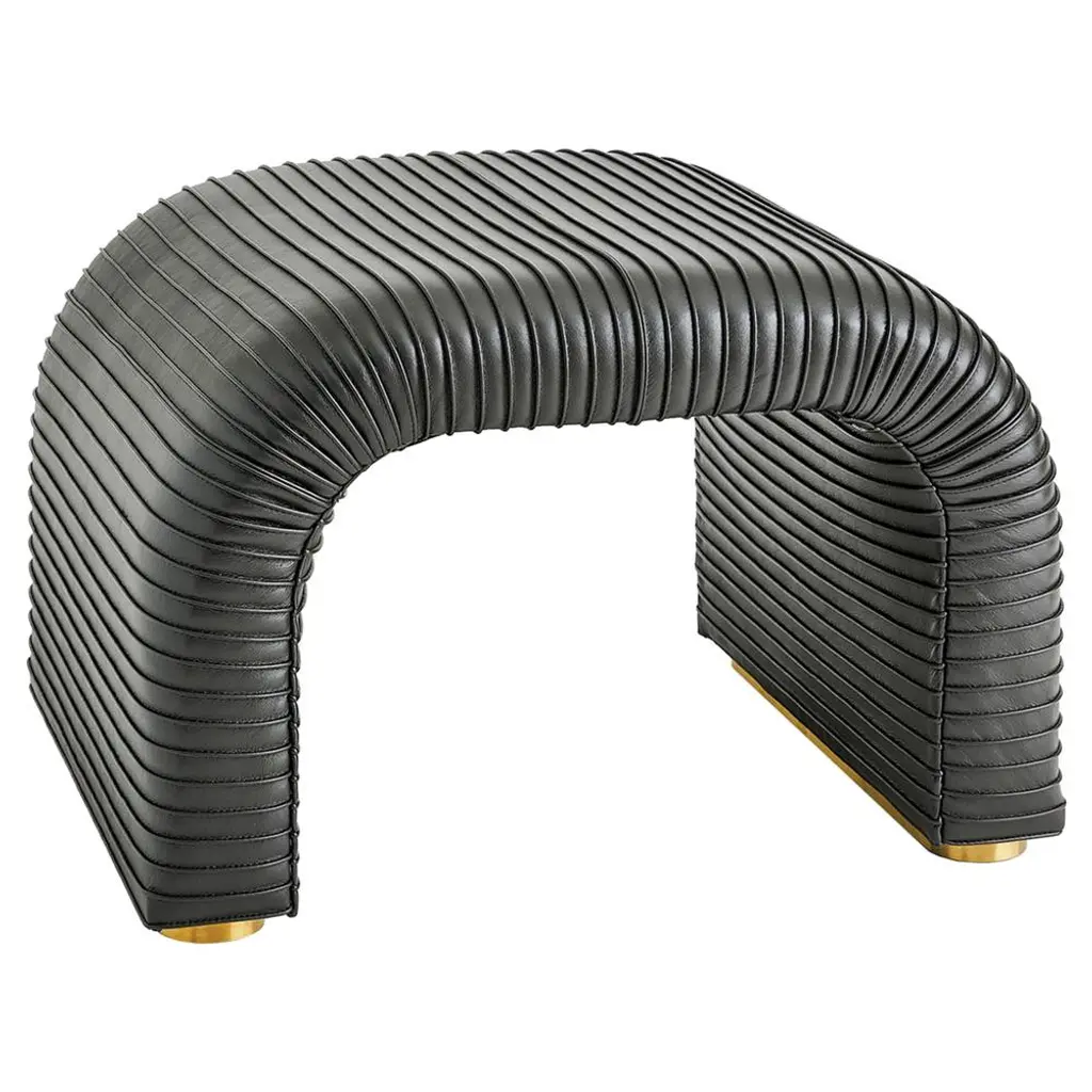 This chic stool lends an elegant look with its modern, curved form covered in pleated leather upholstery. Two satin brass feet elevate its tasteful design, creating a glamorous, sleek addition. Pair with a desk, chair, or daybed for a sophisticated touch.