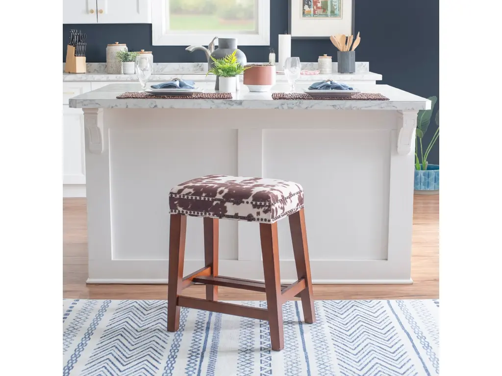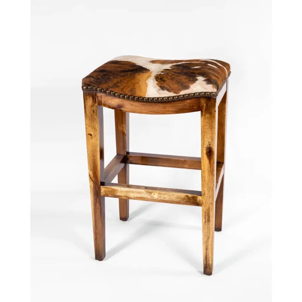 Echoing the design of antique English barstools, ours is crafted with thick, splayed legs, comfortable footrests and oversized nailheads around the cushioned top. Perfect as bar seating or a small accent table, it features a genuine hair-on-hide top pieced together with saddle stitching. As every hide is unique, subtle variations in color and texture give each its own character.