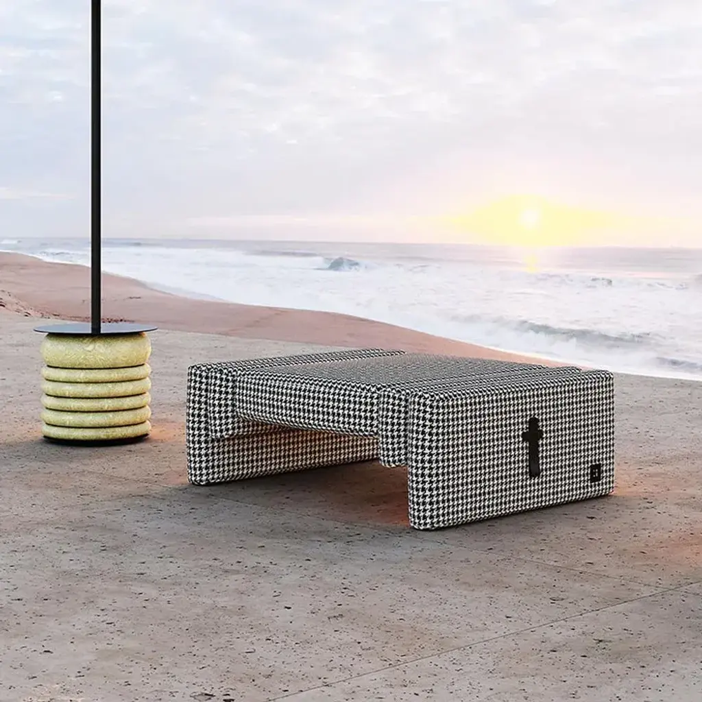 Lisola Stool Retro is a modern outdoor seating piece. A contemporary outdoor stool is delightfully casual with delicate lines and chic curves. This stool is a beautiful and versatile outdoor seating for an outdoor living space with luxurious flair. MATERIALS: Upholstered in Patterned Fabric; Details in Black Leather.