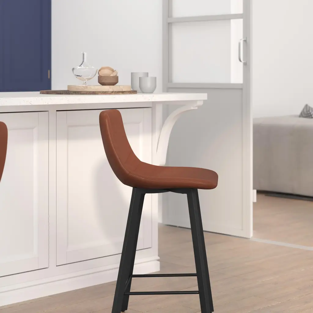 Refresh the seating in your restaurant, pub, or kitchen with this set of 2 modern commercial grade armless stools available in bar or counter height in 4 colors. Soft and durable upholstery paired with matte finish iron frames capture the modern aesthetic in your home or business. The contoured low back and bucket style seat give supportive comfort. Designed to hold up to the rigors of the hospitality industry as well as your household, these comfortable stools are a must have in any environment. The strong and sturdy iron base features built-in bracing that doubles as a footrest and accommodates up to 300 lbs. static weight. Included tools and step-by-step illustrated instructions make for quick and easy assembly and adjustable floor glides prevent damage to hard indoor flooring surfaces. Cleanup is easily done with a dry cloth to maintain the appearance of your new seating.
