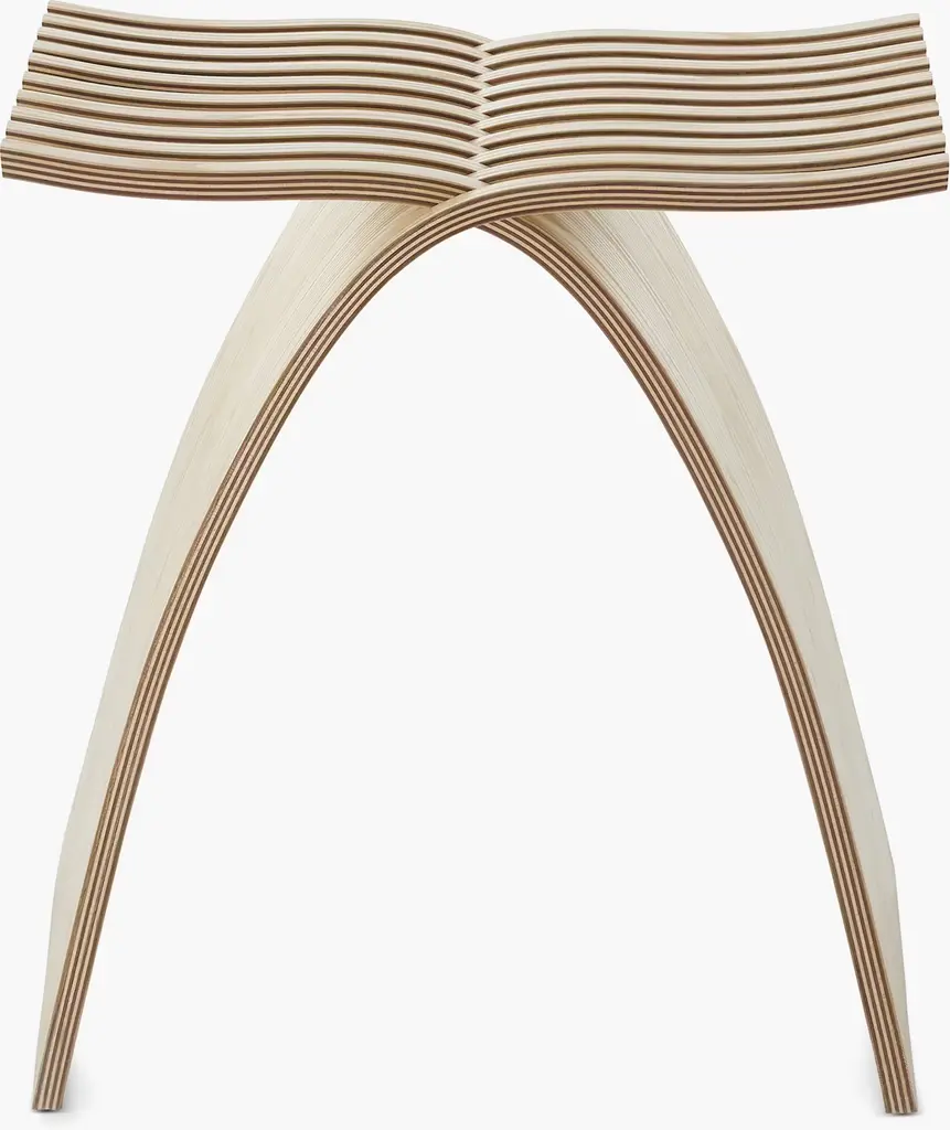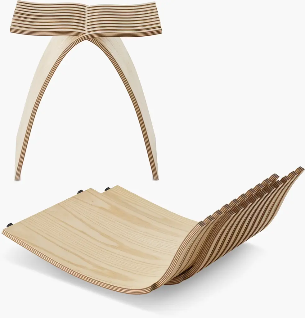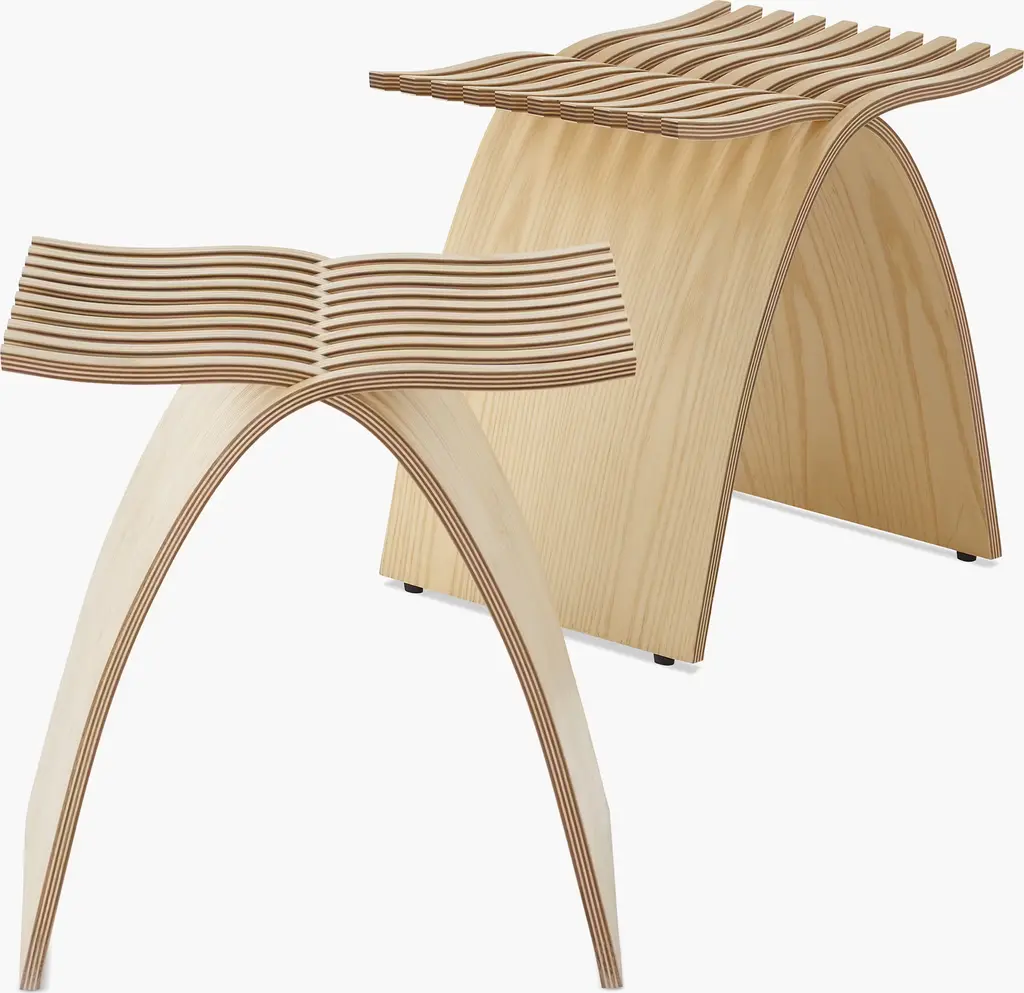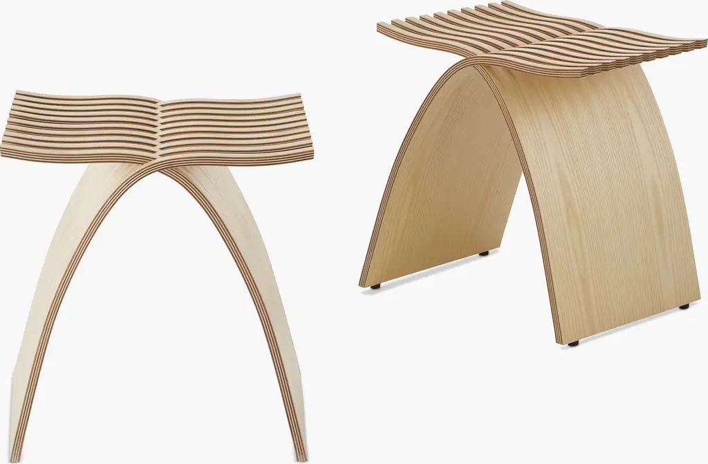 The Capelli Stool (2002) was inspired by Carol Catalano's folded hands, featuring two identical molded plywood halves with undulating fingers that interlock without tools or fasteners. As the halves meet, the fingers become stops that hold each half of the stool firmly in place to create an ingeniously stable and remarkably strong structure. When not in use, pull the halves apart and stack for easy storage.