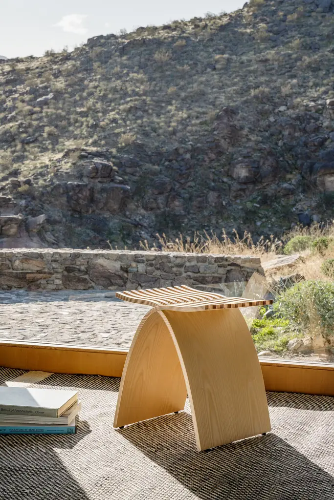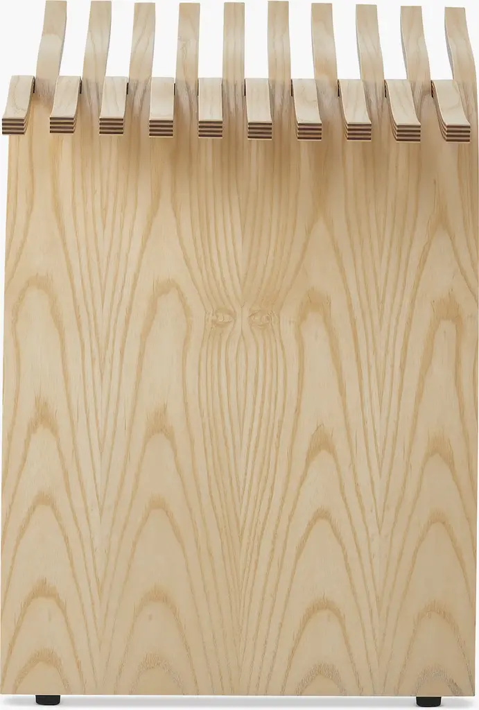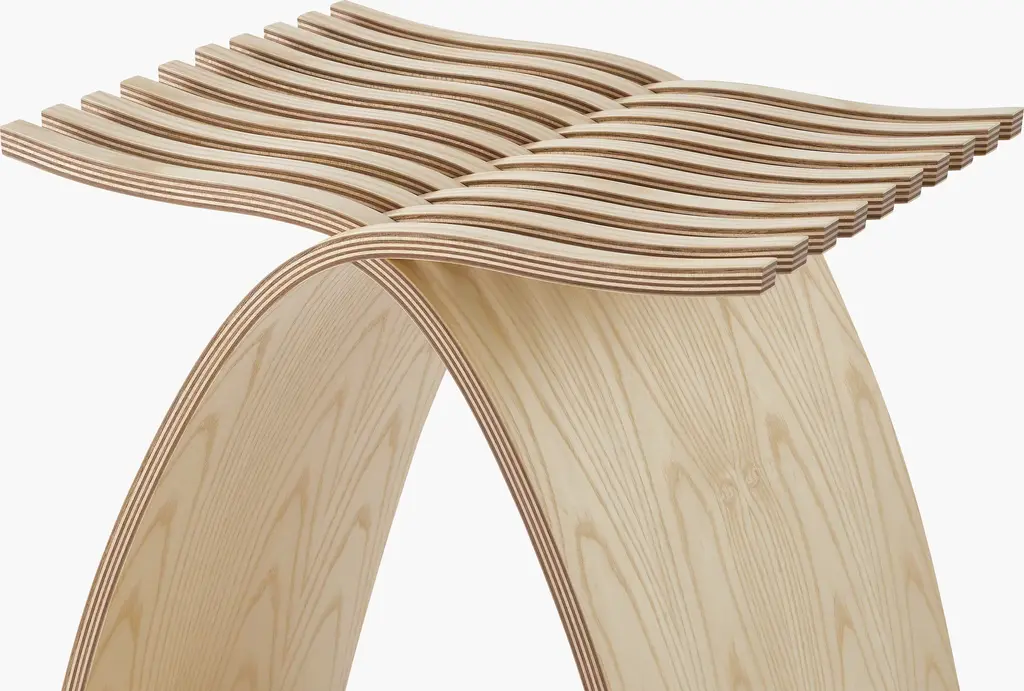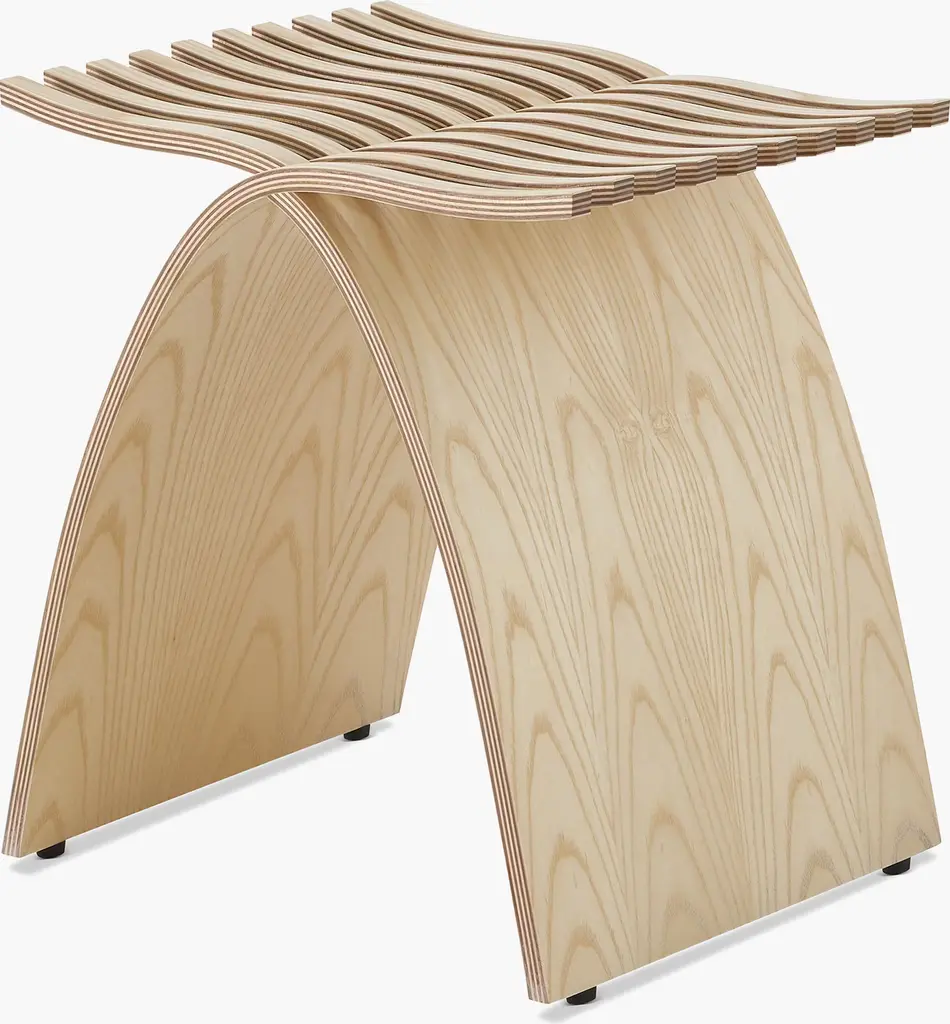 The Capelli Stool (2002) was inspired by Carol Catalano's folded hands, featuring two identical molded plywood halves with undulating fingers that interlock without tools or fasteners. As the halves meet, the fingers become stops that hold each half of the stool firmly in place to create an ingeniously stable and remarkably strong structure. When not in use, pull the halves apart and stack for easy storage.