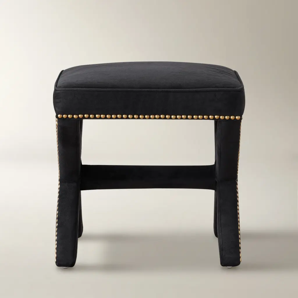 Framed in kiln-dried hardwood, our Carly stool adds a sleek, modern feel to any space with its neatly tailored upholstery and X-base silhouette outlined in gleaming nailhead trim. A foam-and-fiber-filled seat cushion ensures long-lasting comfort. Shown in Bella Velvet Black with golden nailheads.Z Gallerie exclusiveCustomize it! Available in over 15 fabrics.Custom Orders: Custom Furniture is manufactured especially for you, which is why we do not accept cancellations, exchanges, or returns.