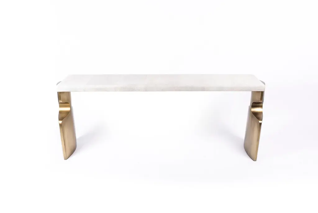 The Paris based label has distinguished themselves since their launch, with their iconic use of shagreen mixed with brass and other exotic materials. All furniture is handcrafted by skilled artisans, ultimately making each piece unique, designed in Paris and produced in the Philippines.The Carmen stool is a stunning seating piece. The cream shagreen inlaid top sits on a pair of sculptural bronze-patina brass legs that frame the piece. Custom color/sizing available on request. A bench version is also available, image at end of slide. The finish of the shagreen is authentic as it is hand-dyed and the designer calls the finish look: "antique natural shagreen."The dimensions of this piece are 58 x 35 x 55 cm / 22.75 x 11.75 x 21"All R&Y Augousti pieces are handmade by artisans, ultimately making each piece unique. Wipe clean with soft dry cloth.Acclaimed design duo Ria & Yiouri Augousti have established themselves since the 1990s as pioneers of modern-vintage style through their luxurious Art Deco inspired collections.The Paris based label has distinguished themselves since their launch, with their iconic use of shagreen mixed with brass and other exotic materials. All furniture is handcrafted by skilled artisans, ultimately making each piece unique. All shagreen-covered items should be kept out of direct sunlight, color variants may occur on the stingray and other exotic finishes, but this showcases the Parisian label's commitment to creating authentic luxurious products using natural components.