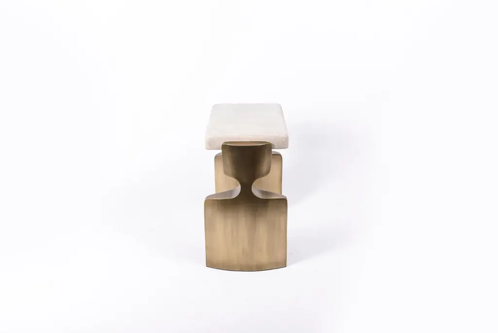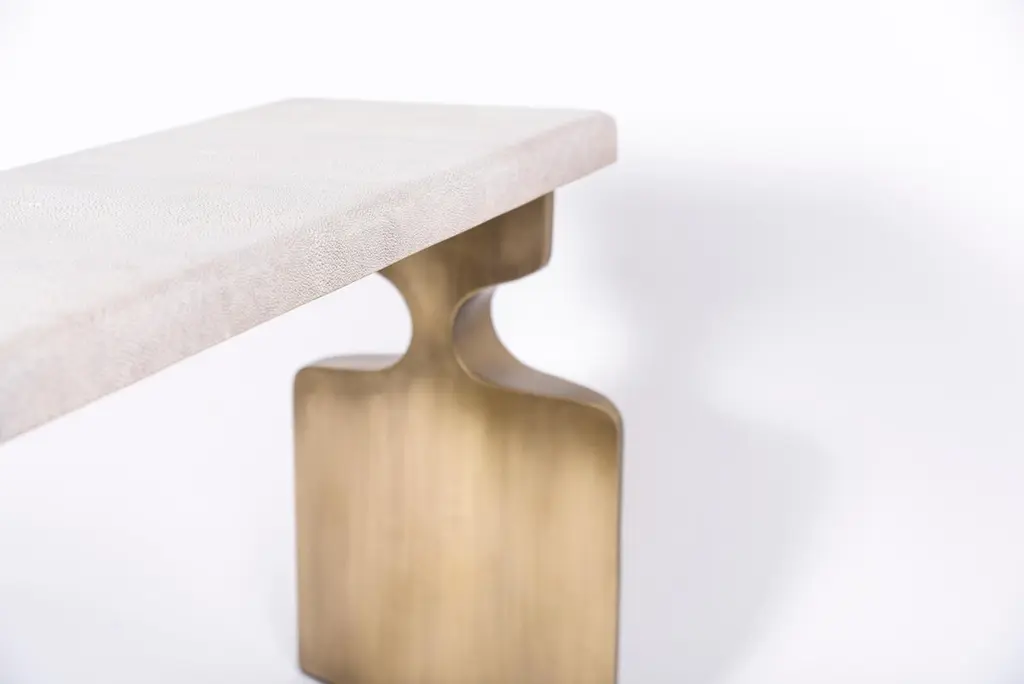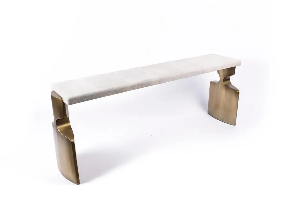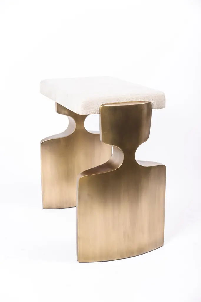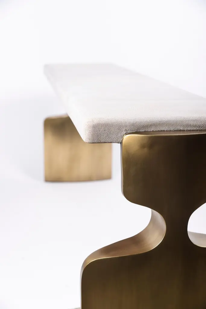 The Paris based label has distinguished themselves since their launch, with their iconic use of shagreen mixed with brass and other exotic materials. All furniture is handcrafted by skilled artisans, ultimately making each piece unique, designed in Paris and produced in the Philippines.The Carmen stool is a stunning seating piece. The cream shagreen inlaid top sits on a pair of sculptural bronze-patina brass legs that frame the piece. Custom color/sizing available on request. A bench version is also available, image at end of slide. The finish of the shagreen is authentic as it is hand-dyed and the designer calls the finish look: "antique natural shagreen."The dimensions of this piece are 58 x 35 x 55 cm / 22.75 x 11.75 x 21"All R&Y Augousti pieces are handmade by artisans, ultimately making each piece unique. Wipe clean with soft dry cloth.Acclaimed design duo Ria & Yiouri Augousti have established themselves since the 1990s as pioneers of modern-vintage style through their luxurious Art Deco inspired collections.The Paris based label has distinguished themselves since their launch, with their iconic use of shagreen mixed with brass and other exotic materials. All furniture is handcrafted by skilled artisans, ultimately making each piece unique. All shagreen-covered items should be kept out of direct sunlight, color variants may occur on the stingray and other exotic finishes, but this showcases the Parisian label's commitment to creating authentic luxurious products using natural components.