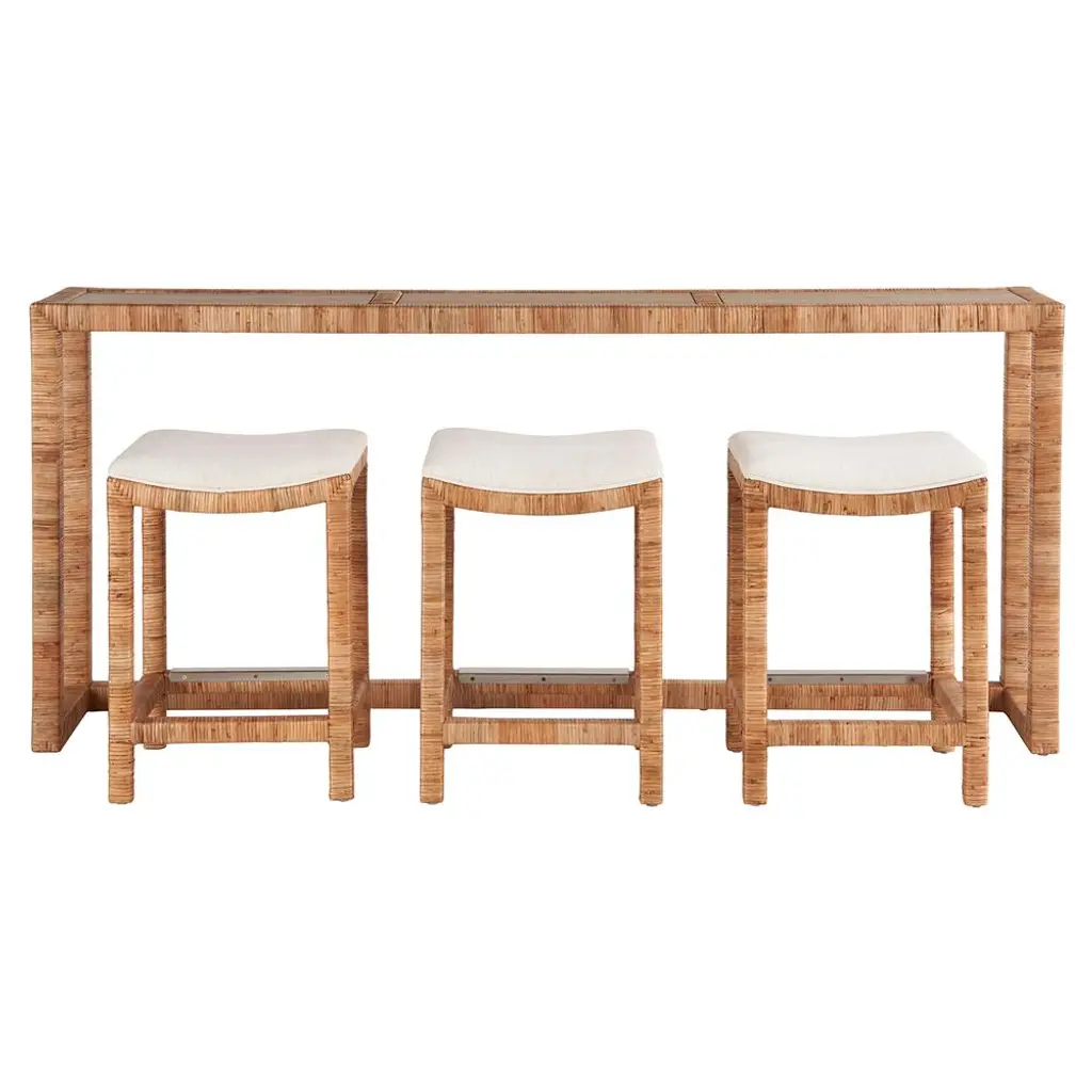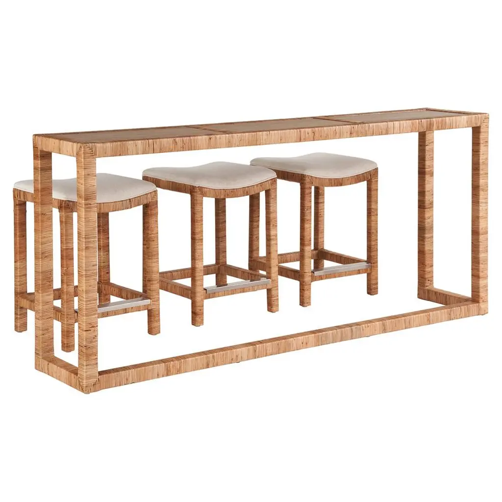 Carter Coastal Brown Travertine Top Natural Rattan Console Table With Stools