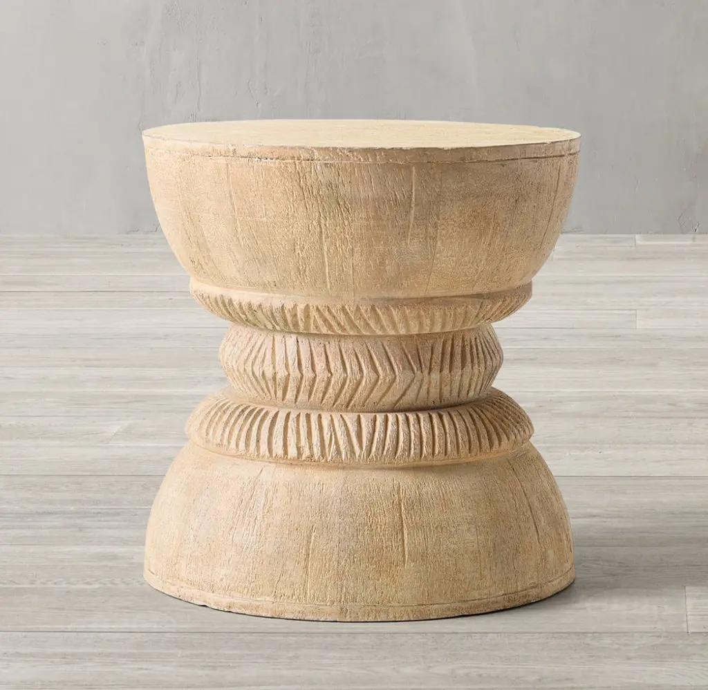 Inspired by an antique Indian grain grinder, our reproduction reimagines the rustic vessel as a decorative stool. The traditional design creates a distinctive silhouette, while the natural finish evokes the organic feel and patina of the original.