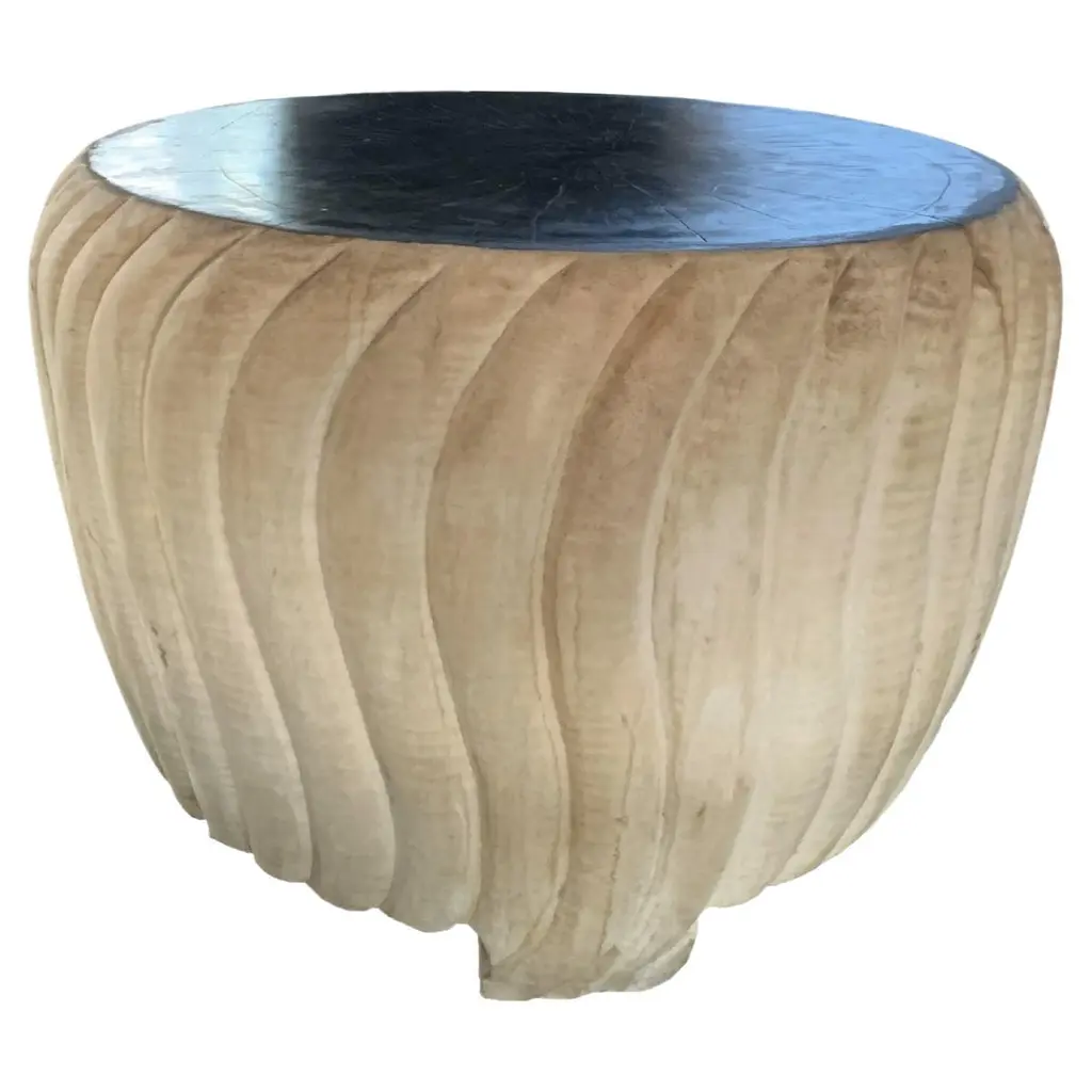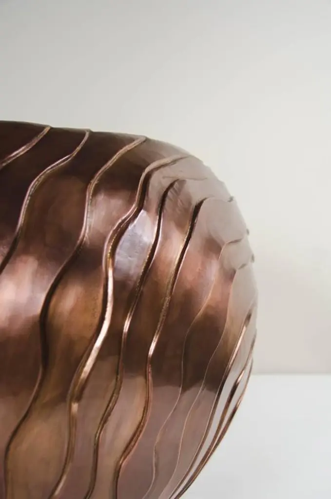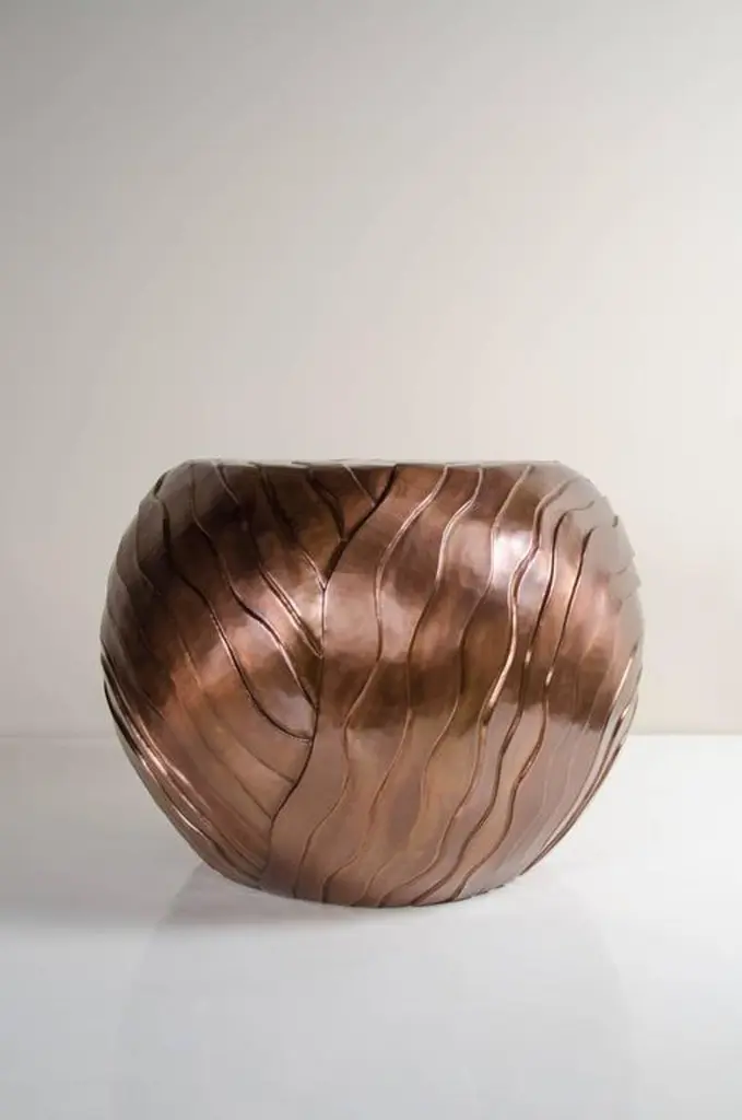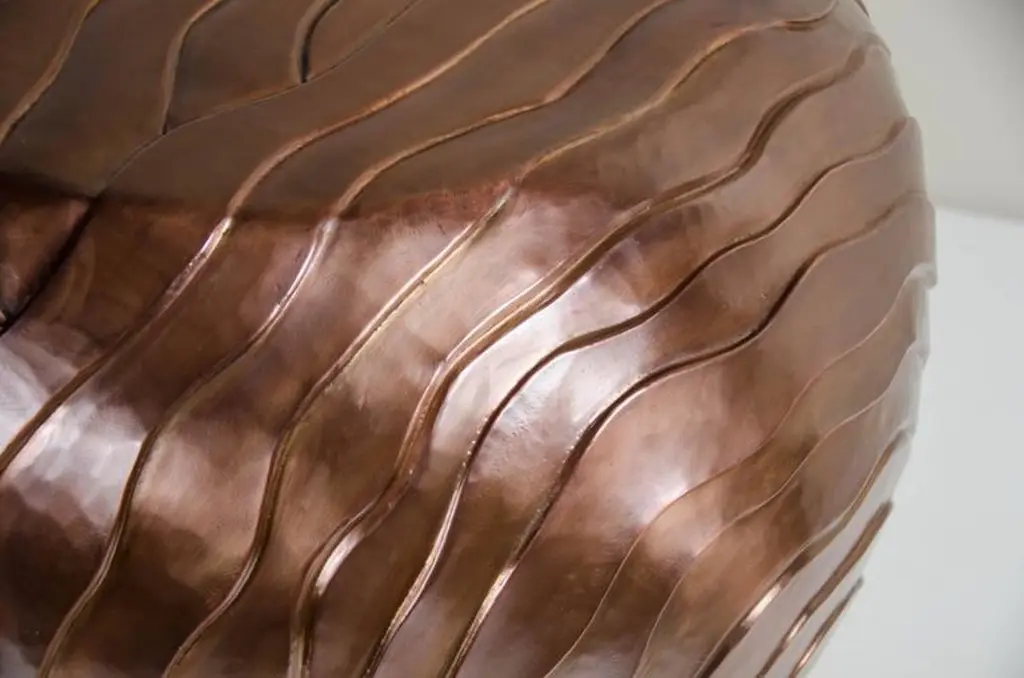 Cascade Design low drum stool.Antique copper.Hand repoussé.Limited edition.Customizable. Repoussé is the traditional art of hand-hammering decorative relief onto sheet metal. The technique originated around 800 BC between Asia and Europe and in Chinese historical context, it began early as the Han dynasty (206BC-AD220). The technique involves using a hammer and various shaping tools.