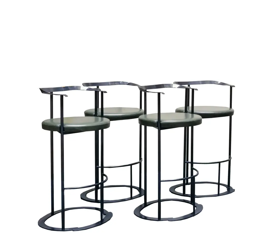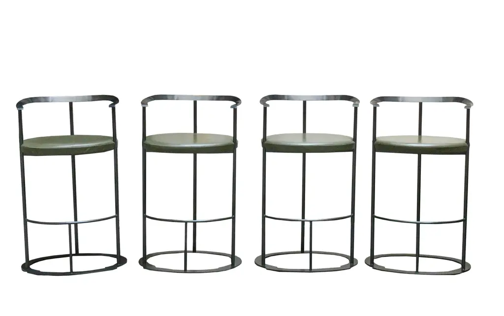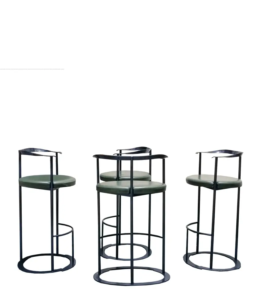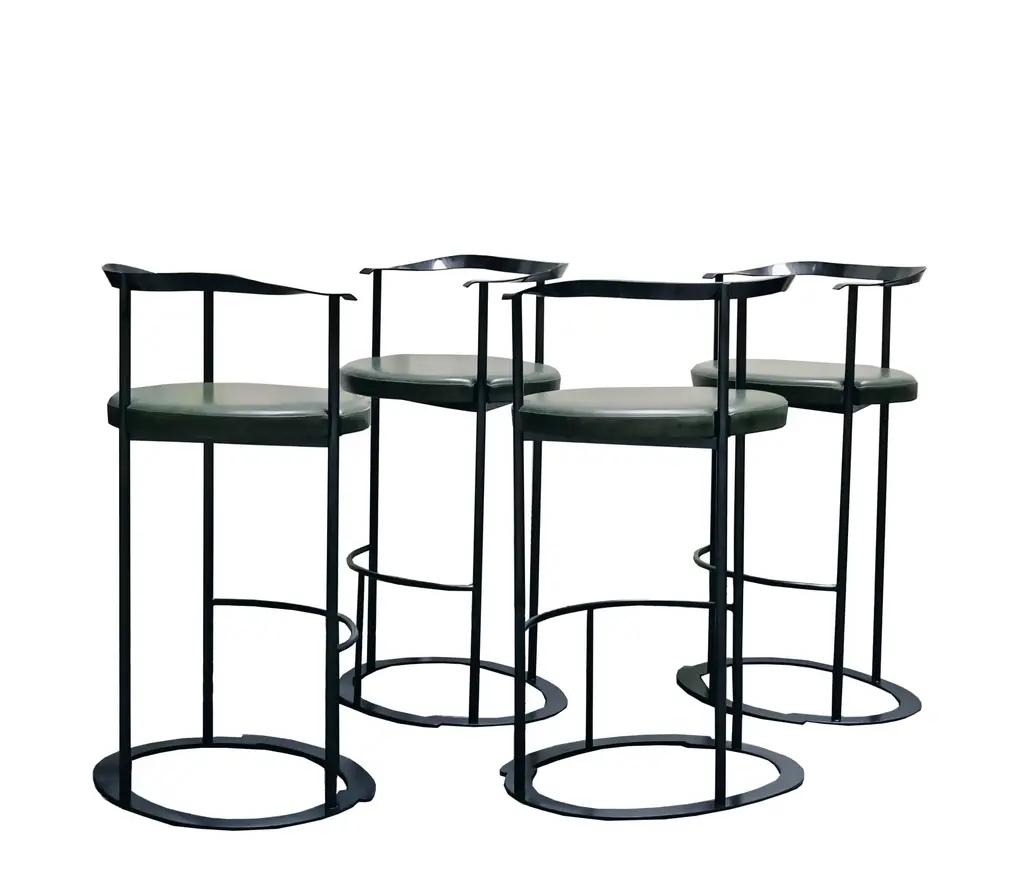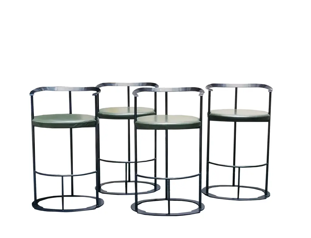 Four Catilina stools with painted steel frame, plywood seat and polyurethane cushions padded and upholstered in green Claudio Valtorta leather. This iconic seat was designed by Luigi Caccia Dominioni and produced by Azucena since 1958. Luigi Caccia Dominioni presented this seat for the first time at the XI Triennale di Milano in 1957 and from that moment Catilina became one of Luigi Caccia Dominioni's classics. Azucena brand under the base This piece has an attribution mark, I am sure that it is completely authentic and take full responsibility for any authenticity issues arising from misattribution