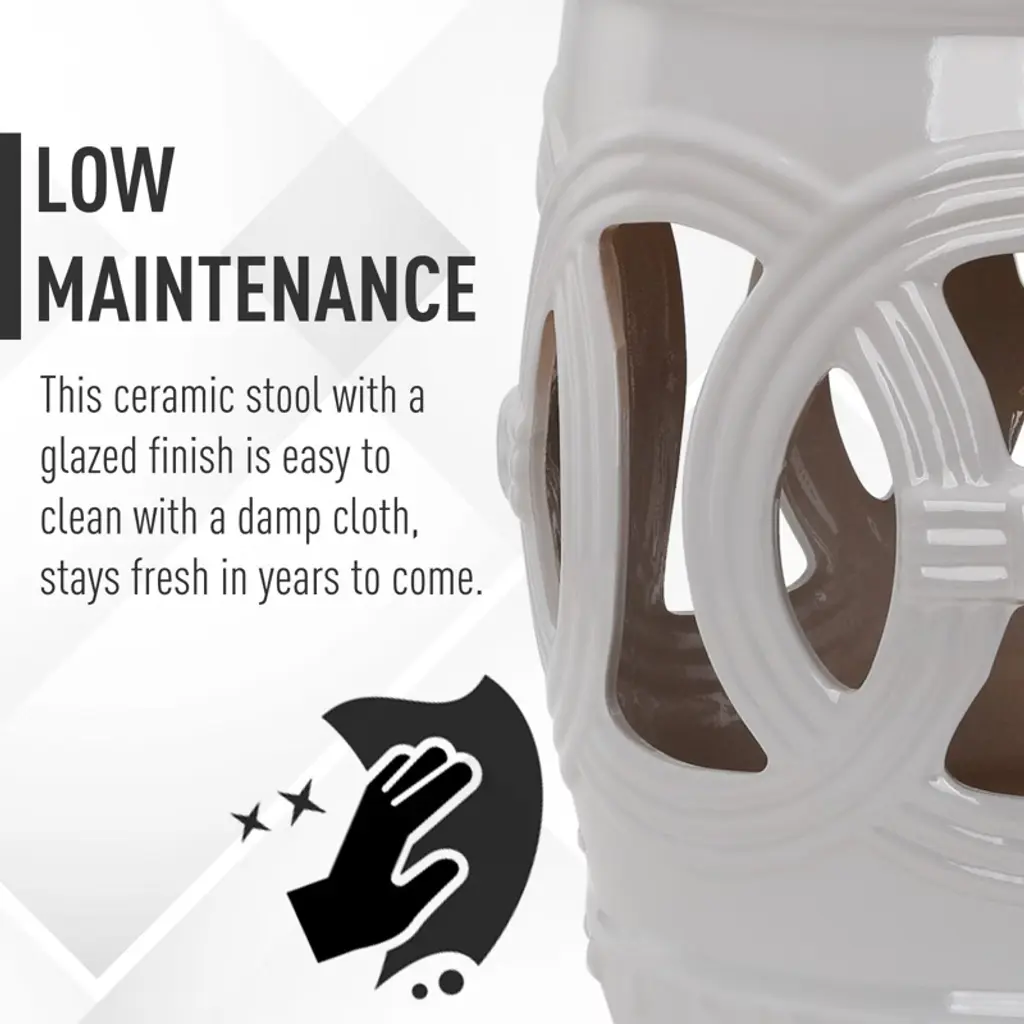 Add elegant charm to your outdoor space with this 14-inchx17-inch ceramic garden stool featuring a distinctive double coin knot design. This versatile piece serves as both a decorative patio table and functional outdoor side table, perfect for gardens, decks or poolside areas. The sturdy glass-reinforced ceramic construction ensures durability while adding artistic flair to your outdoor decor.