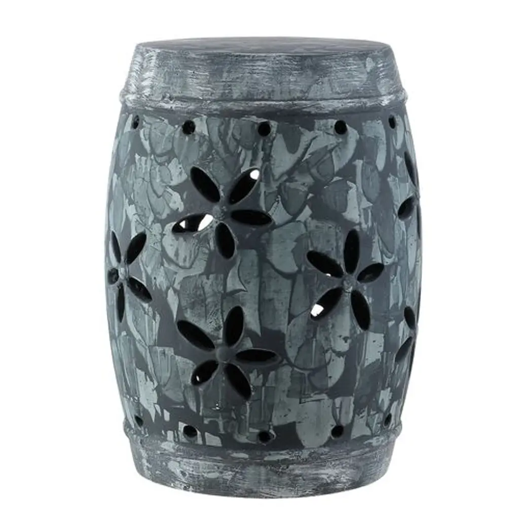 Floral cutouts bring a dash of whimsy to this garden stool's sophisticated gray tones. Suitable for outdoor as well as indoor use, the stool can serve as an occasional table or as a seat.